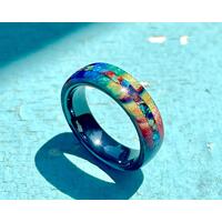 These very unique rings are made from Alumilite that contains real diamond dust reclaimed from diamond cutters. Colors are achieved using a combination of mica powder and liquid dyes. Each ring is unique and will differ slightly from the images shown. The ring is hand-polished using many varying grits of micro-mesh sandpaper and buffed for superior shine and sparkle.