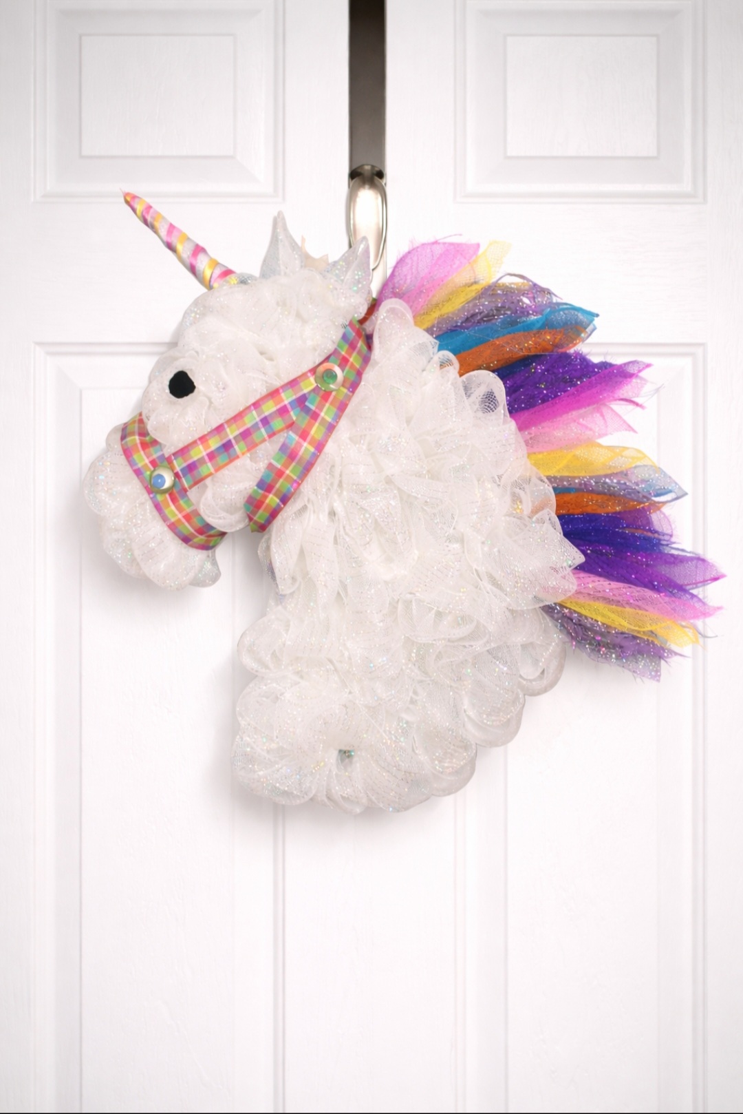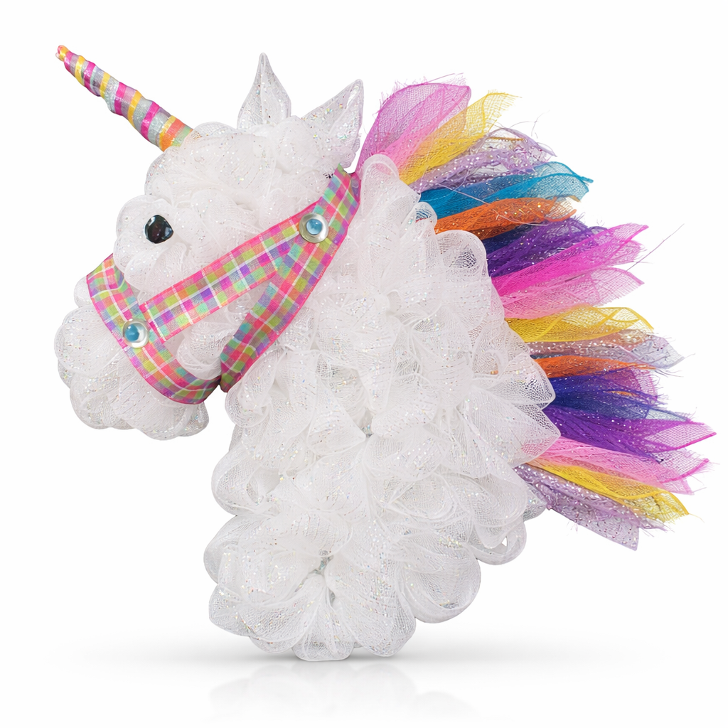 Details: • Handcrafted with premium deco mesh • Vibrant rainbow mane and glitter accents • Lightweight and easy to hang • Ideal for indoor or covered outdoor display