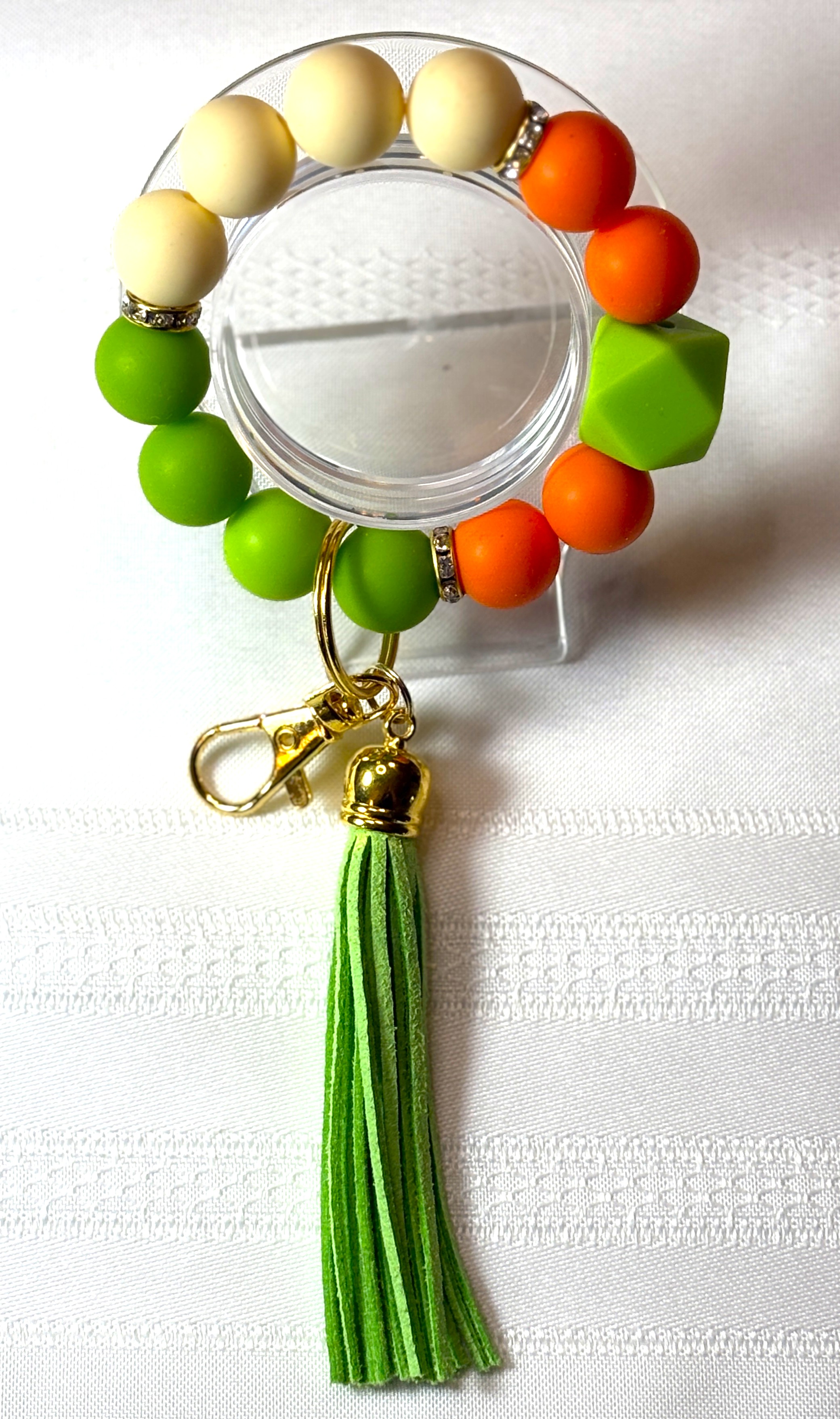 Brighten up your accessory collection with our Unique Silicone Beaded Wristlet Keychain! Featuring a lively combination of orange, bright green, and light yellow beads, this keychain is designed to make a statement. The matching 3-inch leather tassel adds a touch of elegance and flair, making it the perfect accessory for any occasion.