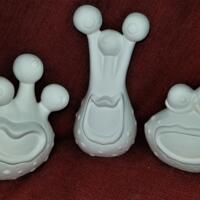 Ceramics are a labor-intensive hobby. :) 1. Slip is poured in the mold and allowed to set and dry. 2. Mold seams are removed and the remainder is sanded smooth 3. Fired in the kiln to 04 Bisque 4. Shipped to you for your personal touch!