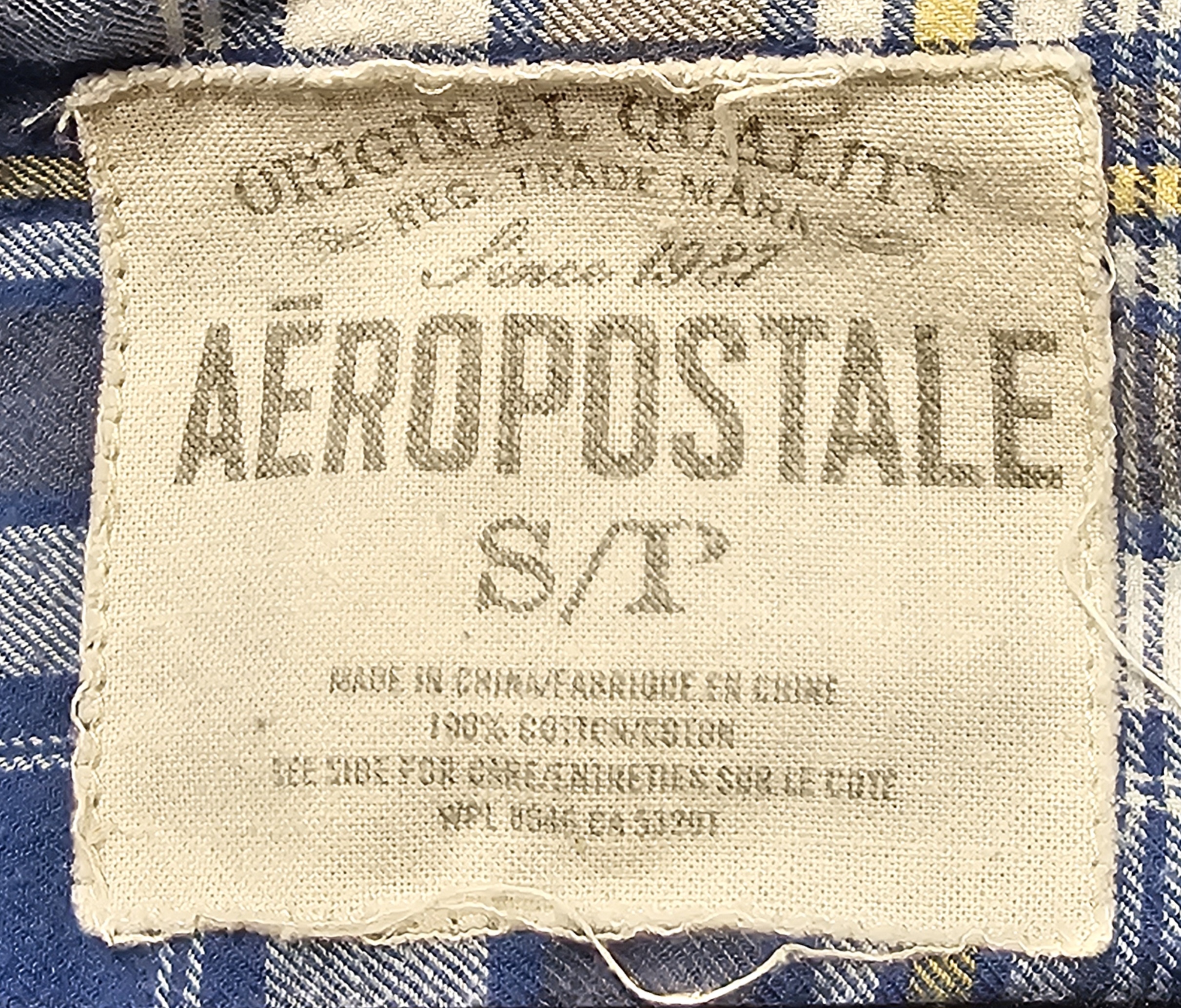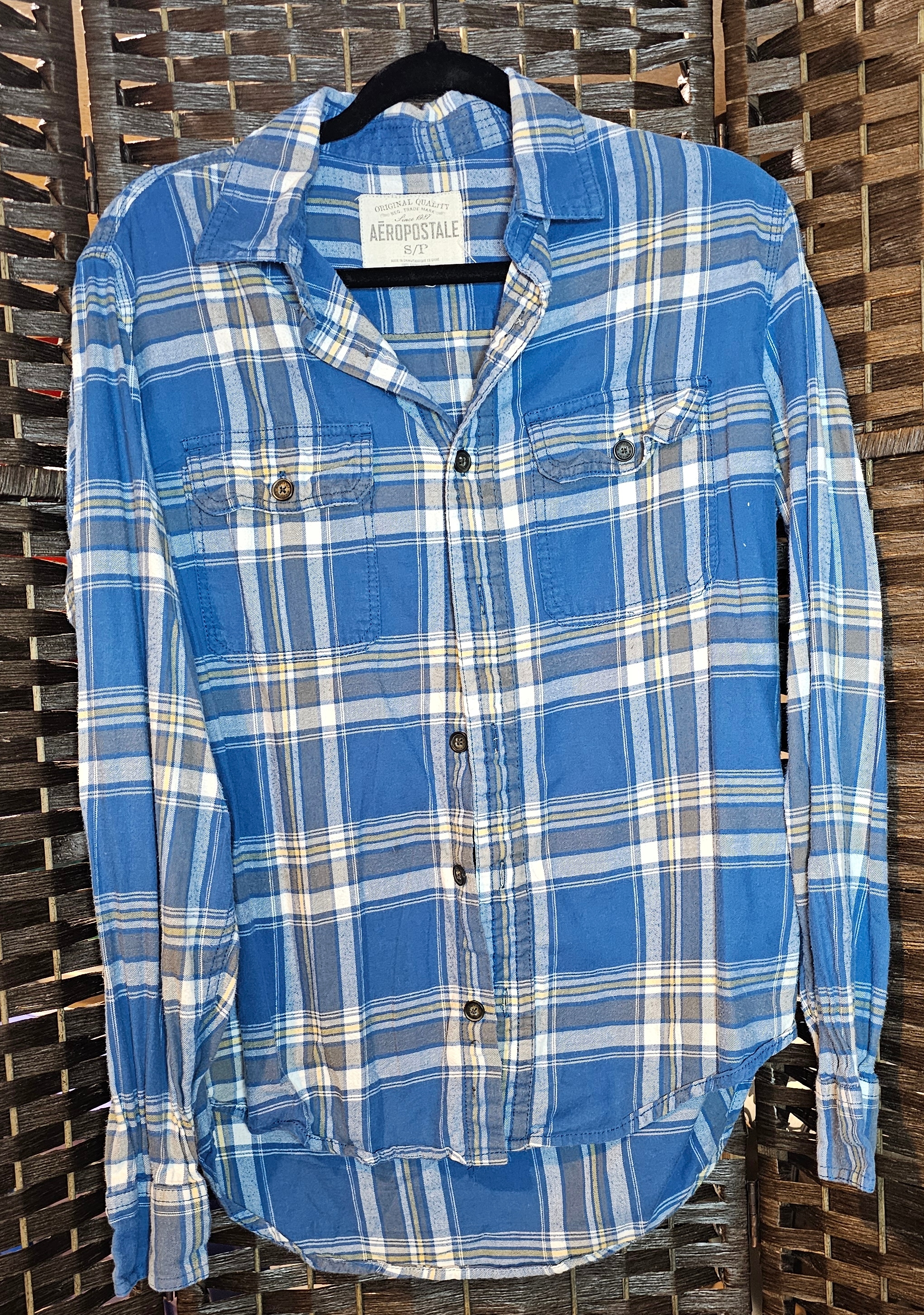 This is an upcycled Small Aeropostale Shirt. 21.5 inches across pit to pit. 29.5 inches long from top of shoulder to bottom of shirt. Embellished on back with a fabric Panel.