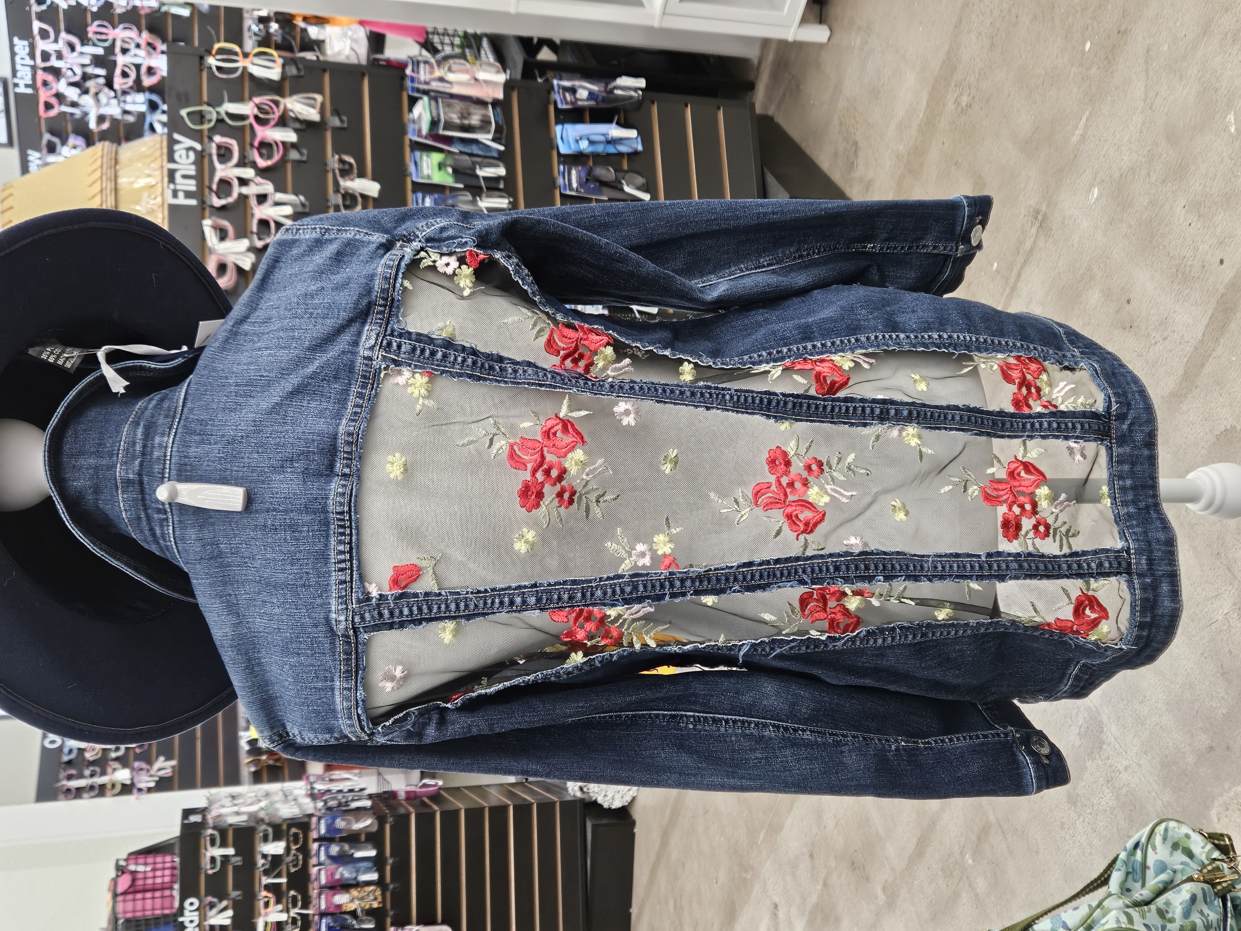 This stylish and fun jacket is lovingly upcycled by replacing the panels with black tulle with embroidered red roses. Dress it up or dress it down. Either way, have fun! It's a Chino size 0 which translates to a US size 4.