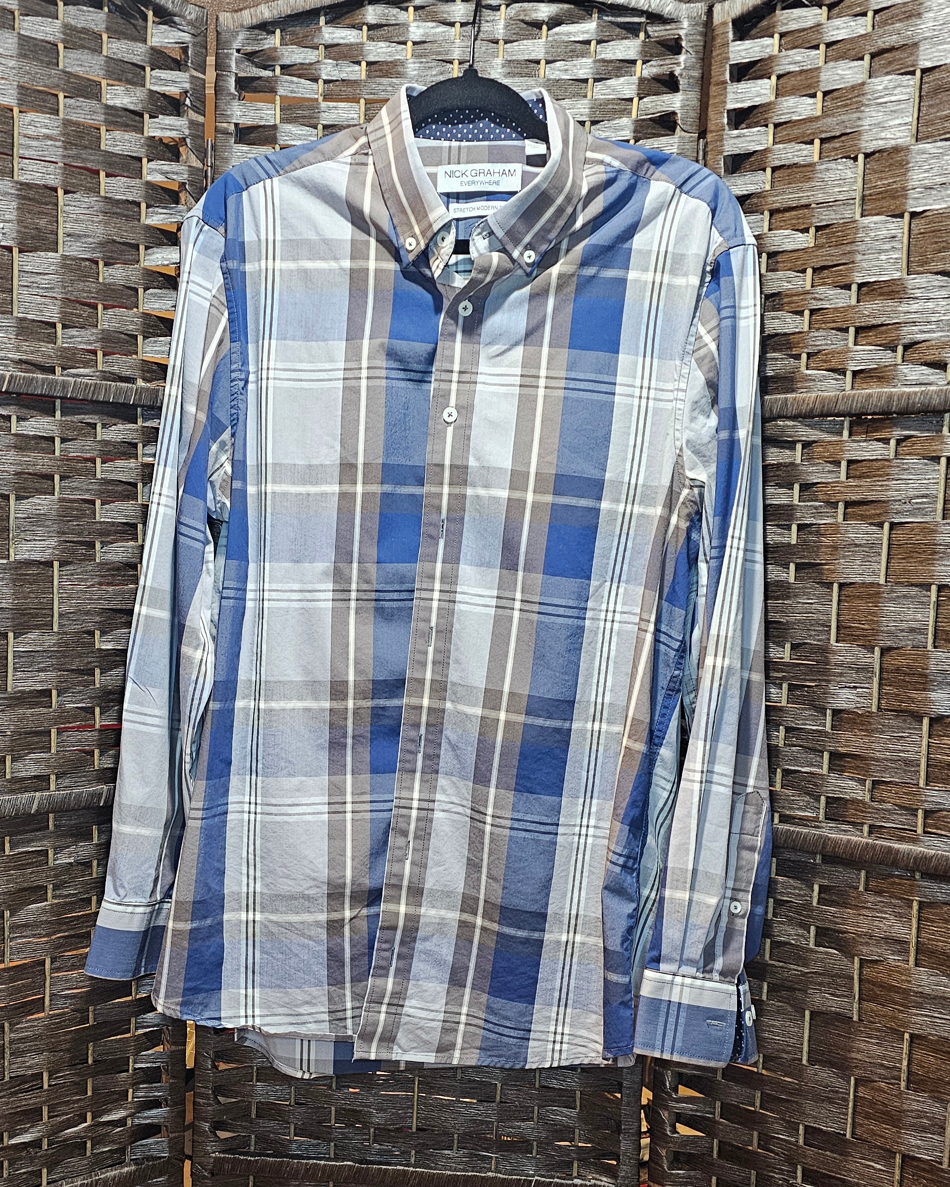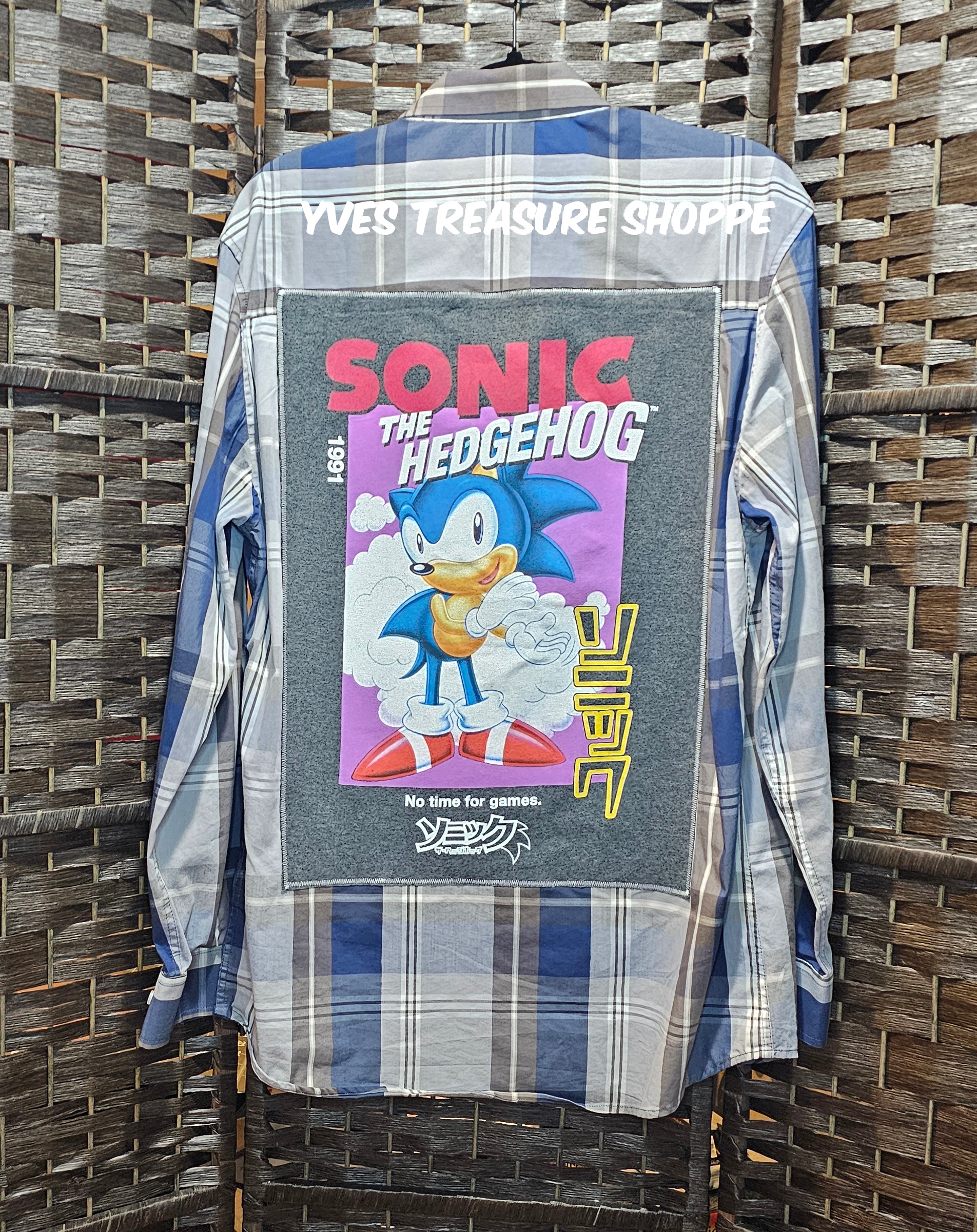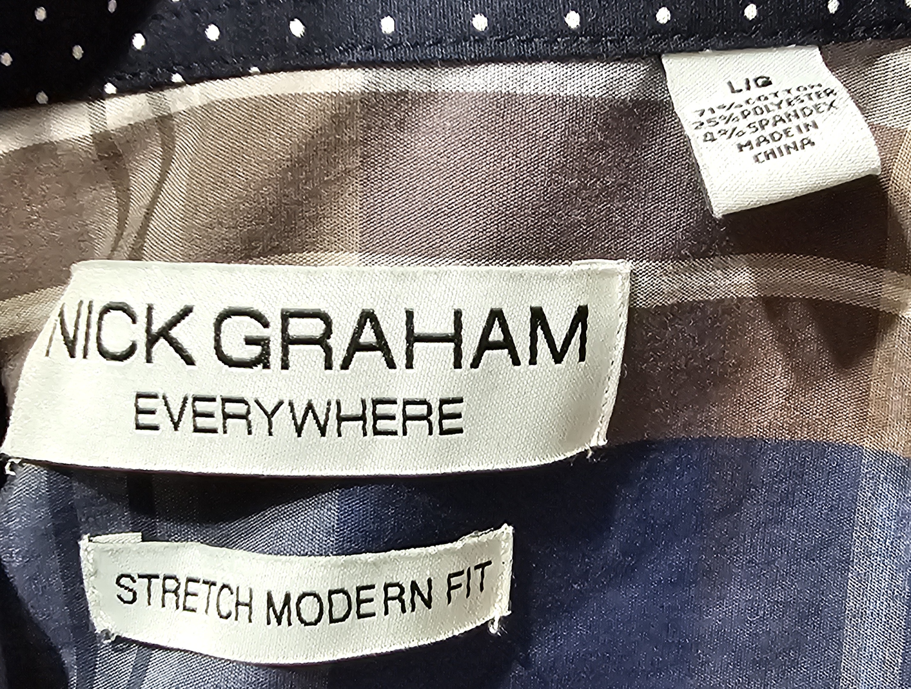 This is a Upcycled Large Nick Graham Shirt. 22 inches across pit to pit. 31 inches long from top of shoulder to bottom of shirt. Embellished on back with a Fabric Panel.