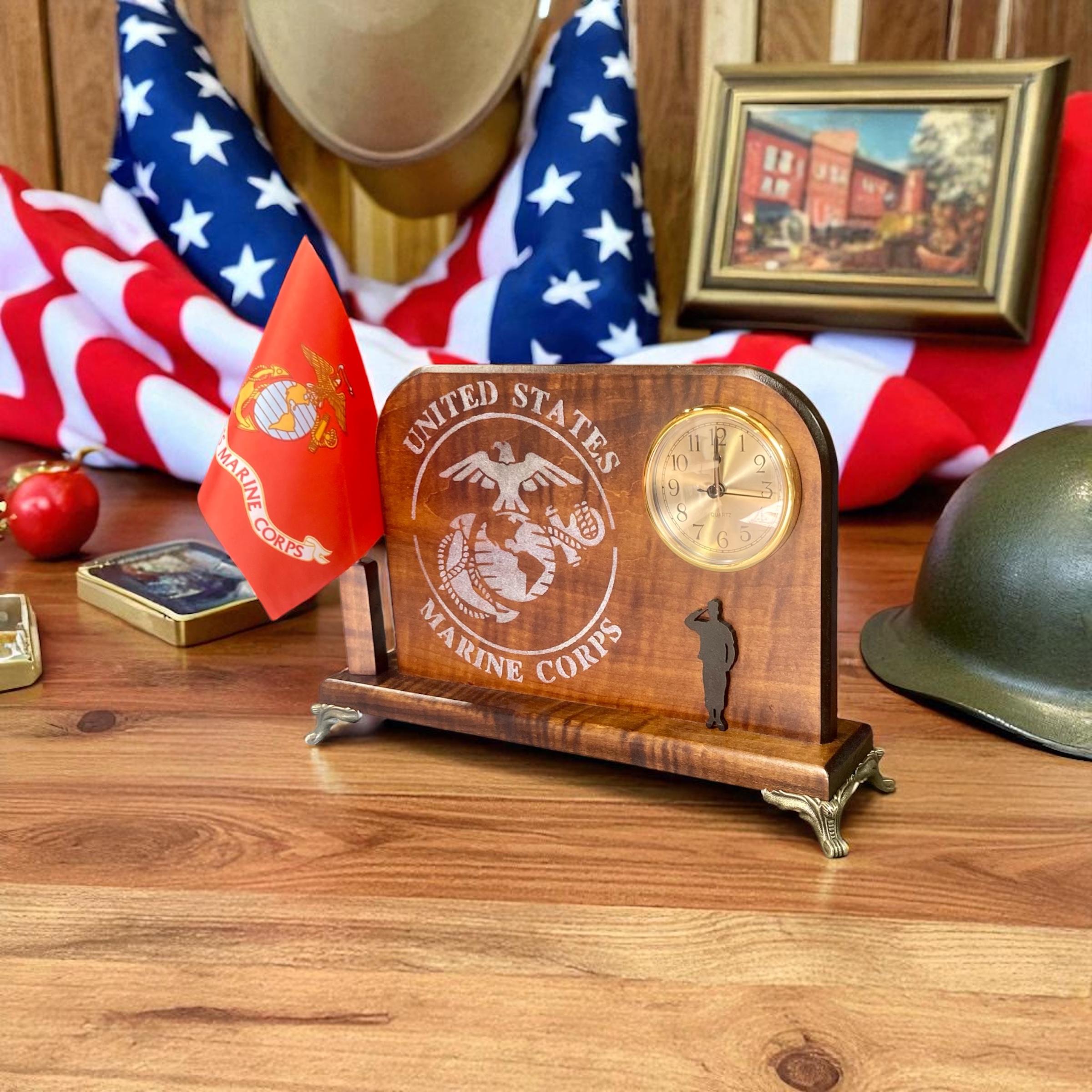 The beautiful clock was designed for those families that had a loved one serve in Marines .This clock would be a great way to remember their love ones that served in the military. This clock is 13" x 8" and the finish feels like a piece of furniture.