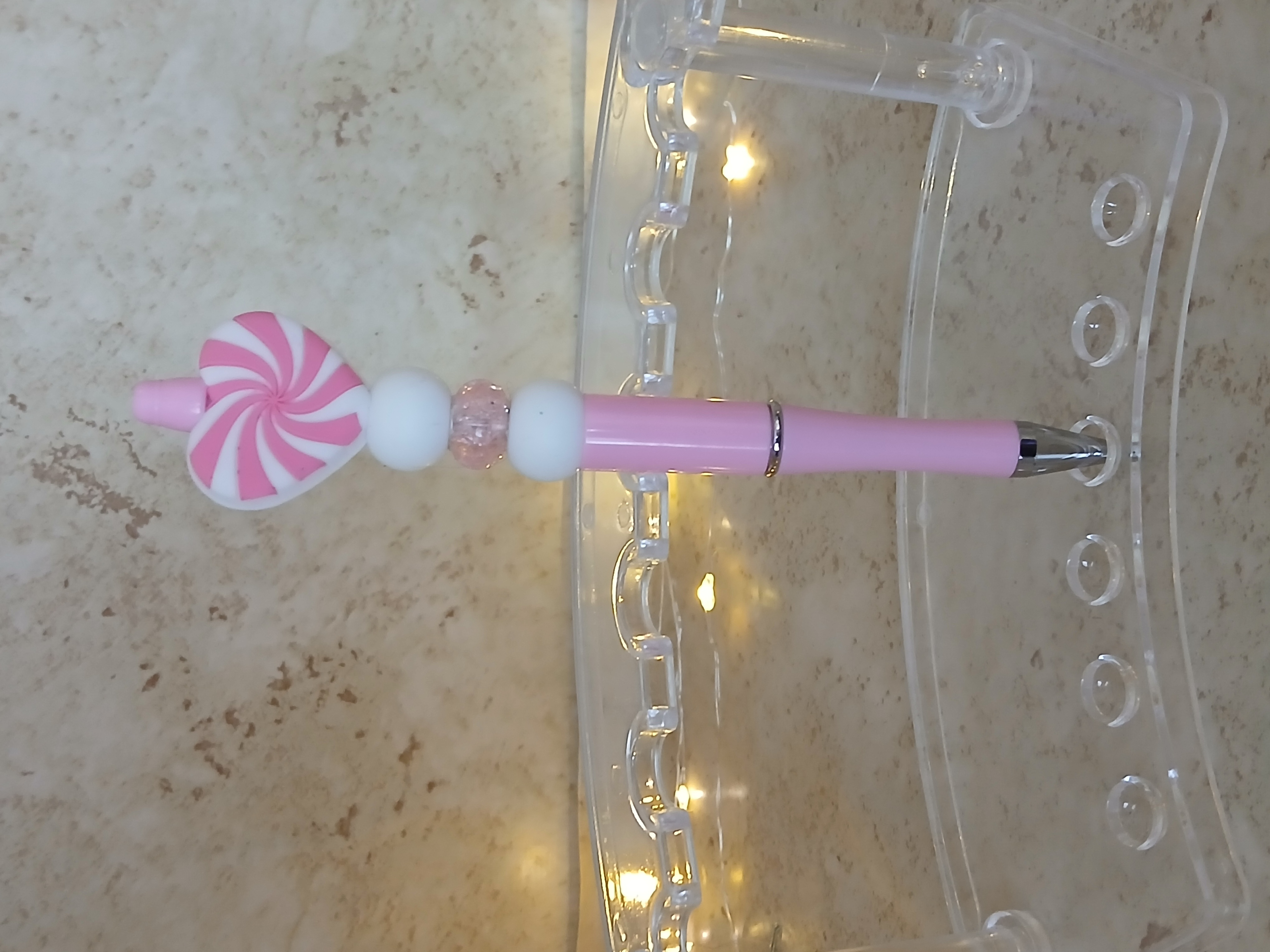 Pink and white swirl heart silicone focal bead on a pink pen is great for Valentines day and everyday just to say I love you.