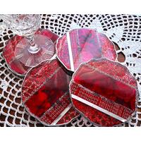 This pretty set of 4 Fall Leaf Resin Coasters are shaped like leaves and are 4" across. They have beautiful fall colors and the veins are painted in gold paint.