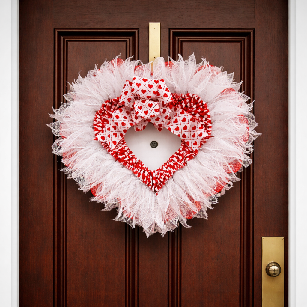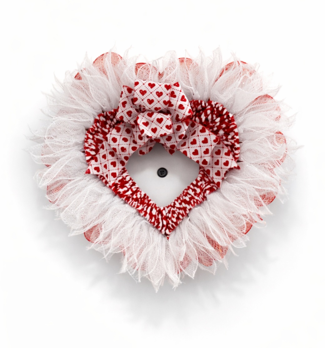 Welcome guests with love using this beautifully handcrafted Valentine’s Day wreath. Designed with layered red, pink, and white ribbon mesh, heart accents, and a “Happy Valentine’s Day” banner, this wreath adds a festive and romantic touch to any door or space.