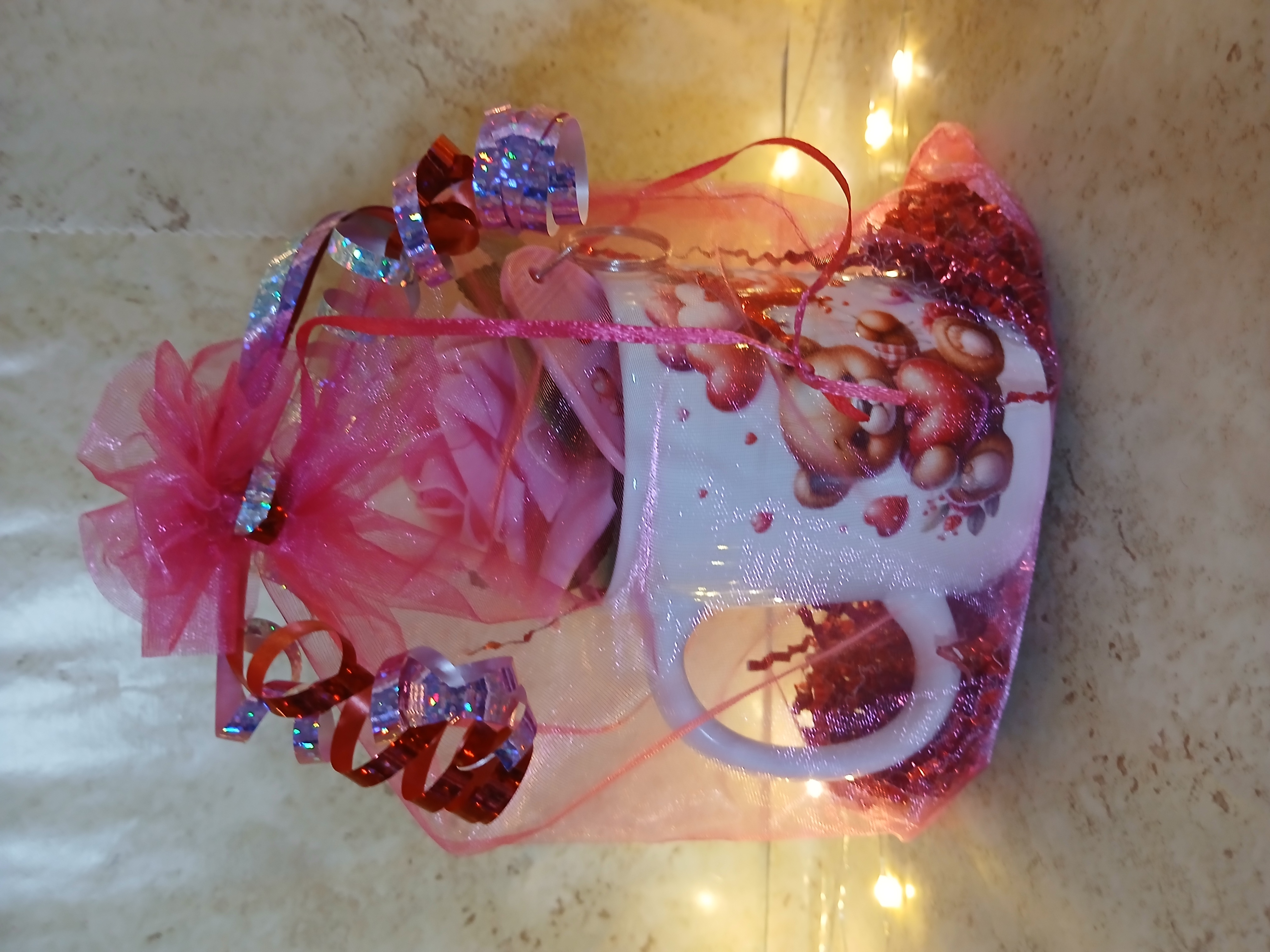 Randomly chosen either bears or funny mugs with a valentine theme and inside a valentine hotel key chain and a foam rose all wrapped up in a pink organza bag.