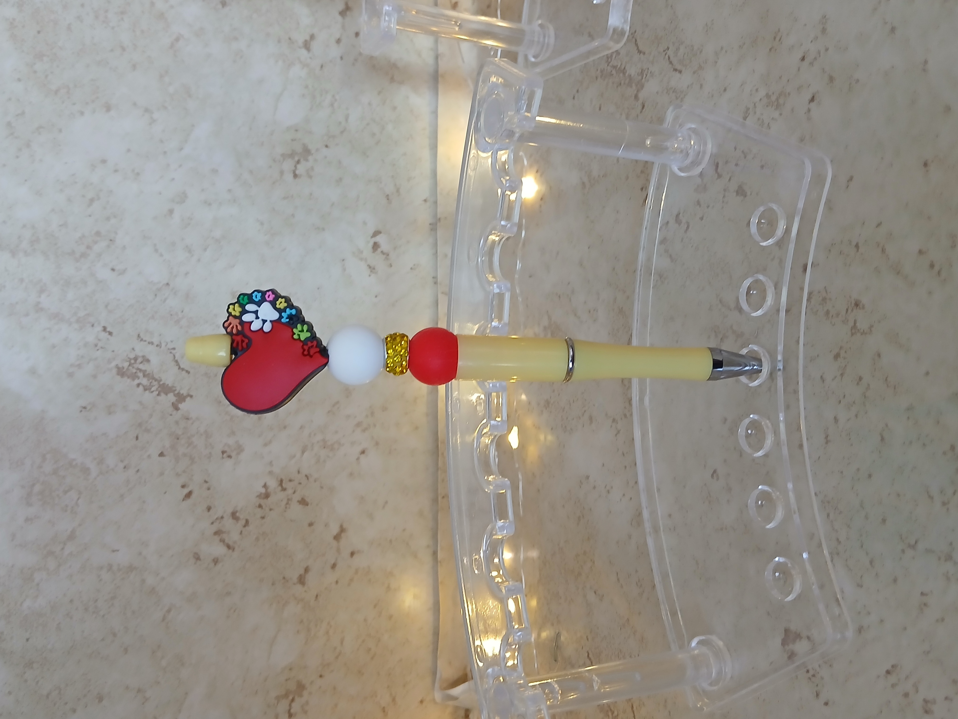 Yellow pen with a red and white silicone beads and a red silicone heart focal with different colored paw prints up the side is great for any pet lover