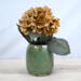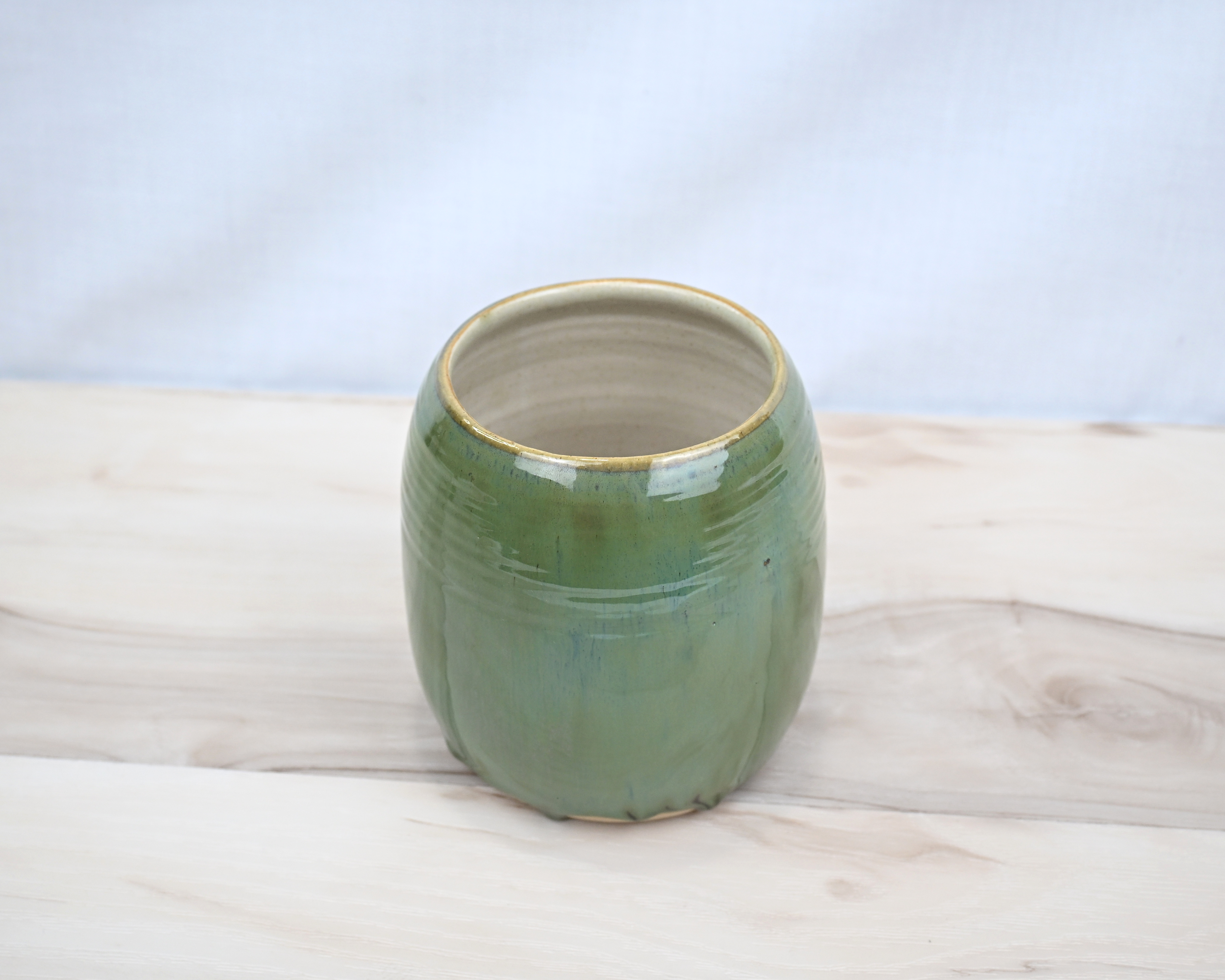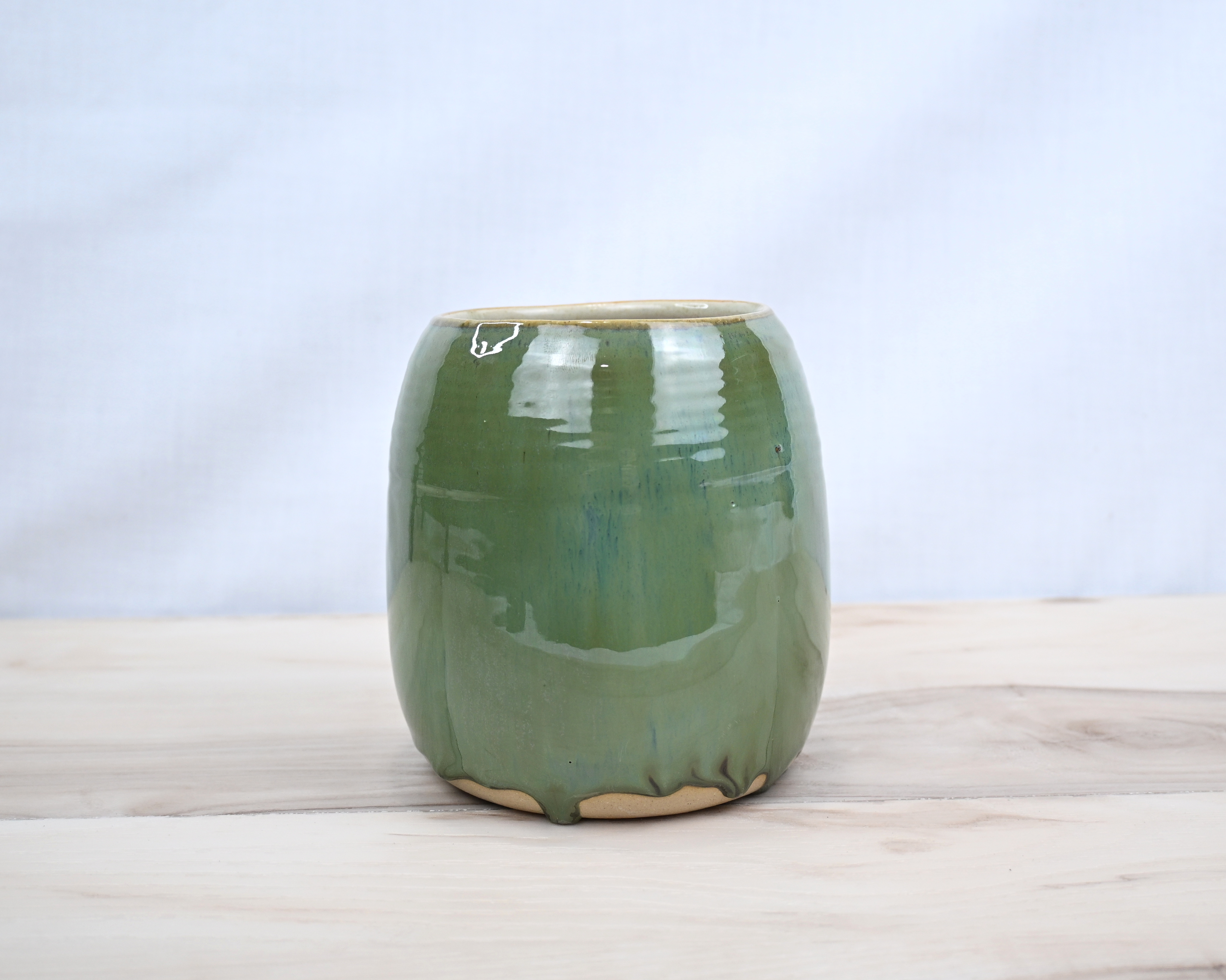 This vase is coated in a richly layered green glaze, full of subtle shifts and depth that change with the light. Its rounded form and smooth surface make it a versatile piece—perfect for fresh blooms or as a striking stand-alone accent. May also work well as a utensil crock.