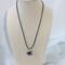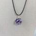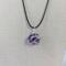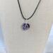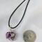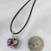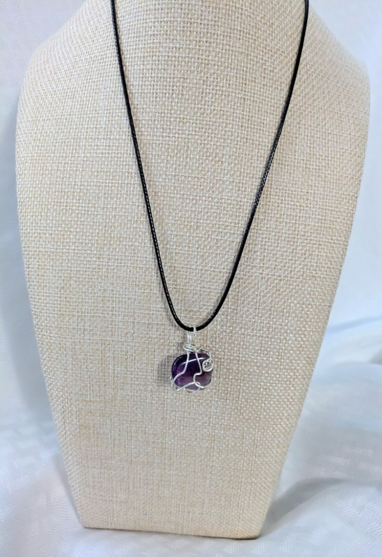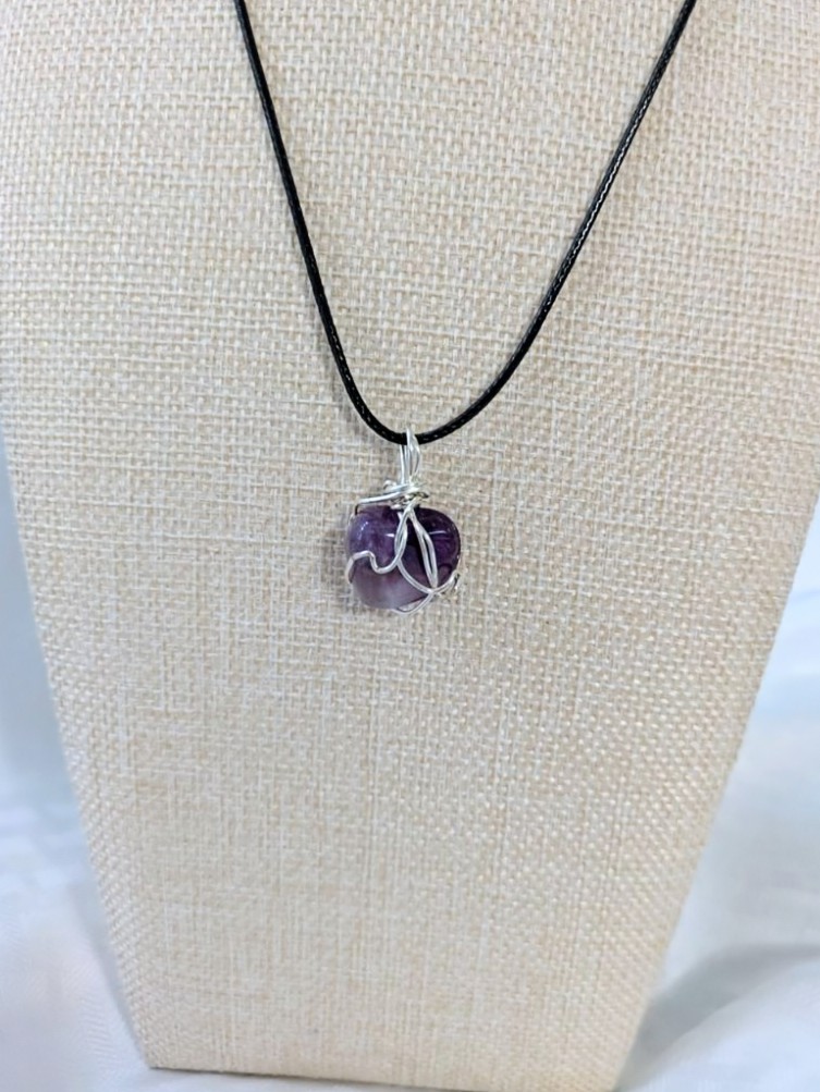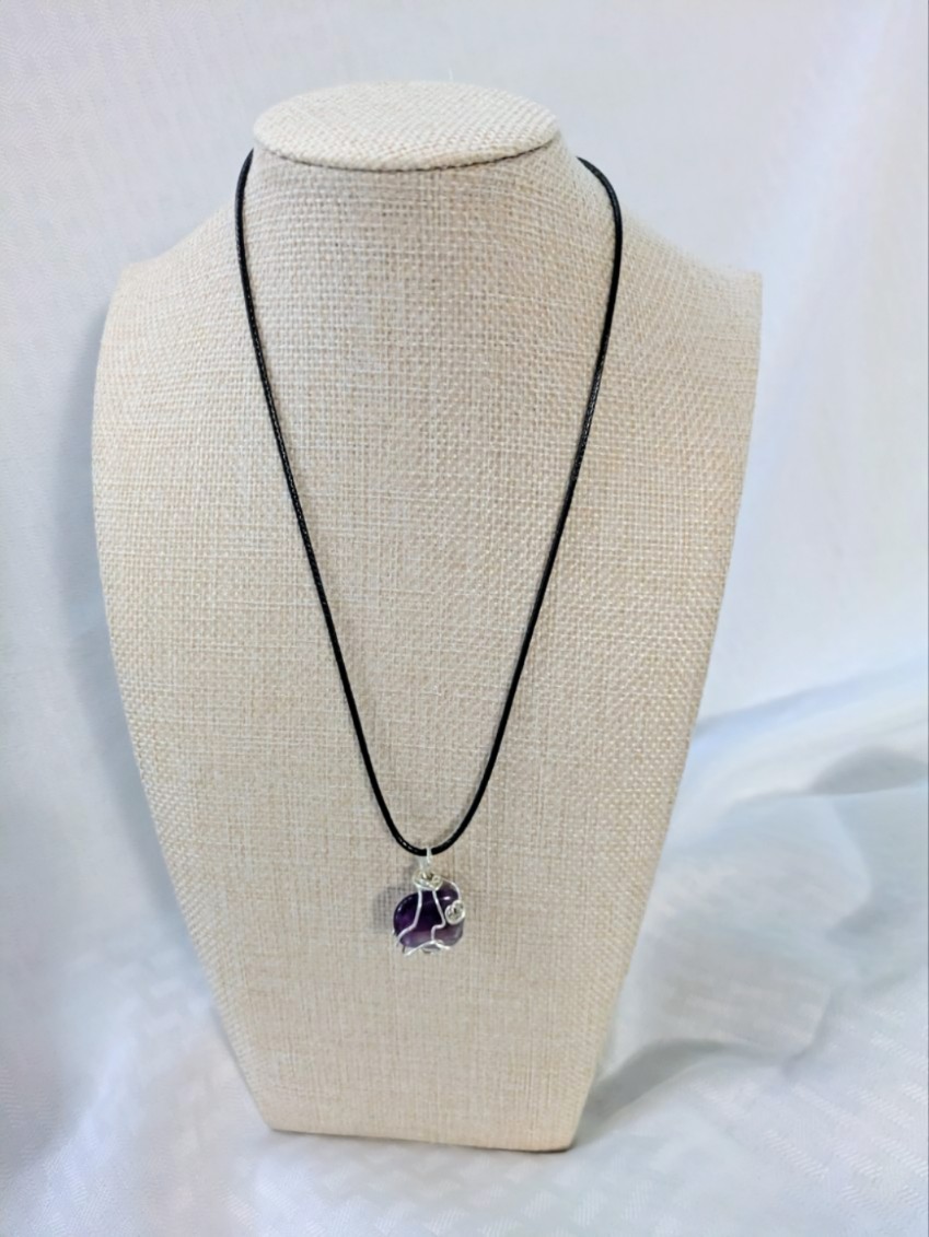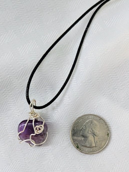 This triangular shaped Amethyst stone is approximately 3/4" in diameter. Wrapped in silver plated wire in a one-of-a-kind design. The stone varies in beautiful shades from purple at the top and fading into lavender. The black leather cord is approximately 17" long with a 2" extender, finished with black seed beads.
