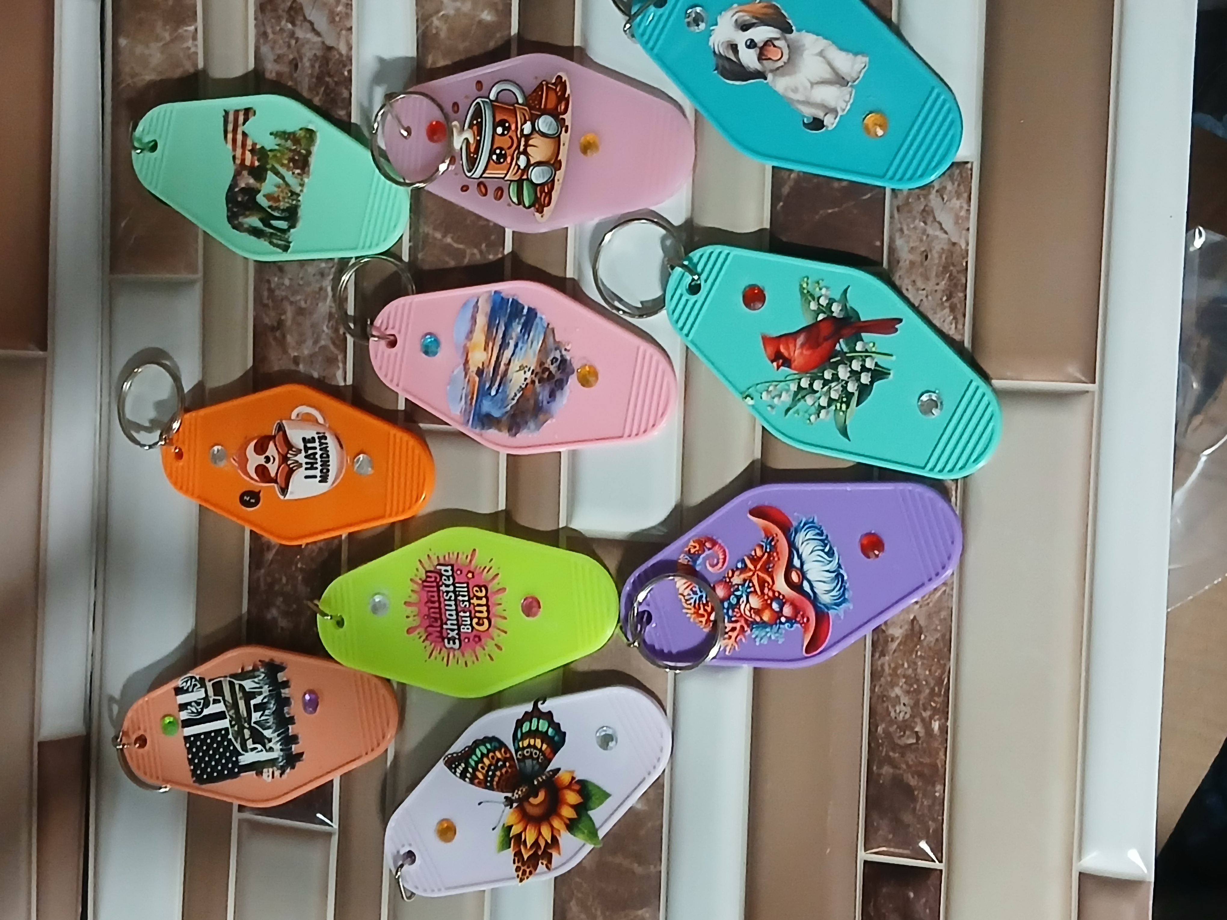 Do you like surprises? Get a funny coffee, heart shaped sunset, sassy saying, gnome, deer, sloth, horse, sunflower, Cardnial, dog, and Christmas on a hotel key chain in various colors