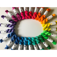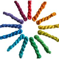 Hand dyed fibers like mine are typically dyed in very small batches and given lots of special attention and handling. Every strand of yarn you'll find in my shop is in the care of my hands for no less than 3 hours. This ensures accurate and even color distribution and absorption, complete rinsing of excess dye and elimination of salt residue, and the time needed to beautifully wind, measure for length, and weigh every skein of yarn prior to packaging and shipping. You won't find any surprises like knots or splicing in my yarns, only beautiful color and predictable quality and softness.