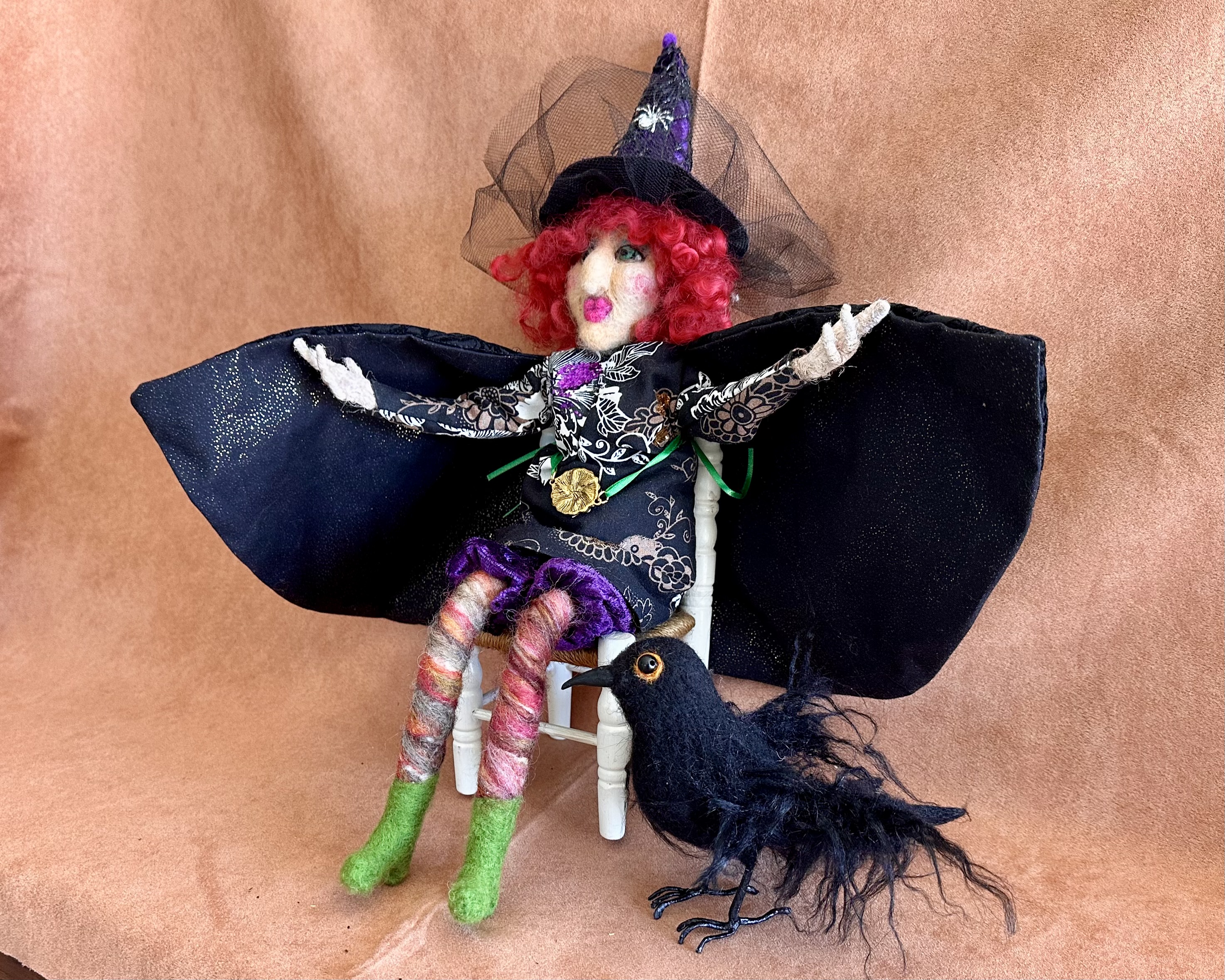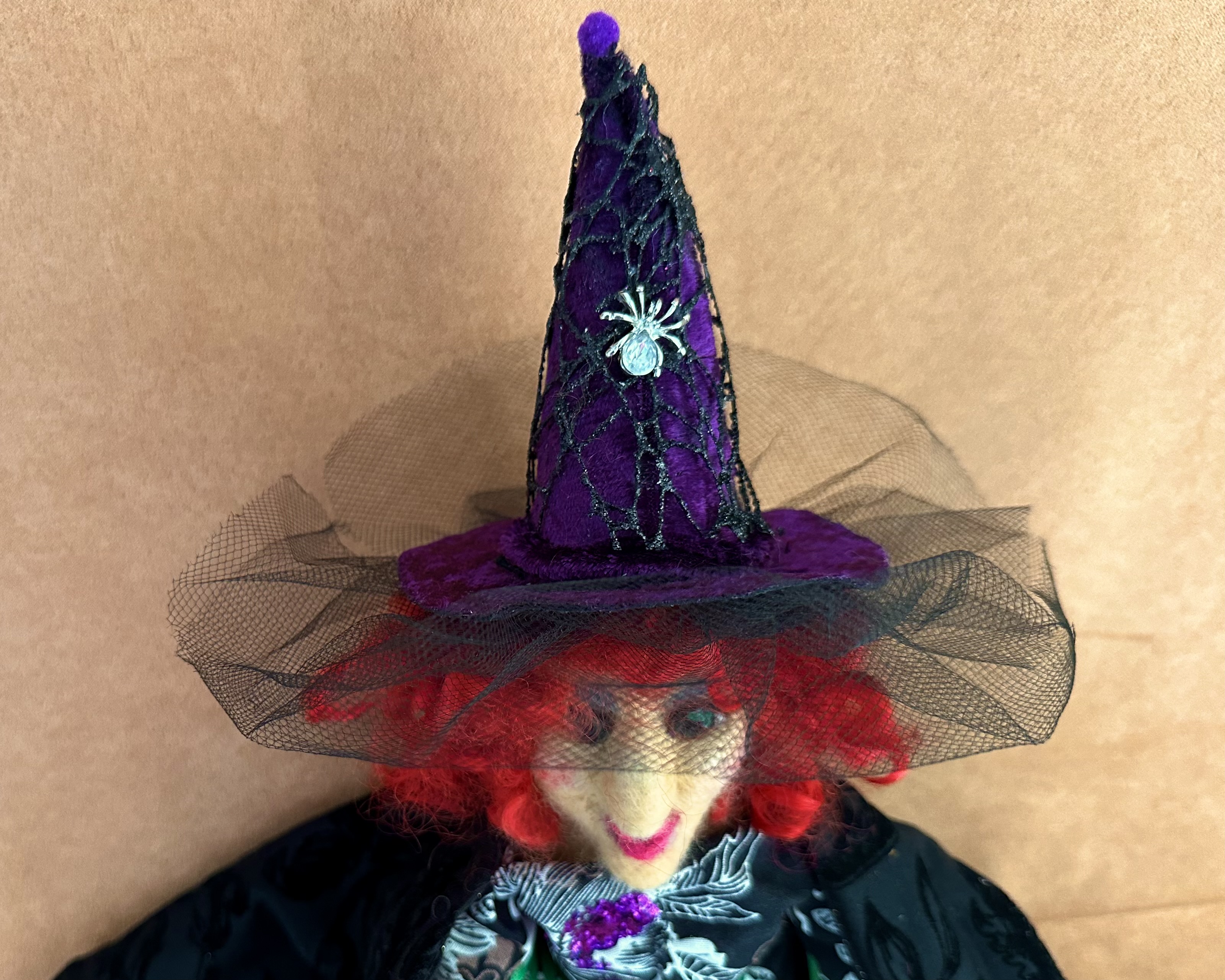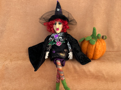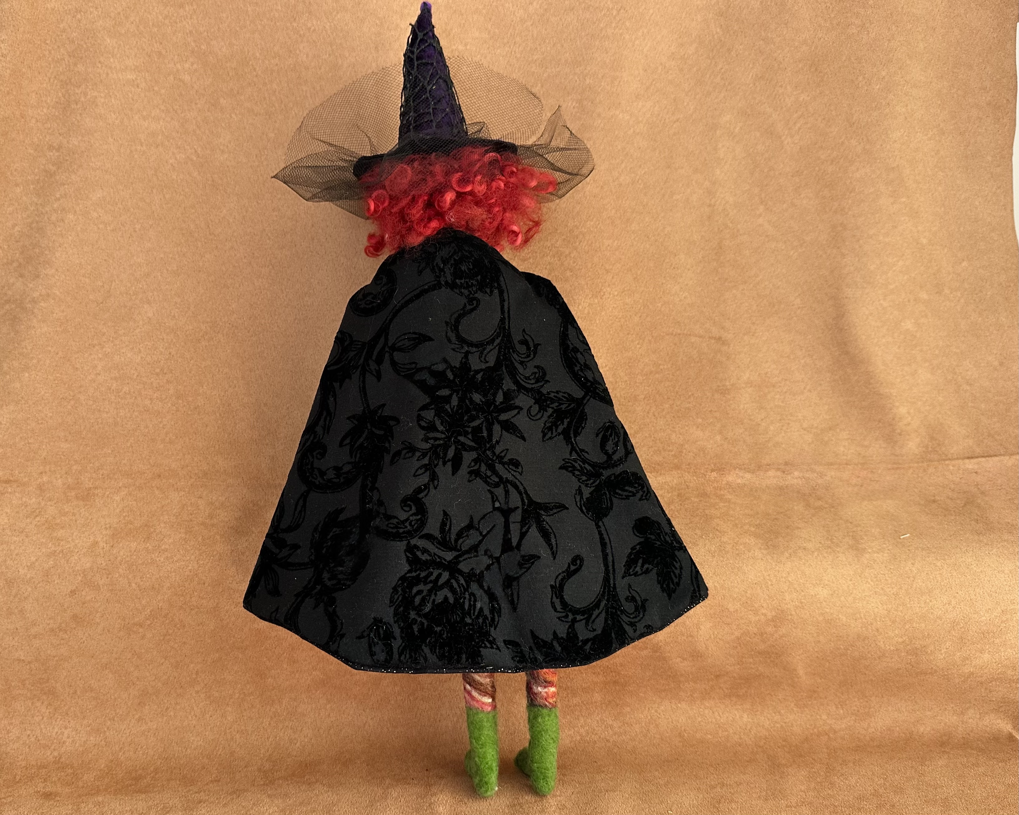 Veloura wears a purple velvet witch hat trimmed with black netting and a glittering spider on its web. Her belted black glitter dress is paired with purple velvet knickers, striped wool legs, and jaunty green felted boots. A velvet brocade cape with a secret floral pattern completes her magical look. She rides her optional broomstick of authentic found wood — proof that even witches enjoy a touch of the real world.
