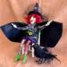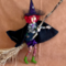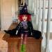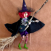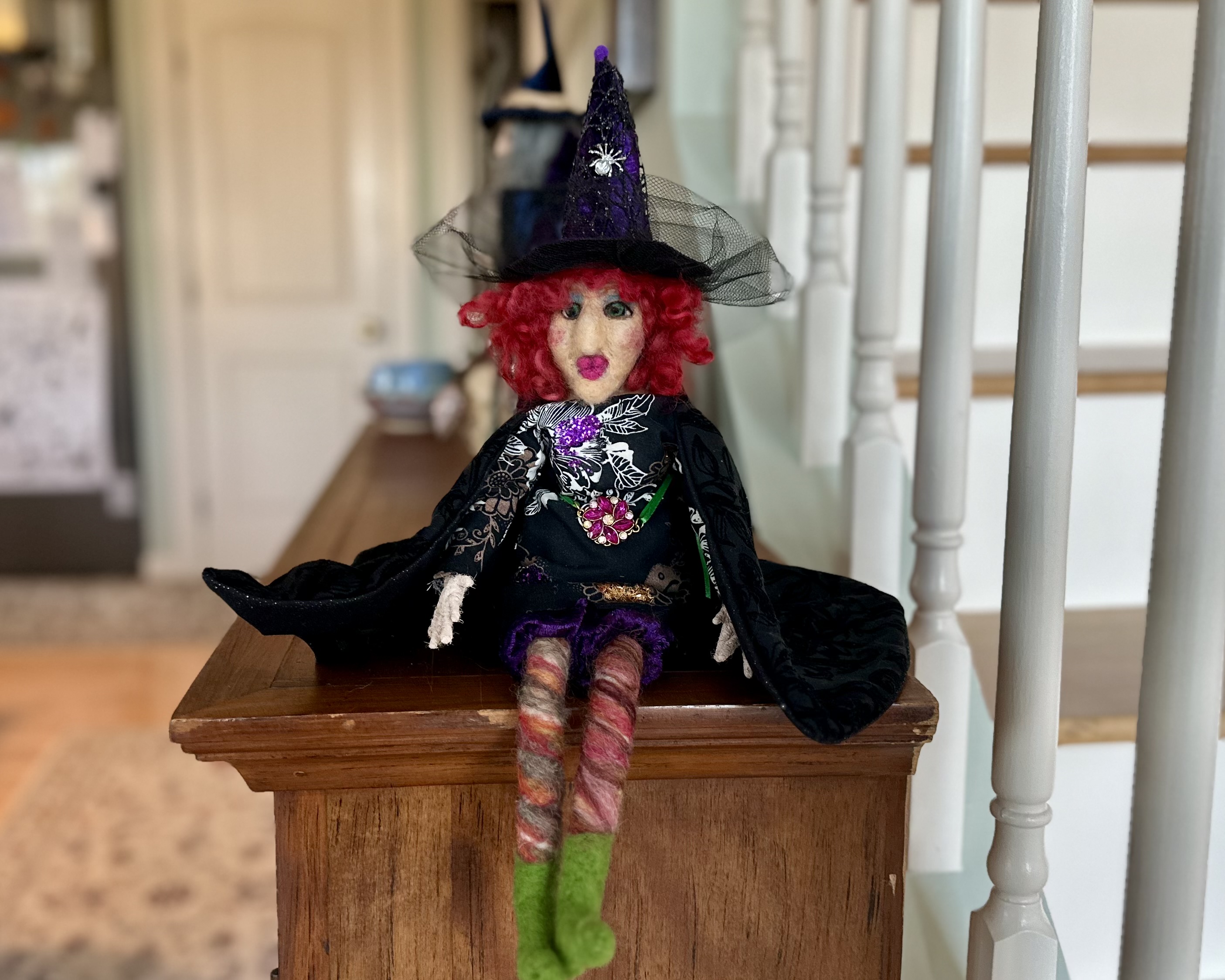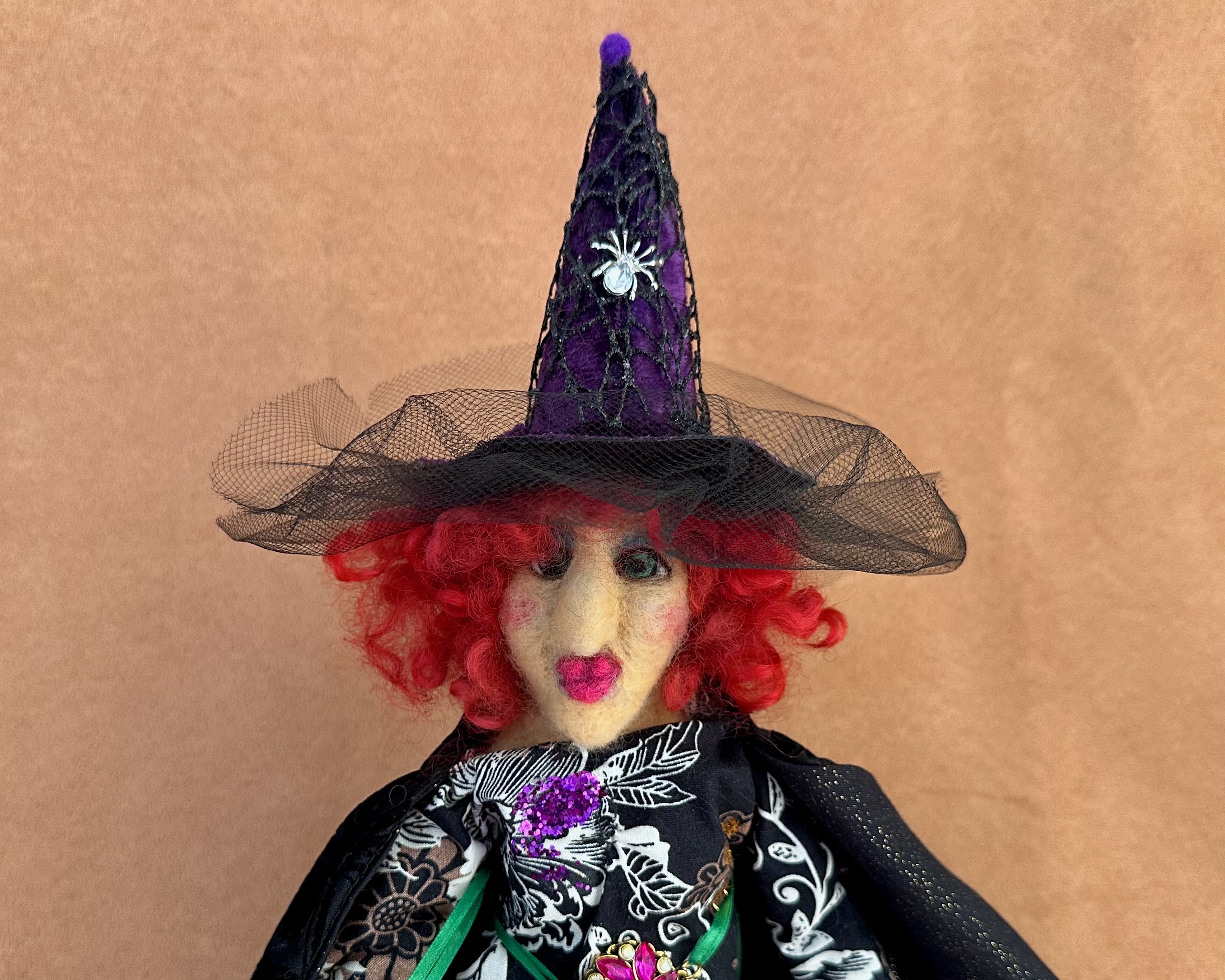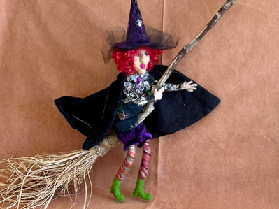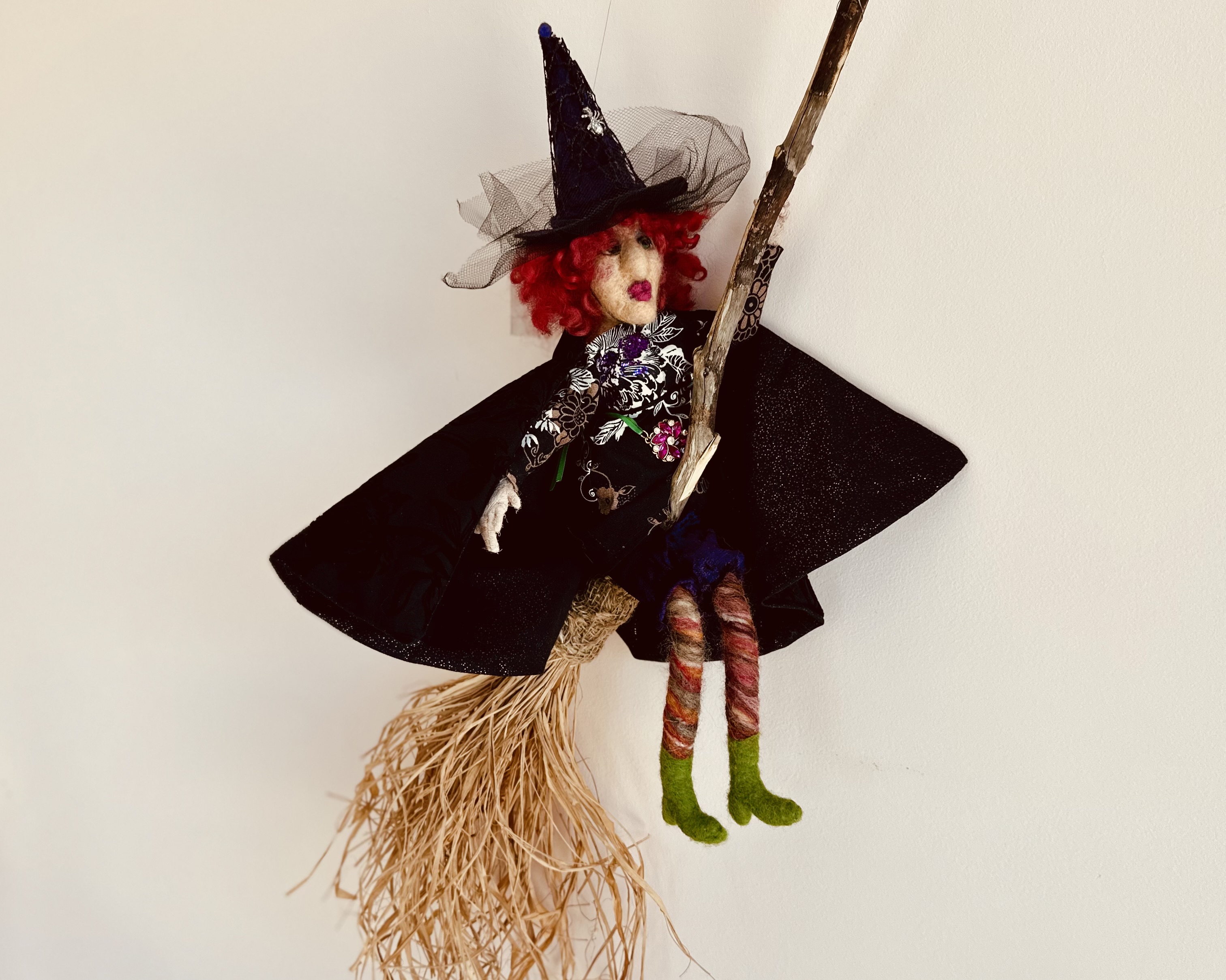 Veloura wears a purple velvet witch hat trimmed with black netting and a glittering spider on its web. Her belted black glitter dress is paired with purple velvet knickers, striped wool legs, and jaunty green felted boots. A velvet brocade cape with a secret floral pattern completes her magical look. She rides her optional broomstick of authentic found wood — proof that even witches enjoy a touch of the real world.