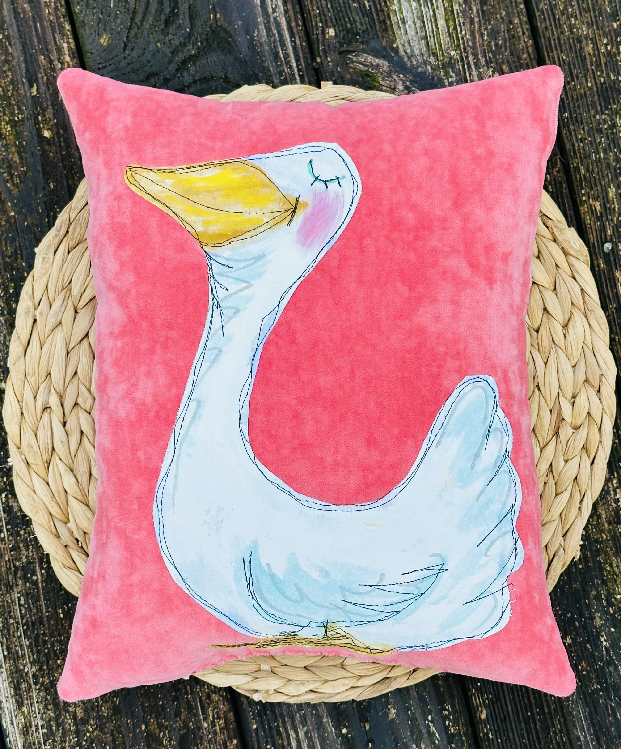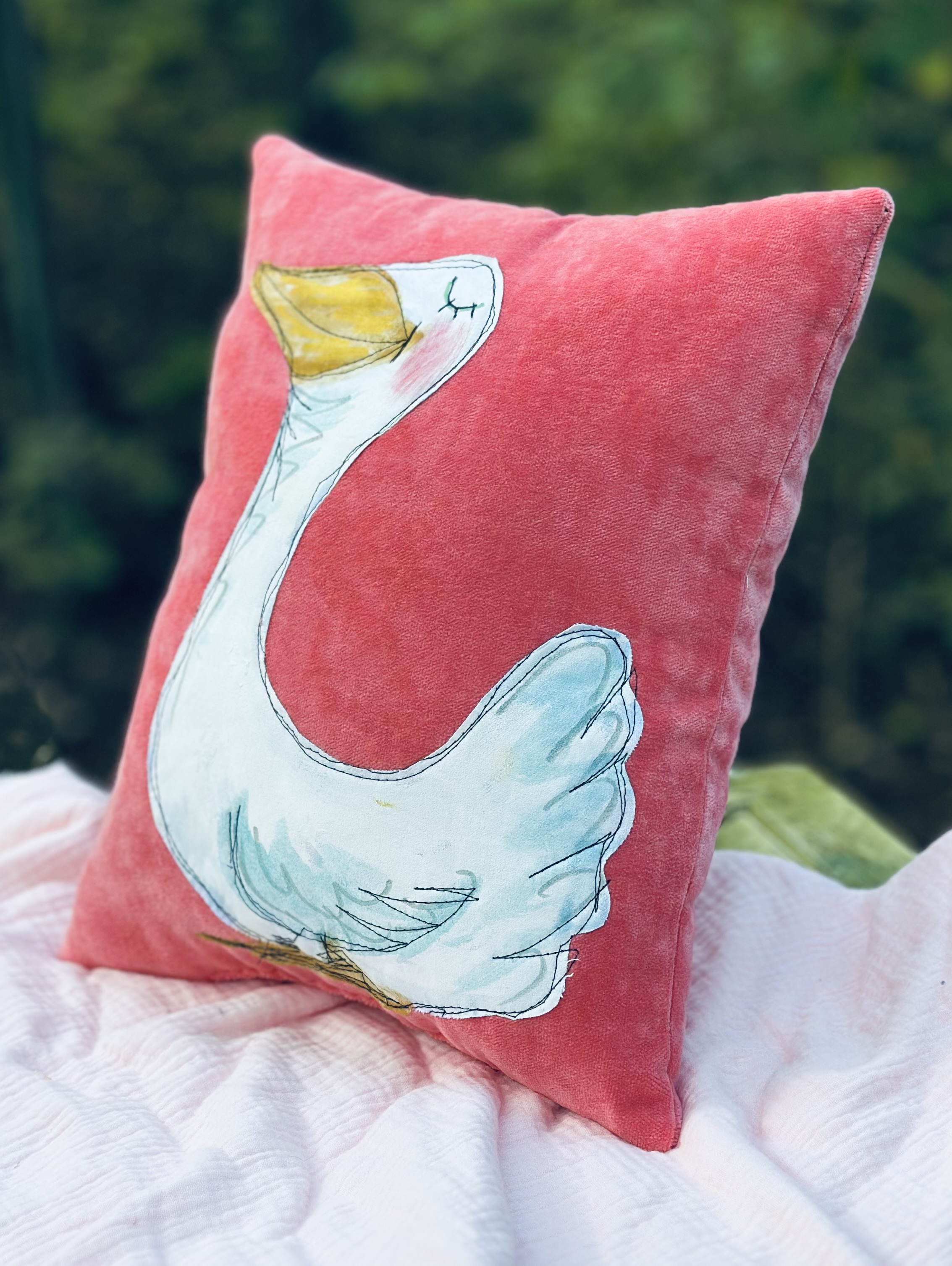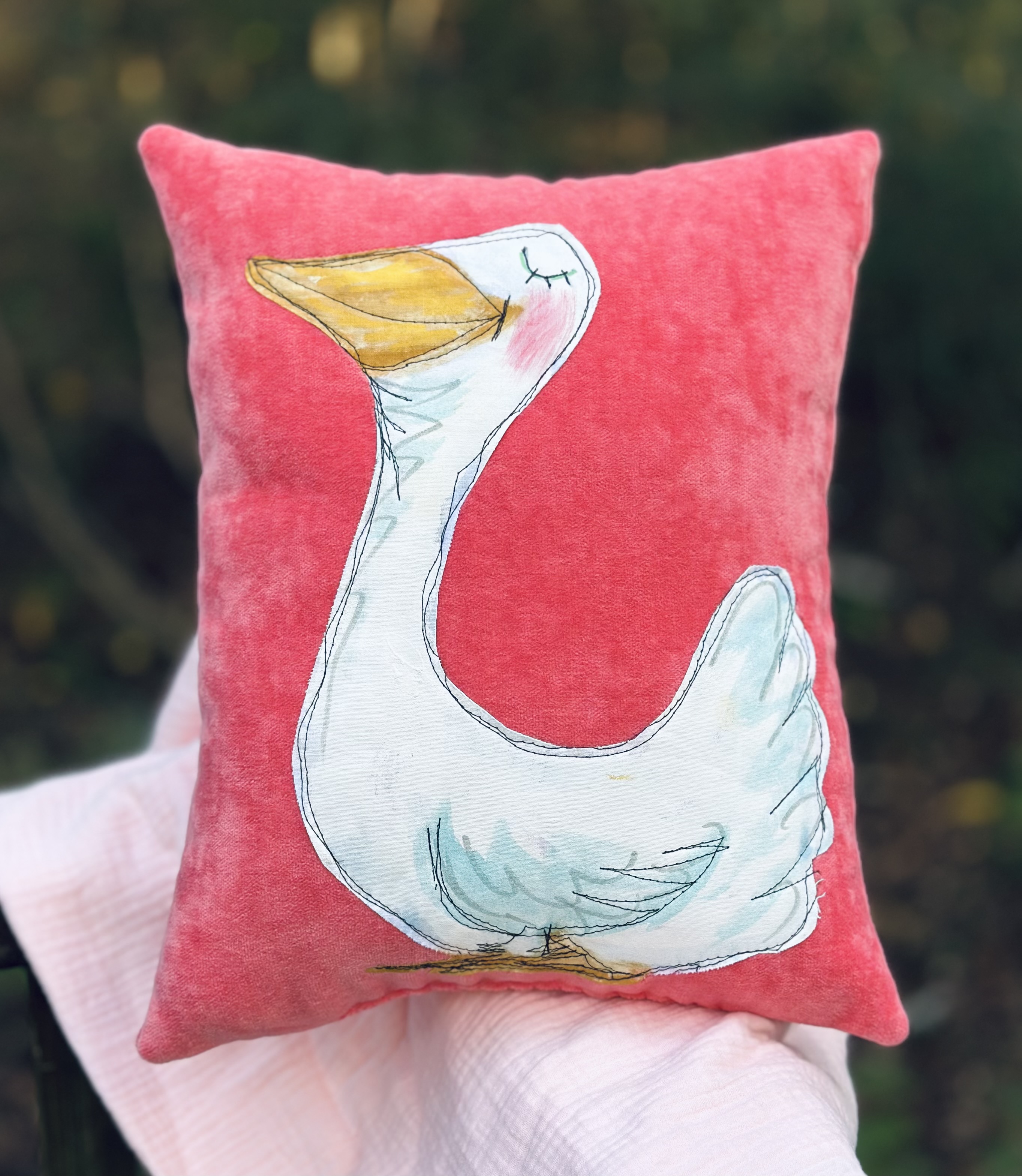 This adorable pillow is a mixed media darling with my hand painted applique of a goose.
