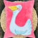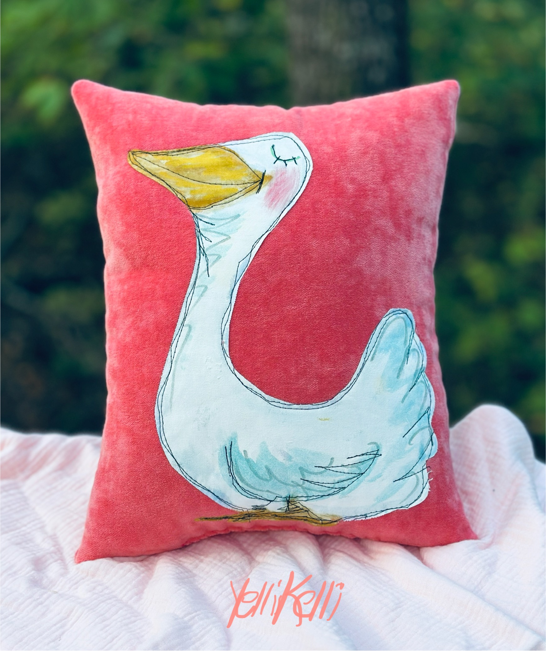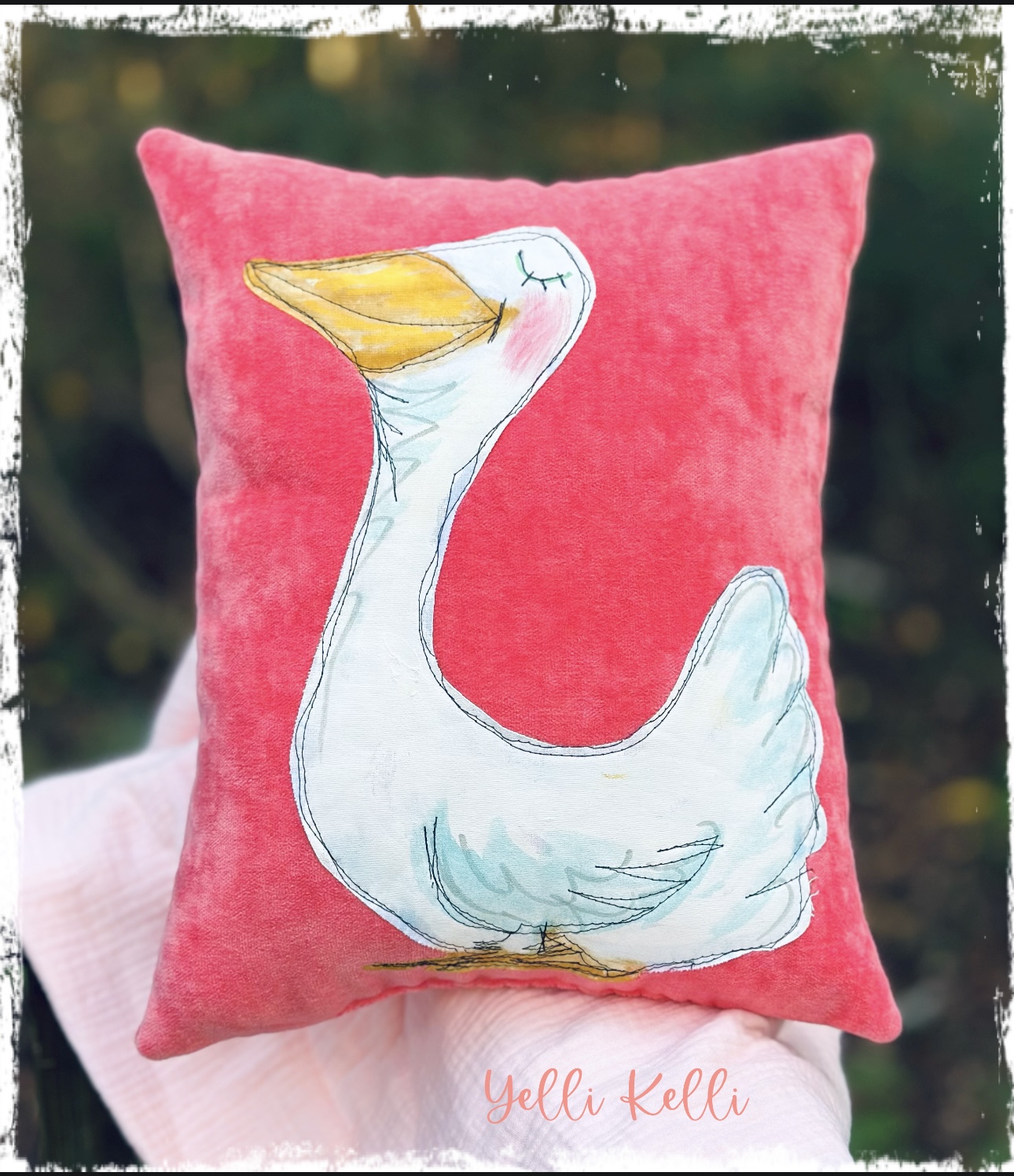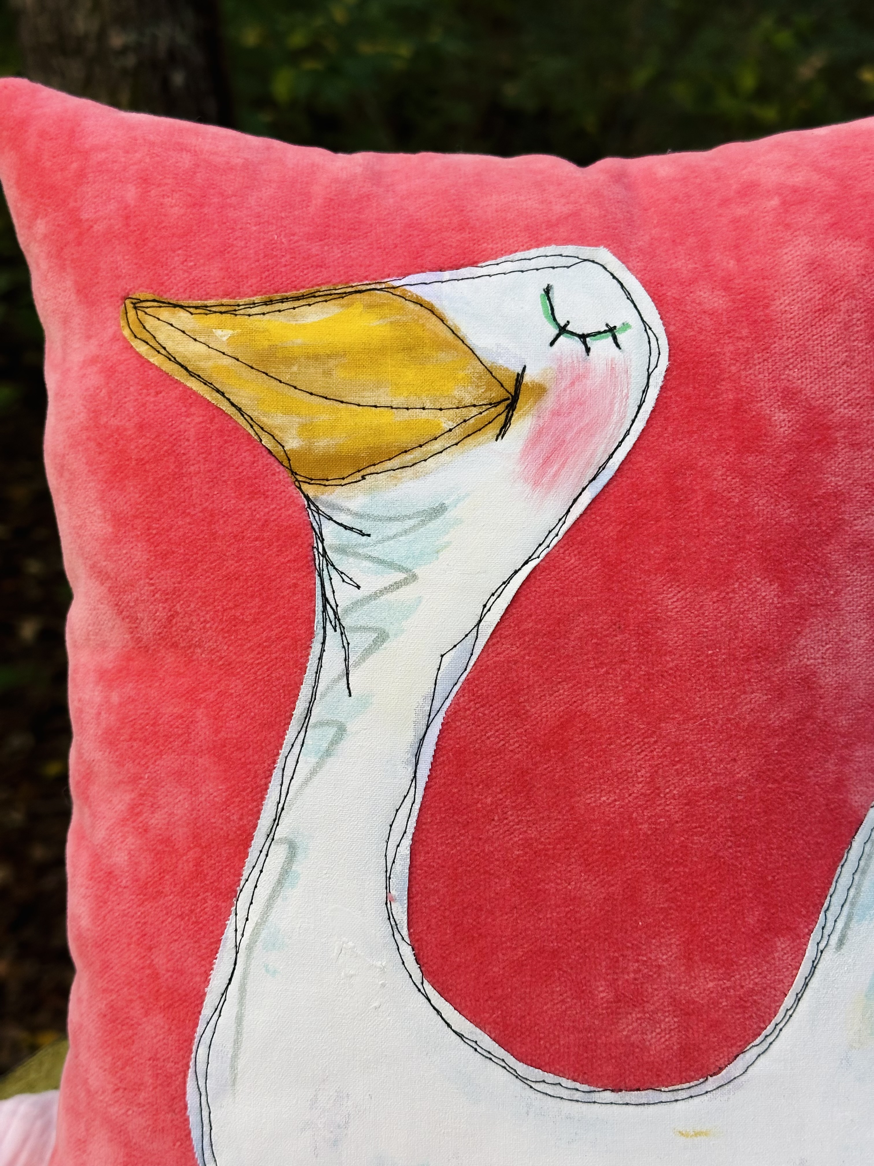 This adorable pillow is a mixed media darling with my hand painted applique of a goose.
