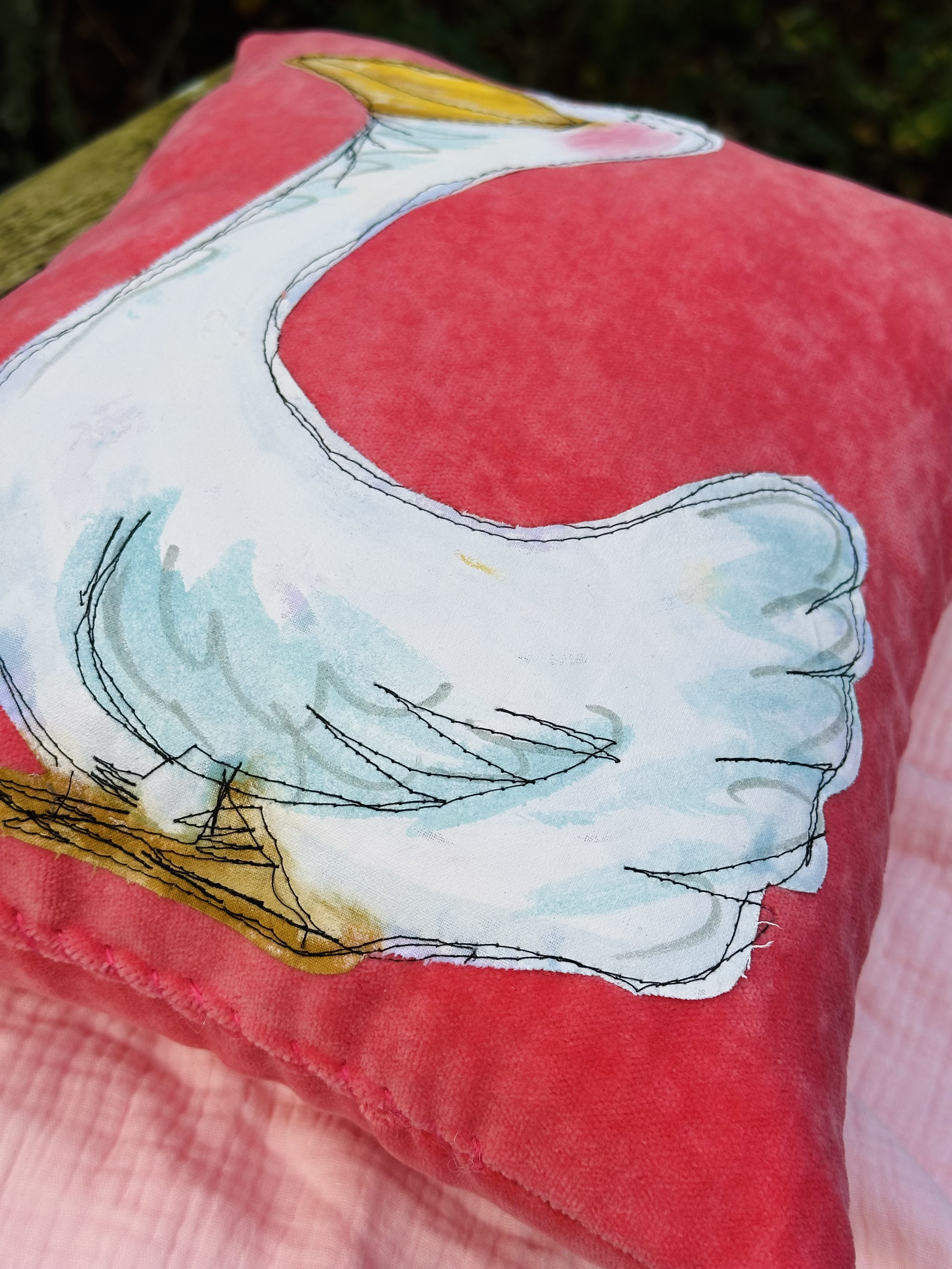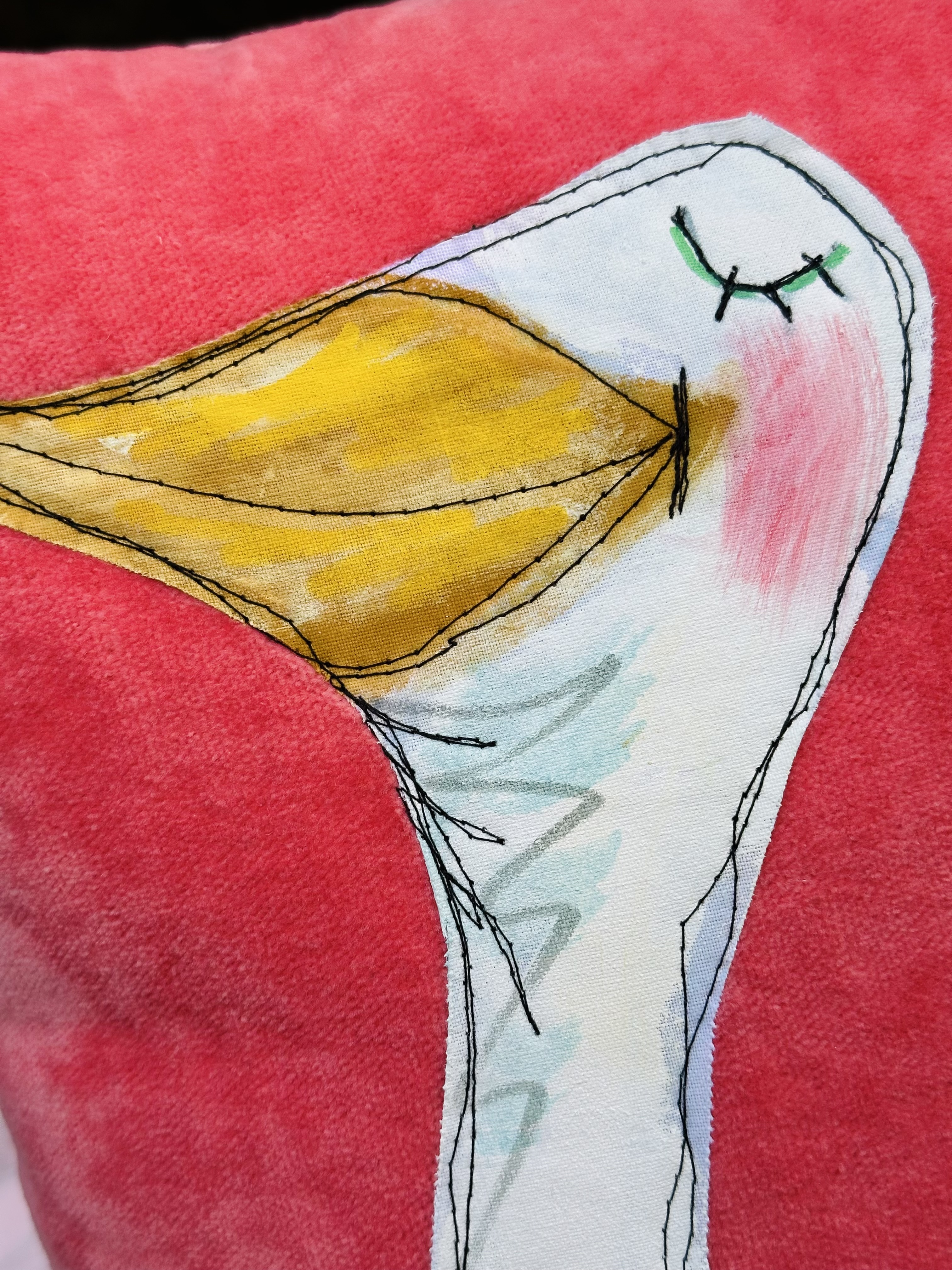 I stitched it onto my coral velvet pillow with a silly wonky stitch!
