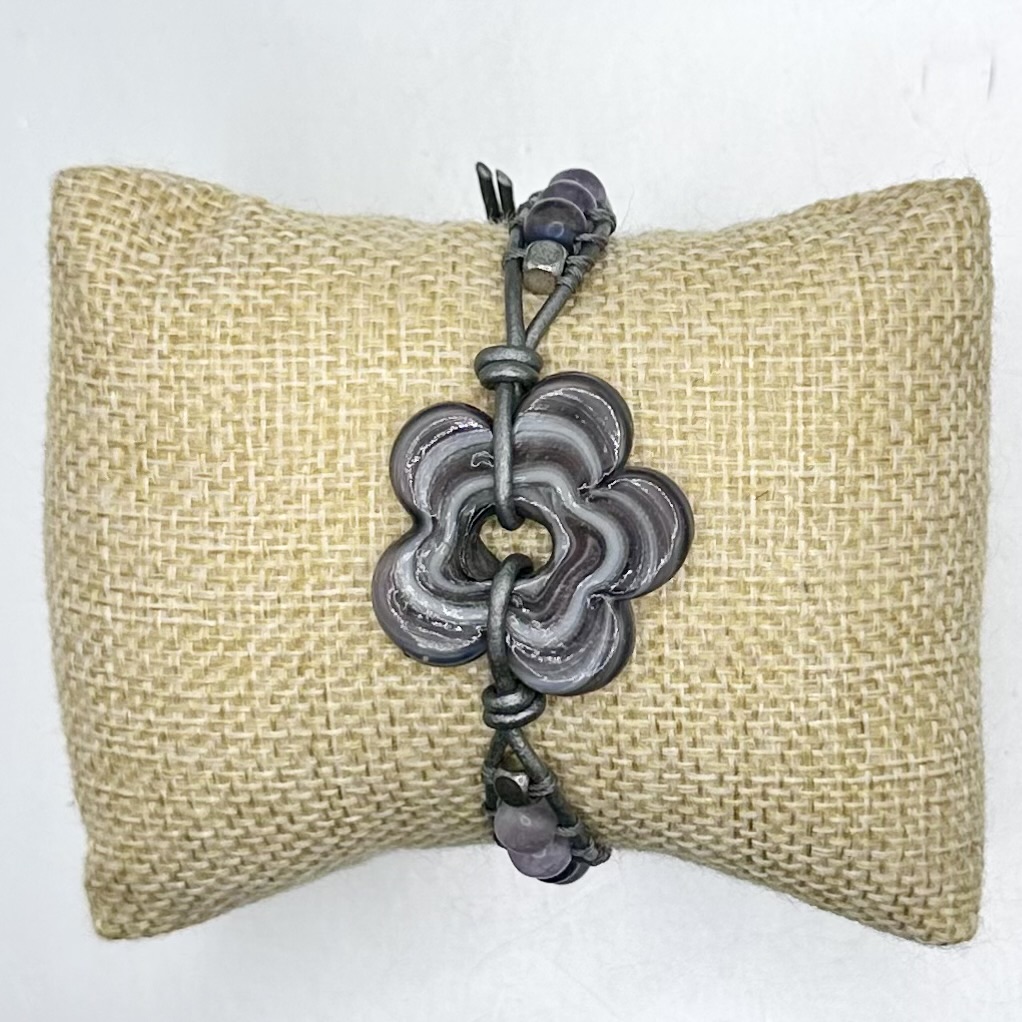 This handcrafted wrap bracelet brings together Hand Blown Venetian Glass with Matte Amethyst Semi-Precious Stones. A Grey tone Venetian glass flower, takes center stage in this stunning one of a kind bracelet.
