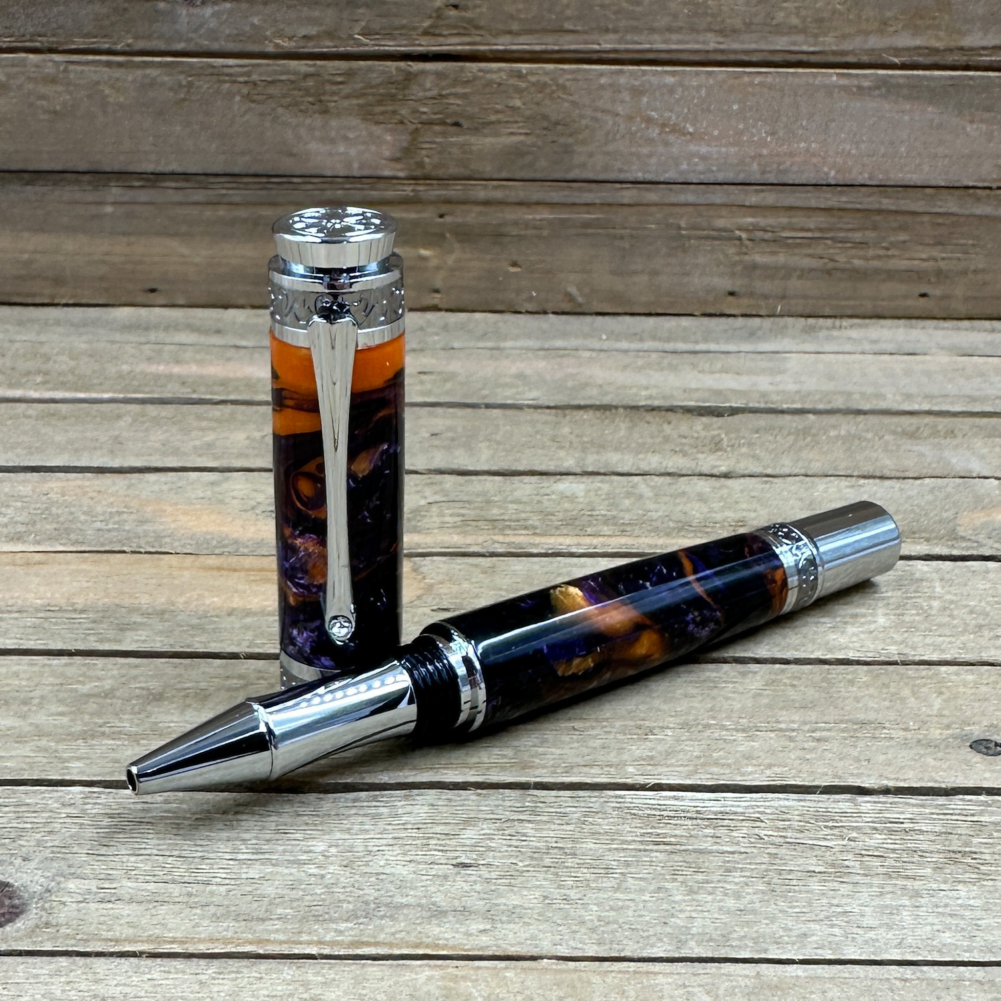 This custom poured resin rollerball pen is a one of kind. This "Full Size Chieftan" style rollerball pen was crafted in Michael's woodshop and features the following: