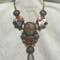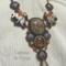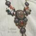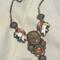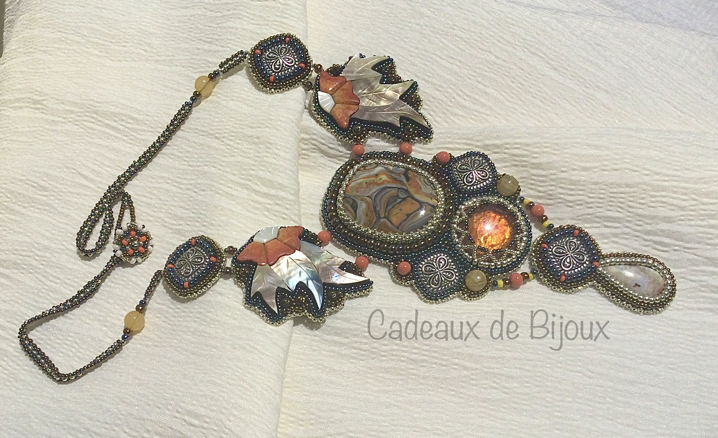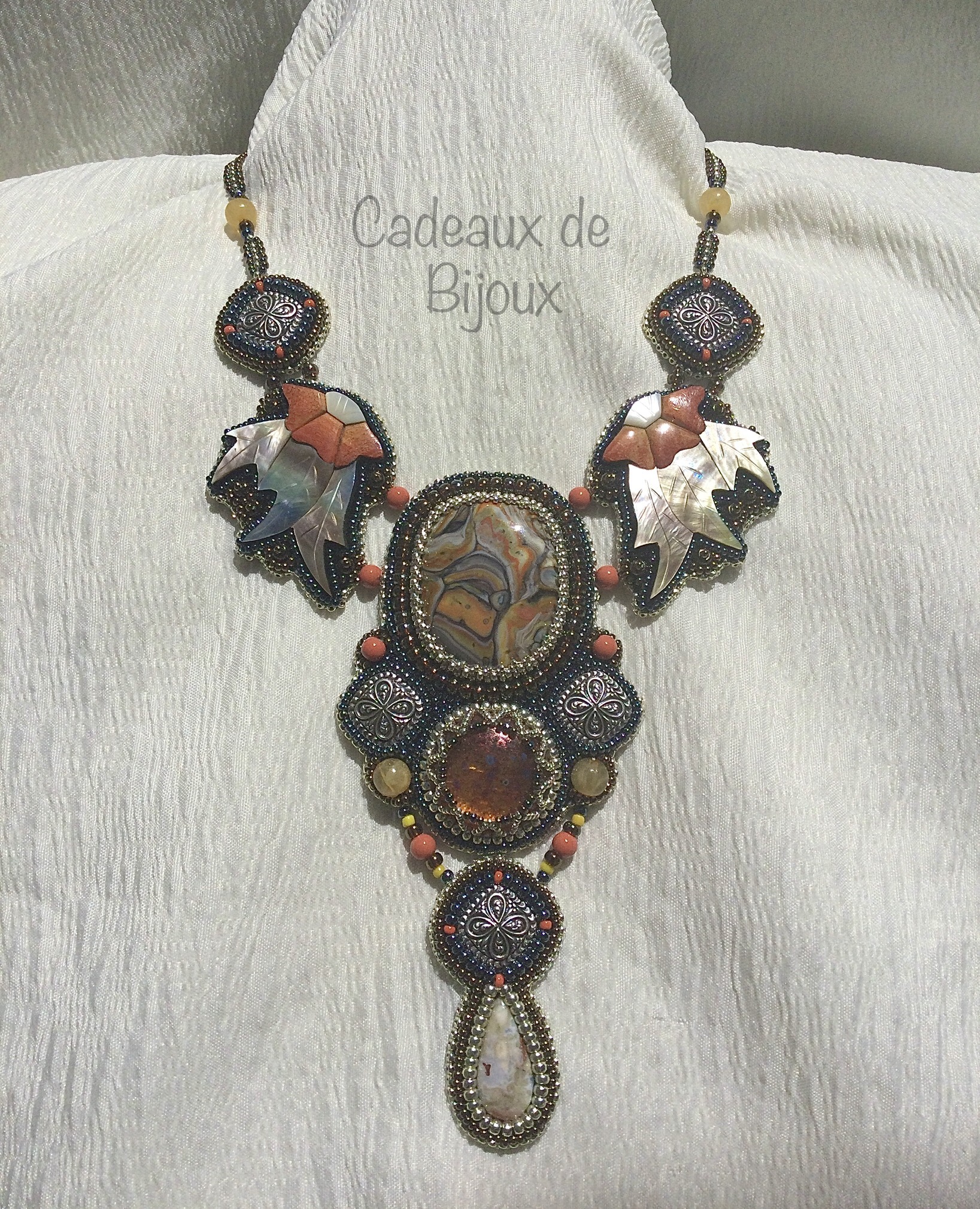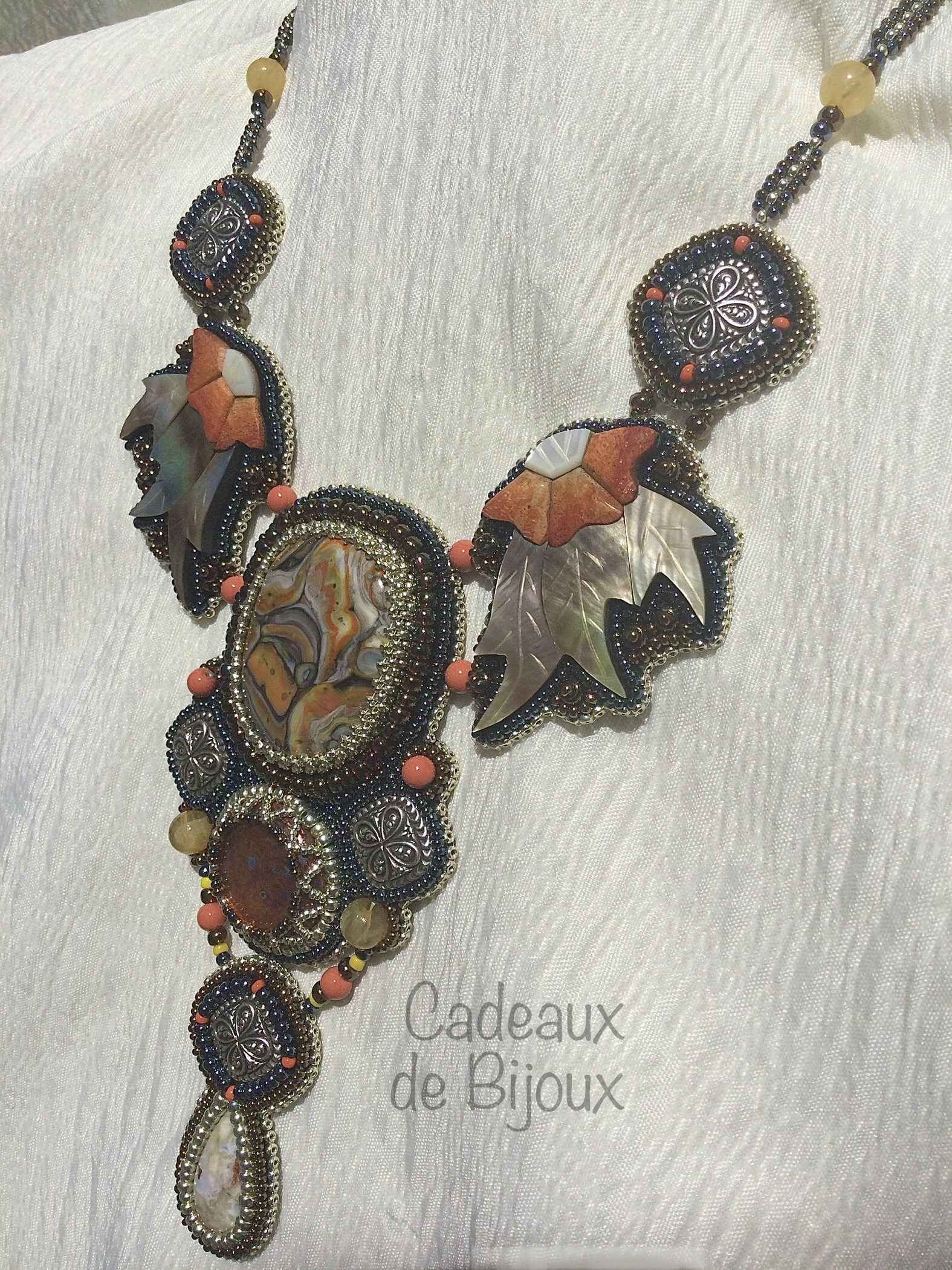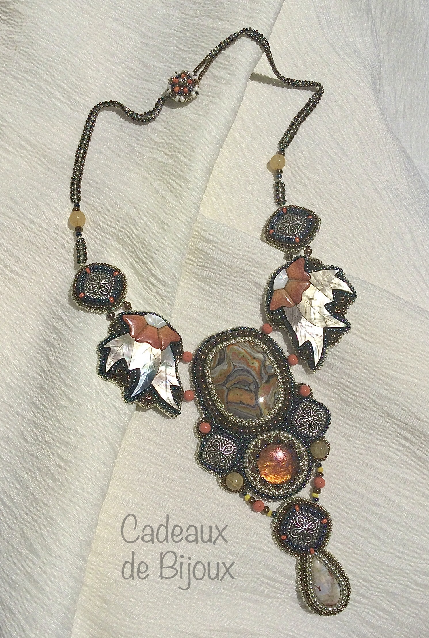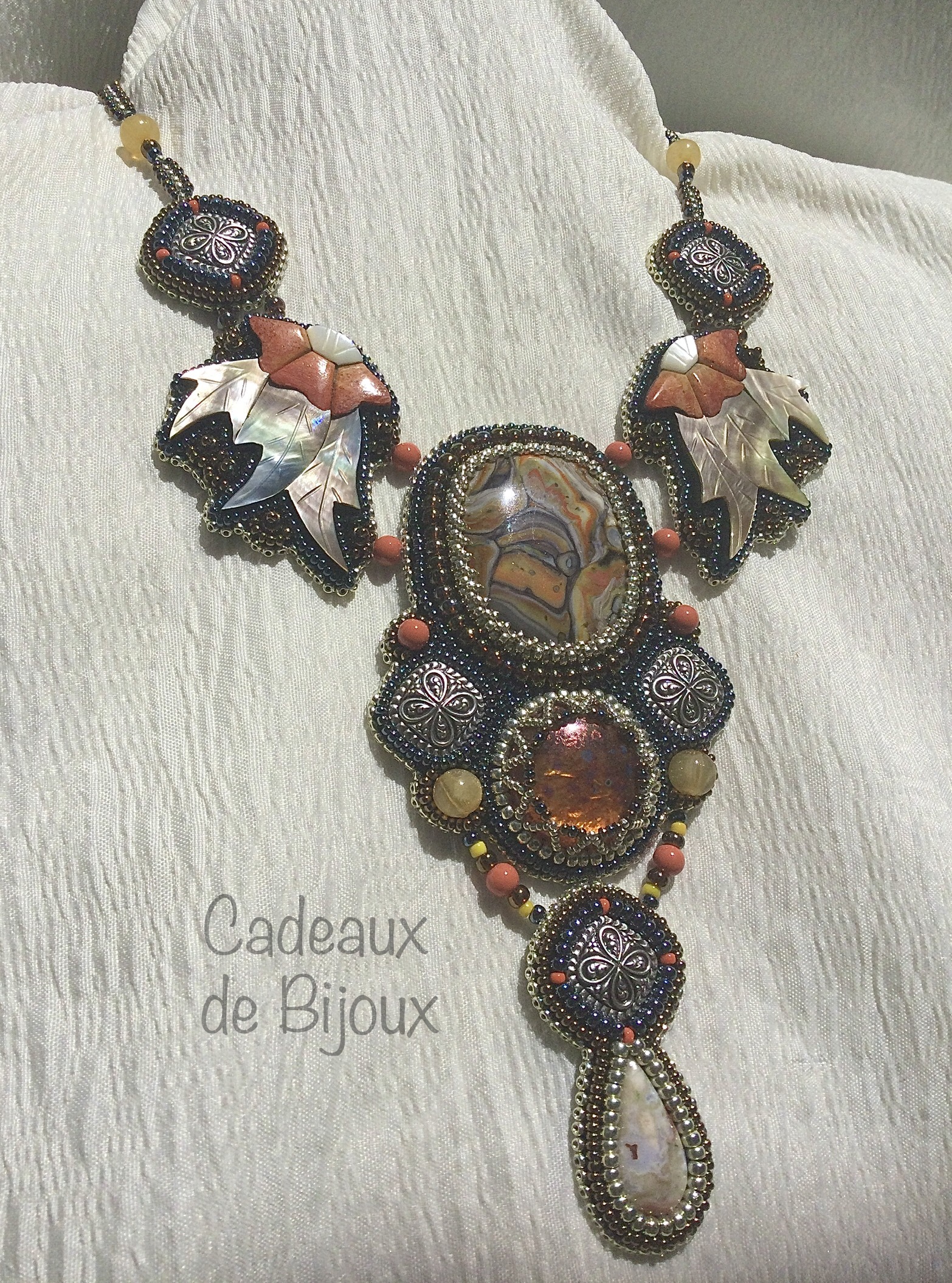 Glass cabochon focals, Czech and Japanese beads, natural agate, vintage shell and coral compositions, vintage metal filigree stampings.