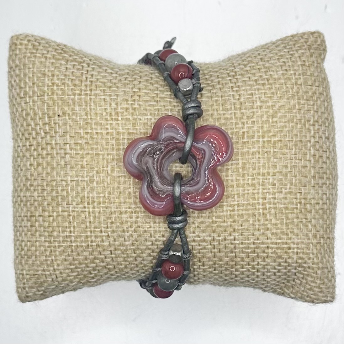 The handblown flower is anchored by supple genuine sliver leather cord, wrapped and knotted with intention, offering a relaxed, free-spirited fit.
