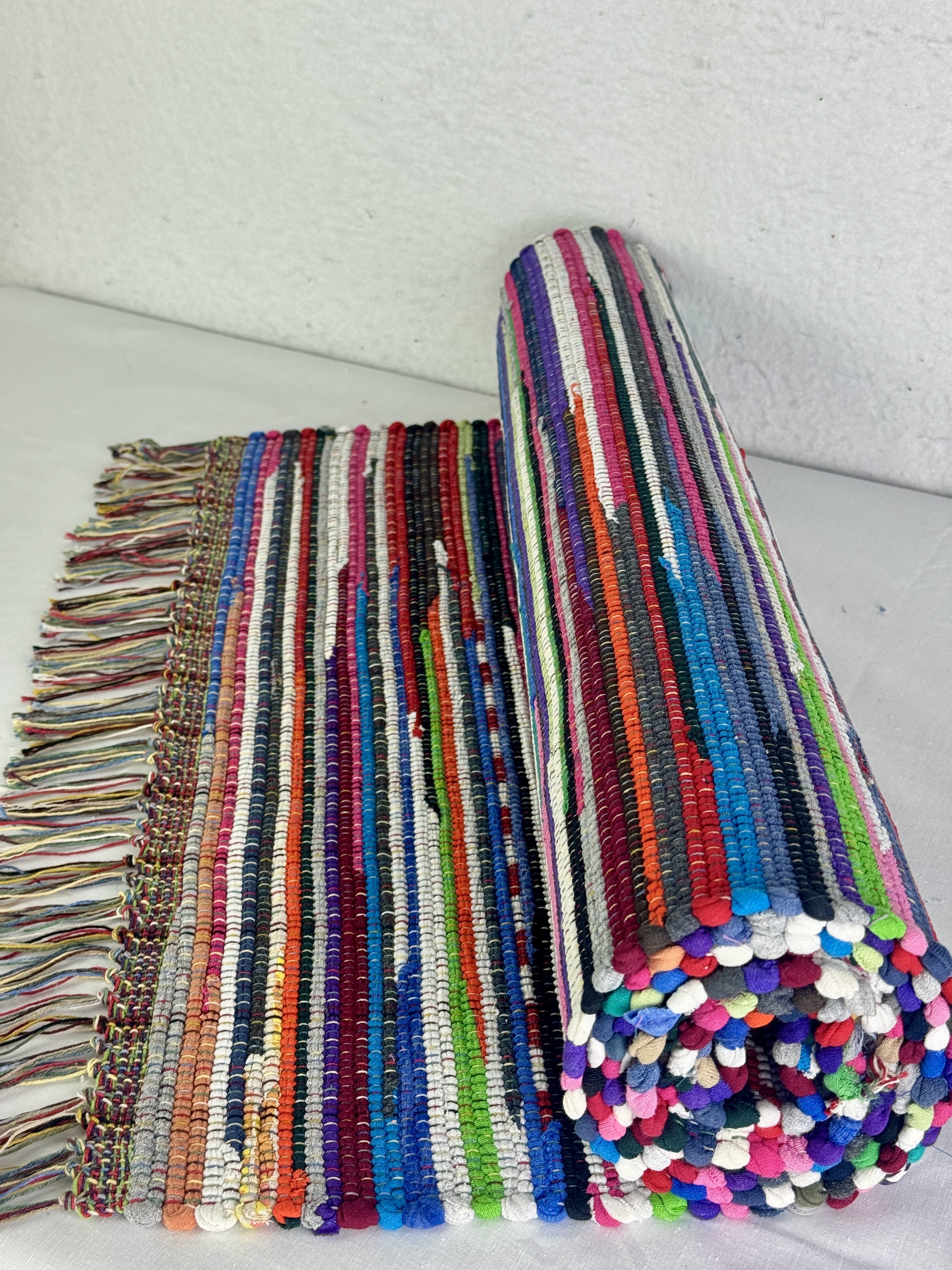 Every rug is meticulously handwoven on my trusty two-harness loom. I pour my passion and attention to detail into each weave, ensuring a quality that transcends trends. The impeccable straight edges and tightly woven strands are testaments to my dedication, while the variety of warp colors allows me to create pieces that complement any aesthetic, from modern minimalism to vintage charm.