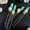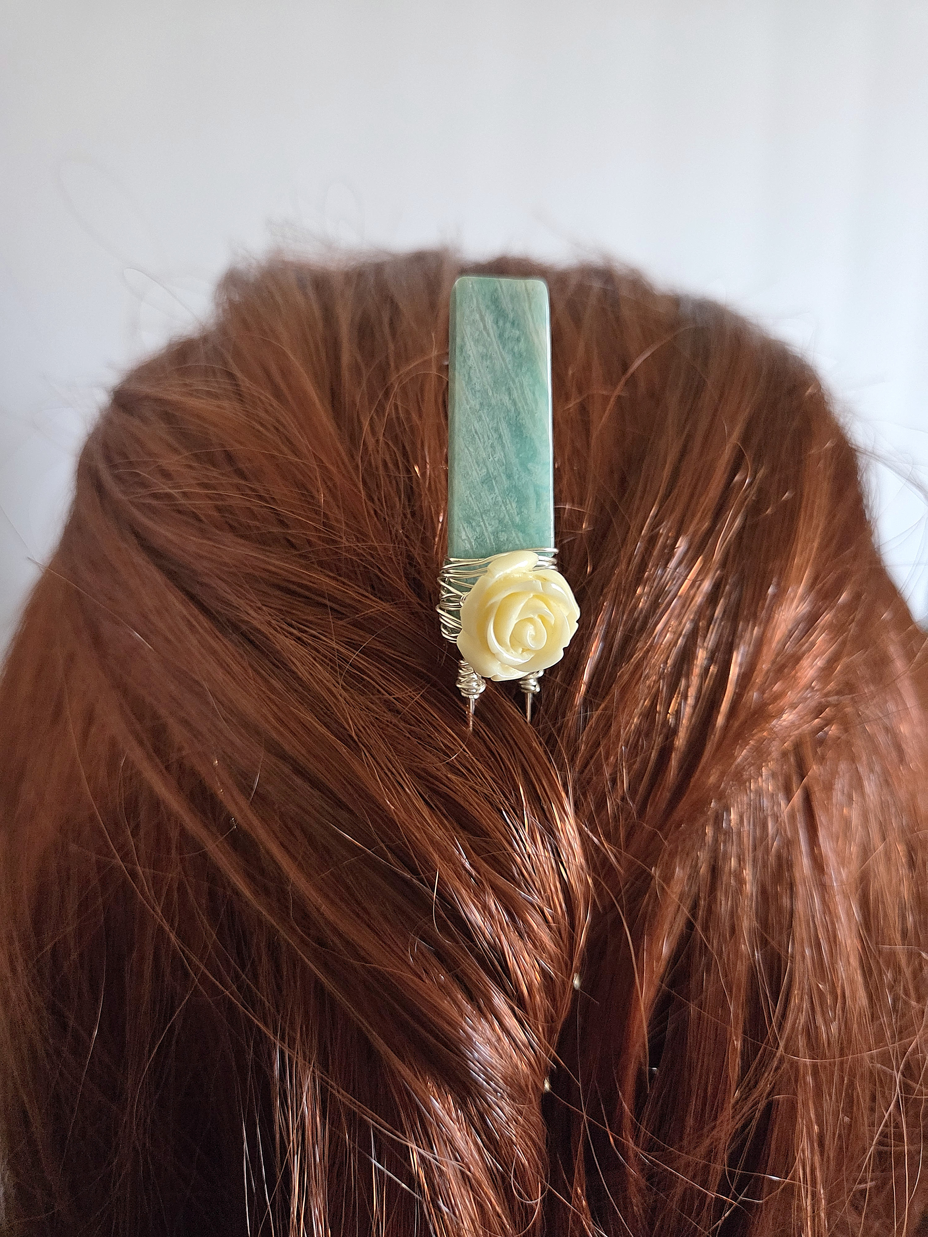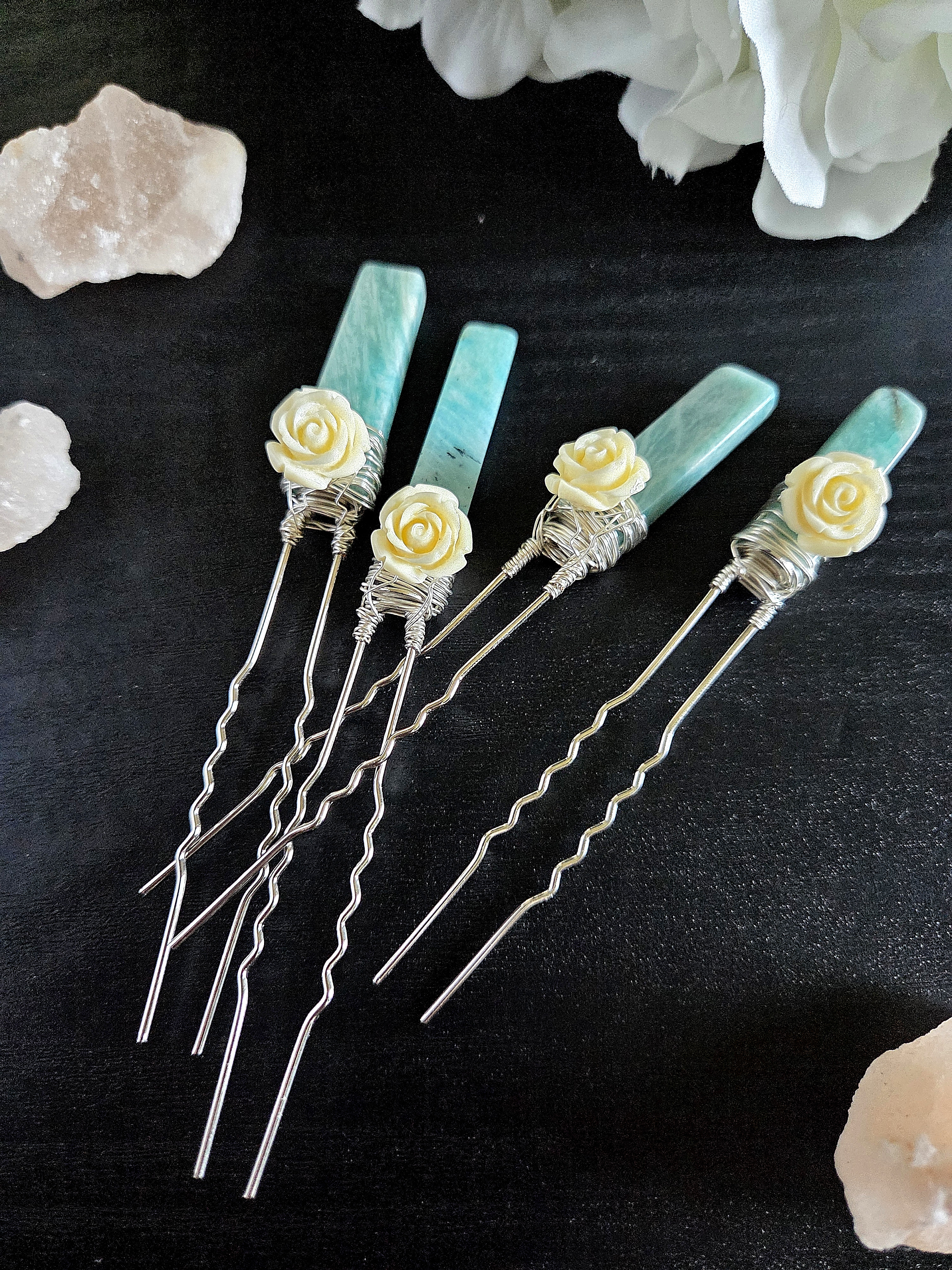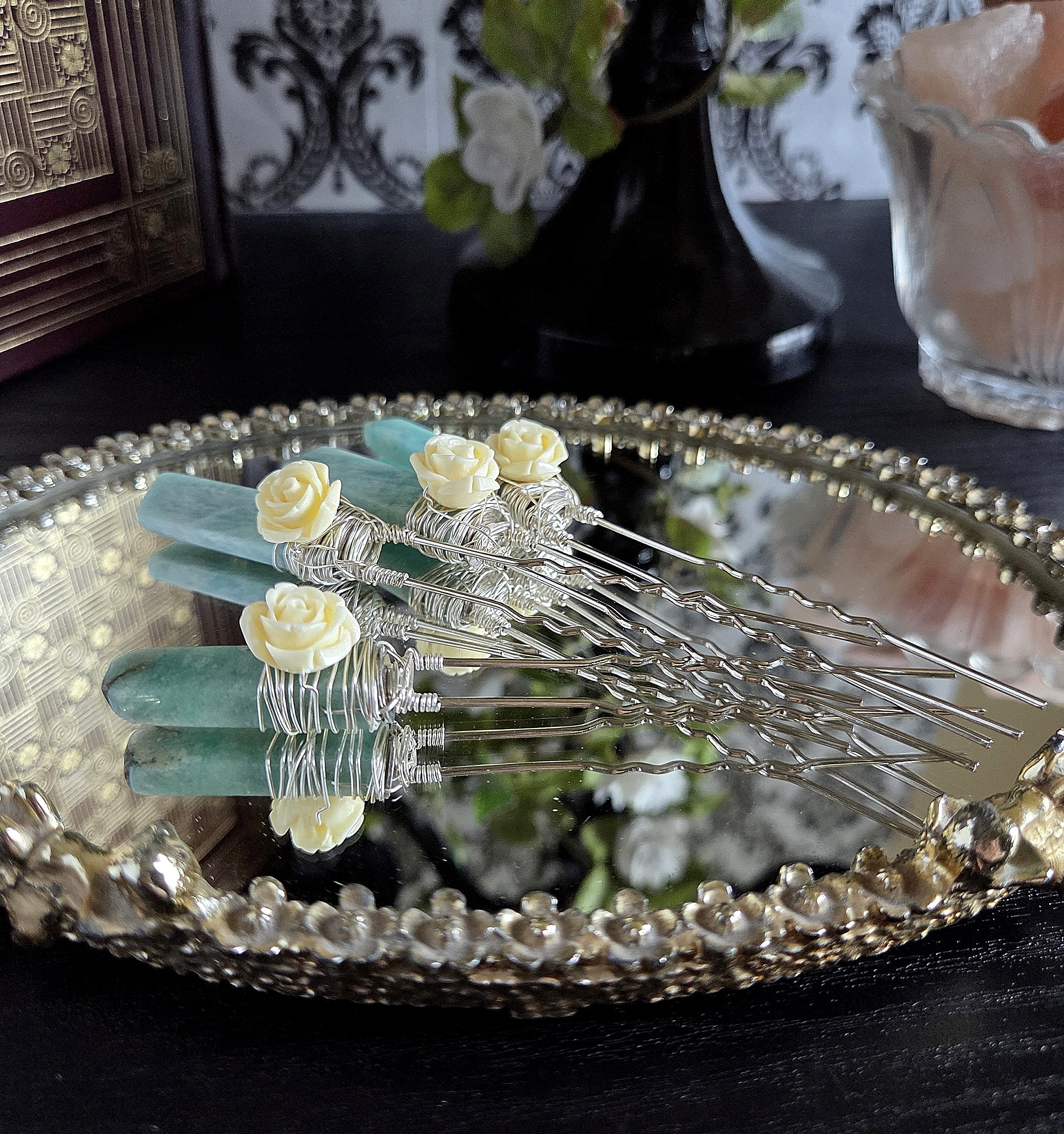 This set of four handmade Amazonite hair forks brings a graceful balance of vintage romance and modern style to your hair. Each 3-inch fork is wire-wrapped with a rectangular Amazonite stone, its cool green tones offering a touch of mystic beauty. To add timeless Victorian charm, a cream-colored rose bead decorates the front, making these hair accessories both practical and ornamental. The soft, dreamy color palette makes them perfect for special occasions, Renaissance or Victorian-inspired costumes, weddings, or simply adding an elegant accent to everyday hairstyles. Perfect for any mystical or Victorian aesthetic, these hair forks offer a unique blend of elegance and versatility for any occasion.