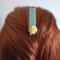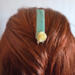 I took an Amazonite stick bead, turned it upside down and wire-wrapped it to the top of a pre-made hair fork. Before I finished off the wrap, I added a beautiful, cream colored reconstituted stone rose bead to the front, then finished off the wrap to hold it all in place.