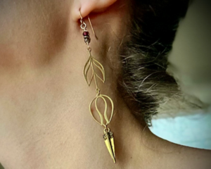 Gunmetal face chain with a sterling antler focus and iridescent drip.