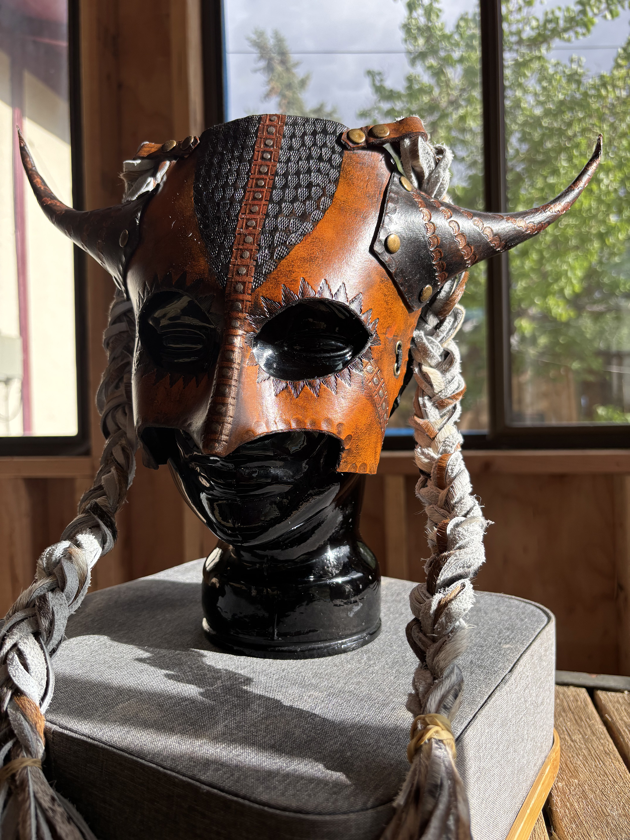 "Braided Guardian" is hand-tooled and painted leather mask in the viking style. Long suede strings are braided and set behind the horns, brass fixture, and studs hold the pieces together. Mask is cut from vegetable-tanned leather and hand stained in natural colors. One size fits most, flexible, adjustable, discreet elastic strap. All my work is one of a kind, hand-formed and tooled, no two masks will ever be the same. *shipped with extra elastic