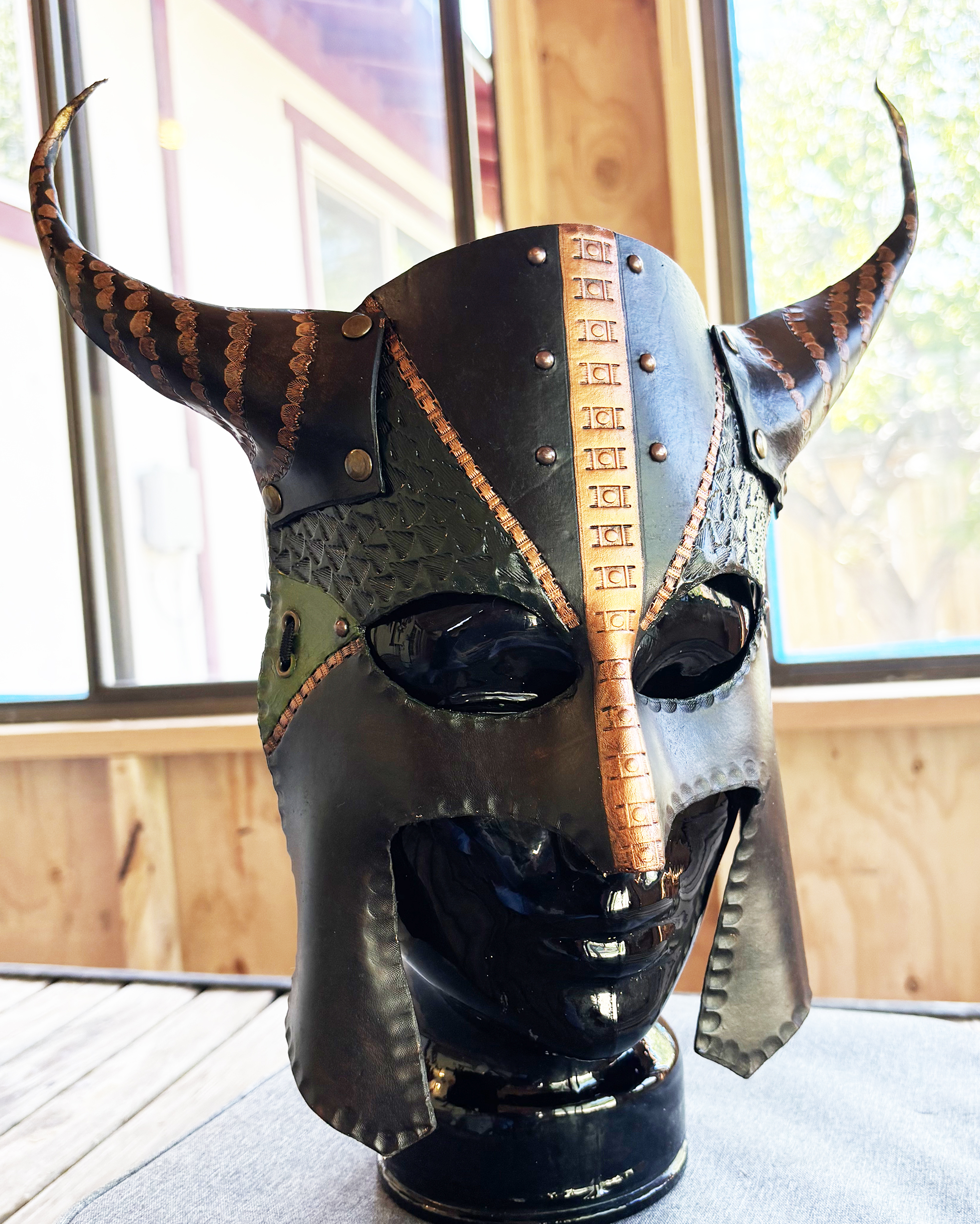 "Forest Guardian" is hand-tooled and painted leather mask in the viking style. Brass fixture, and studs hold the pieces together. Mask is cut from vegetable-tanned leather. One size fits most, flexible, adjustable, discreet elastic strap. All my work is one of a kind, hand-formed and tooled, no two masks will ever be the same. *shipped with extra elastic