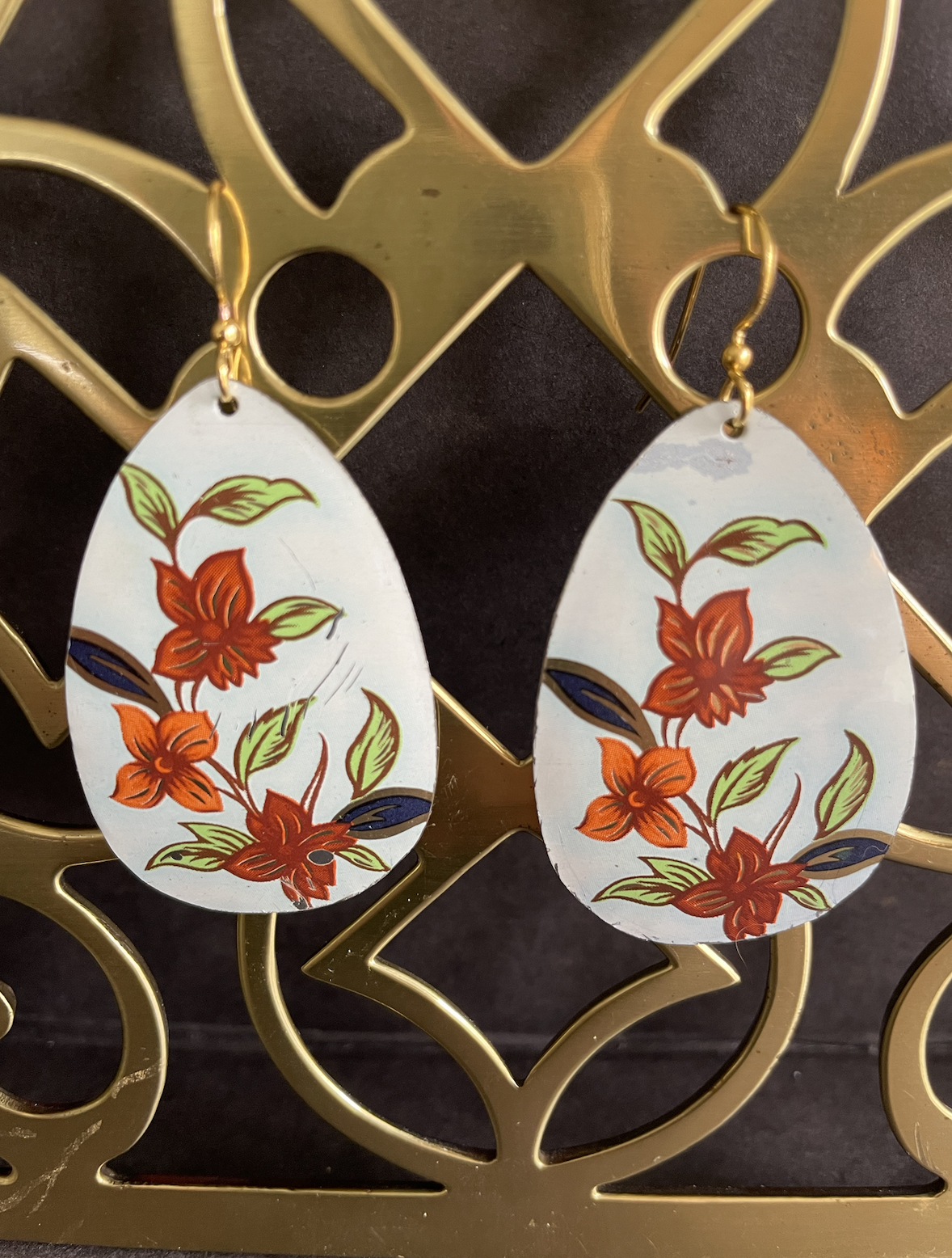 Tins are very light making them ideal for earrings as they don't weigh down your ears as the day goes on. Did you know the proper term for working with tin is "tinkering"? That made me really happy. I literally tinker in my art studio! I use old cookie tins, tea tins, and the like, break them down, and hand cut them into shapes and hand-hammer them into the 3-D shape I want them to be, finish and polish them, before putting them together like any other jewelry.