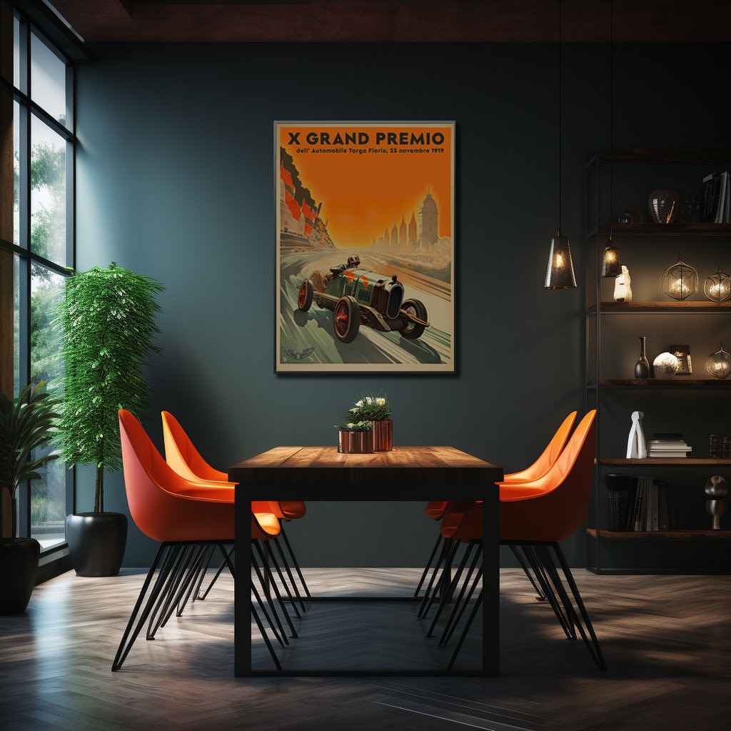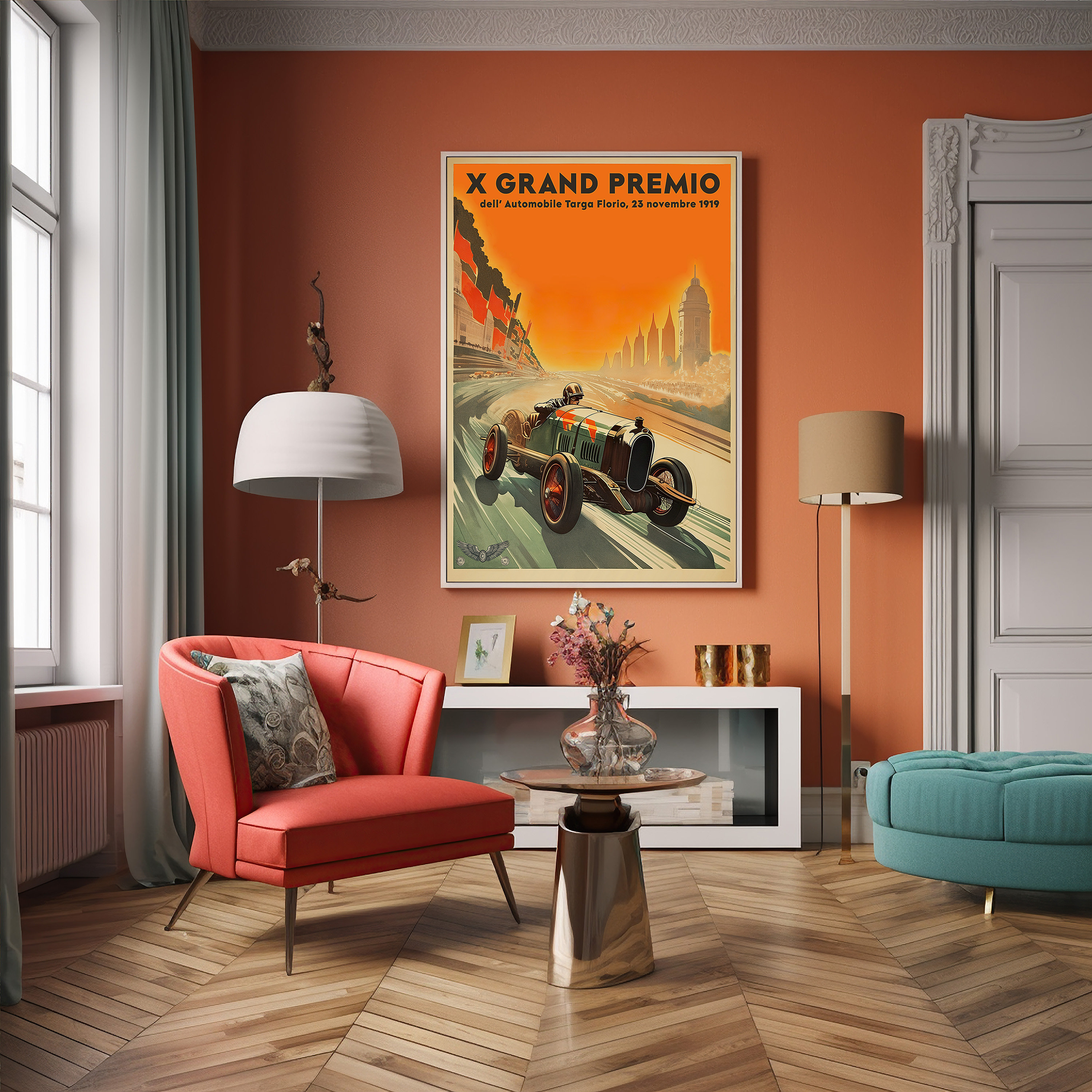 Embrace the spirit of the Targa Florio race and add a dash of motorsport history to your space. Don't miss the chance to own this beautiful and timeless piece of racing art. Order now and immerse yourself in the thrill of the open road and the excitement of the track with our Vintage 1919 Italian Grand Prix Racing Poster.