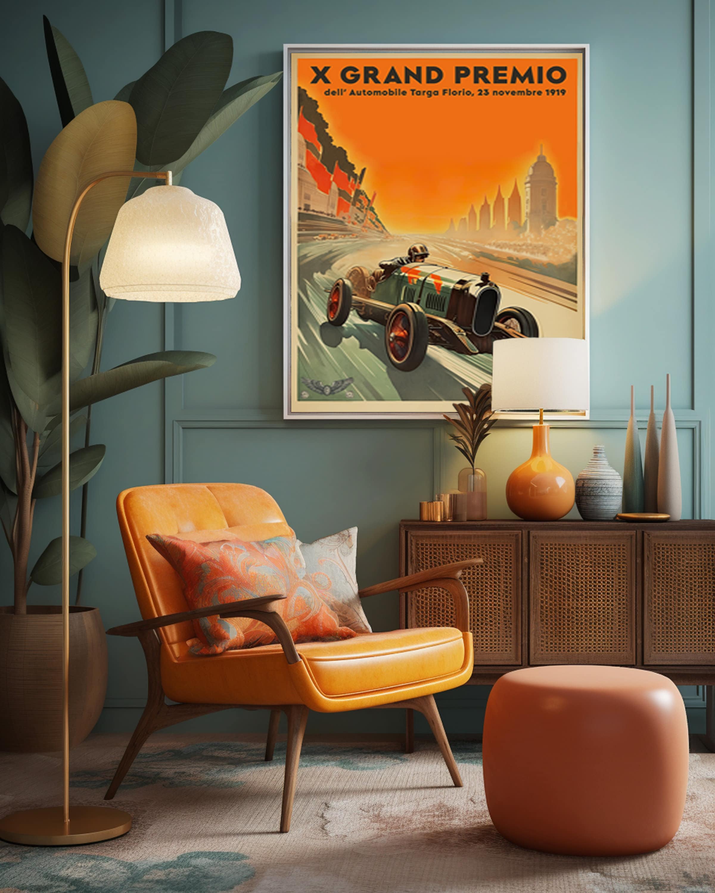 The dynamic design features classic race cars in action, surrounded by the picturesque landscapes of Sicily. The vivid colors and striking imagery bring the adrenaline-fueled moments of the Targa Florio race right into your living space or office.