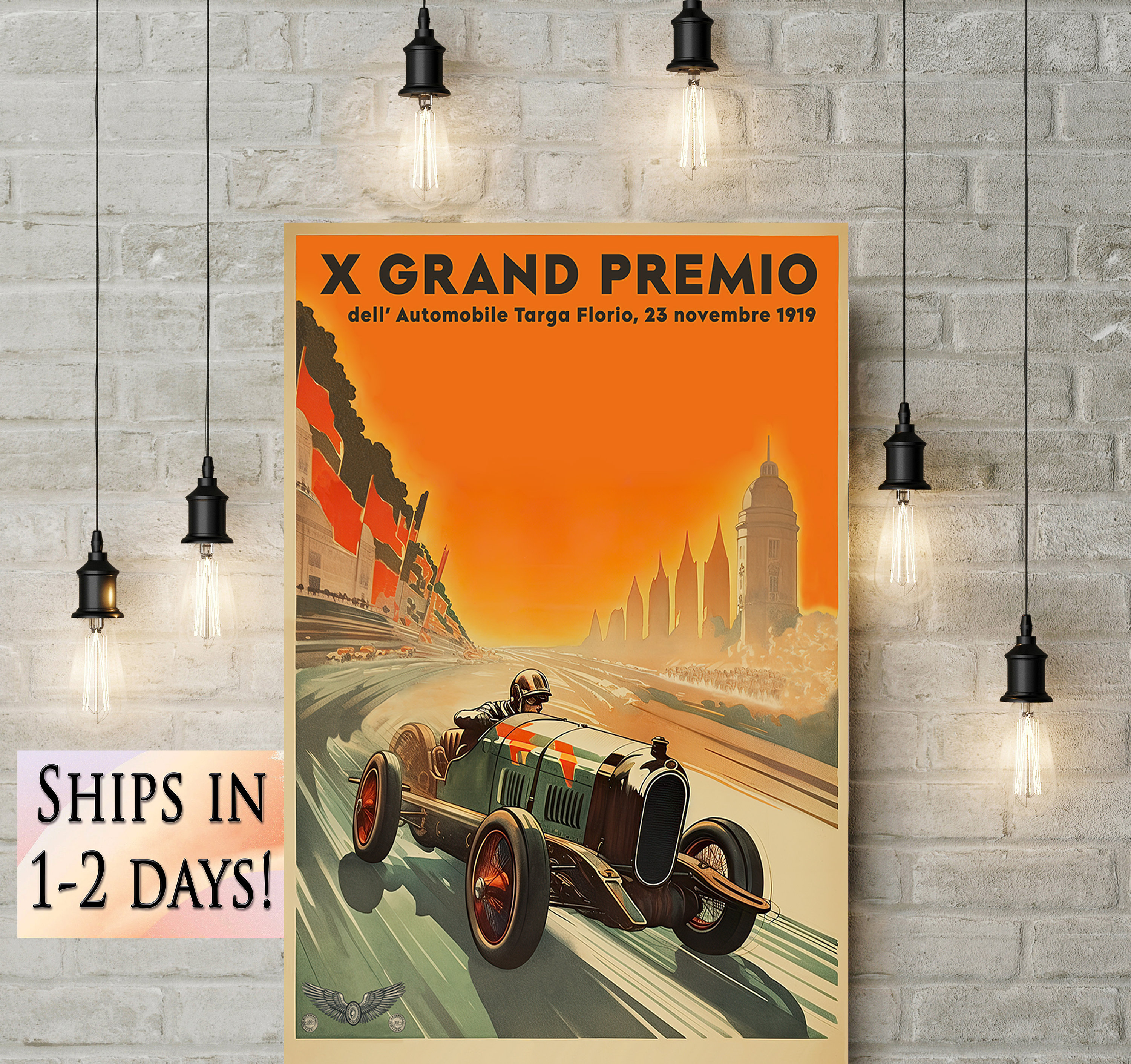 Surprise your loved ones, racing enthusiasts, or yourself with this exceptional piece of art. Our Vintage 1919 Italian Grand Prix Racing Poster makes for an ideal Race Fan Gift or a unique addition to any motorsport enthusiast's collection.