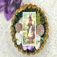 These beautiful magnets start off as plain tins. I use paint, dyes, glitter, and other products to create a colorful backdrop for the rest of the magnet. I layer florals, sprigs, and glittery bits then find a perfect vintage image to compete the magnet.