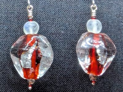 Vintage twisted glass beads in shades of black, red, and silver foil, with pearlescent carved glass beads and sterling silver combine to make a stunning pair of earrings that look substantial without weighing you down. Ear wires and findings are sterling silver.