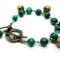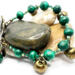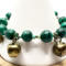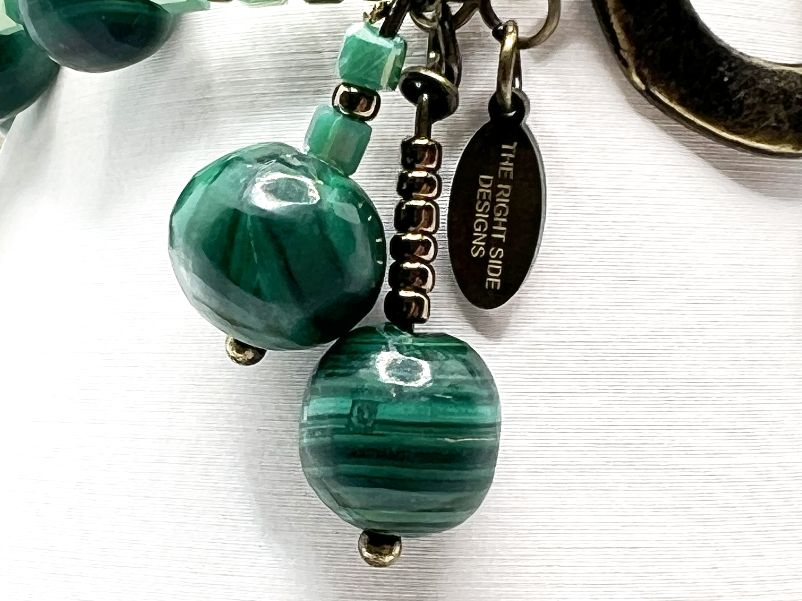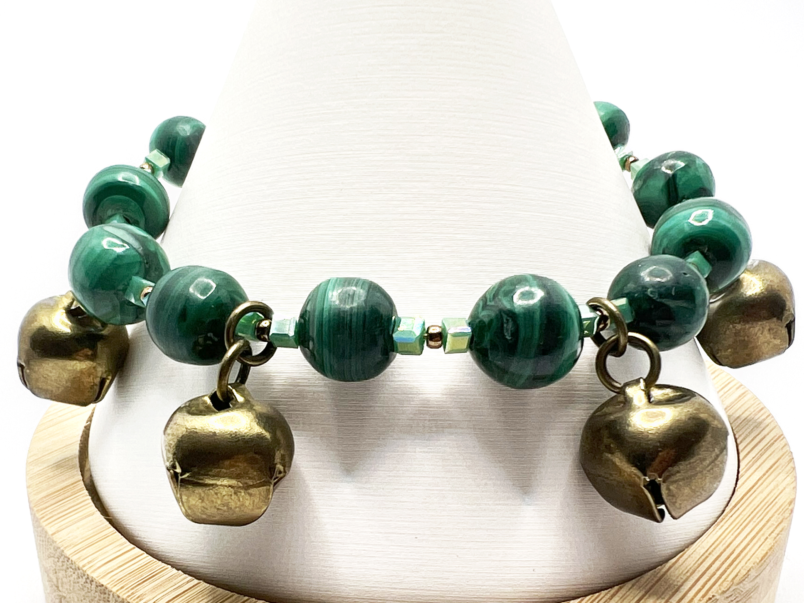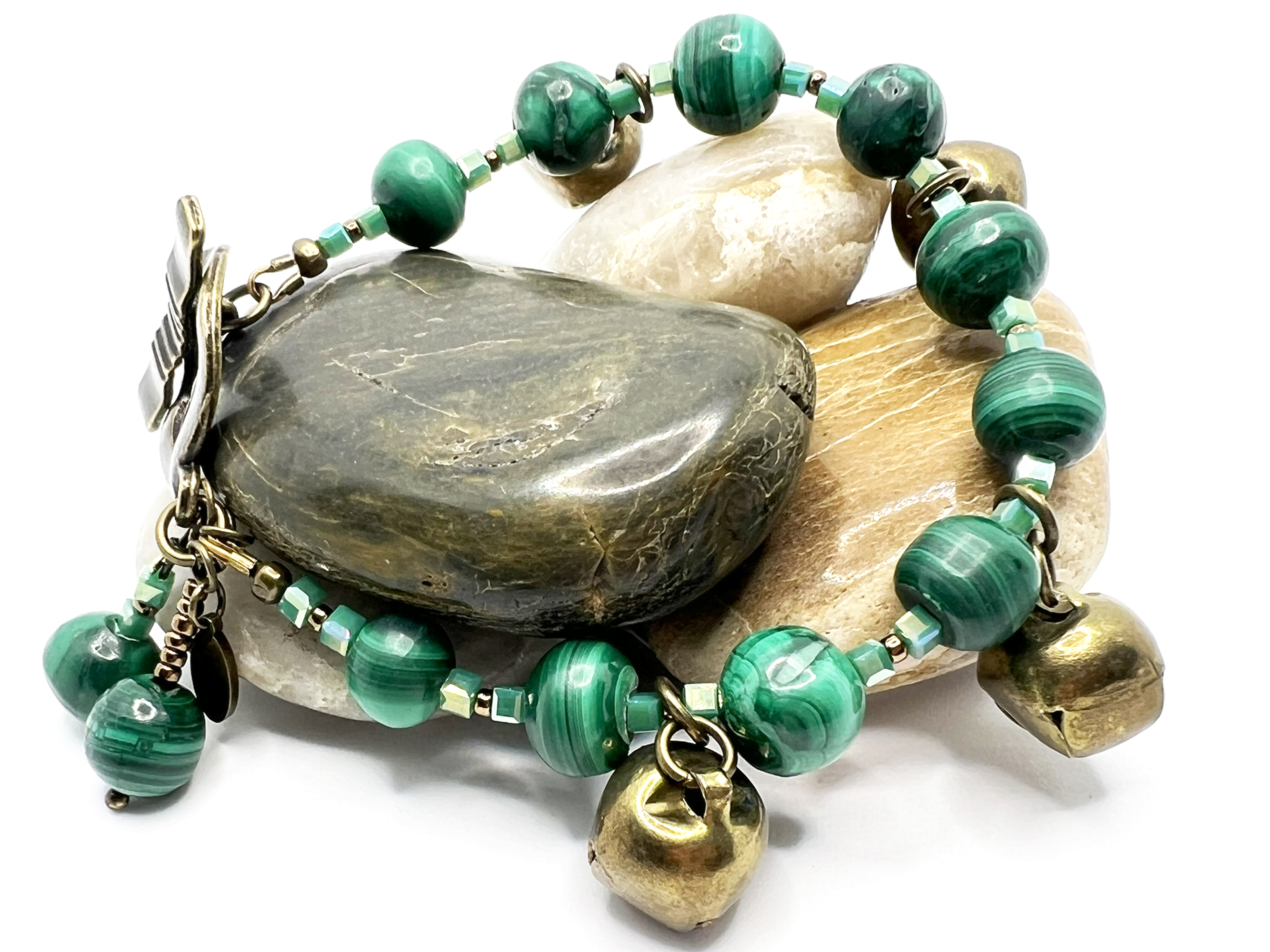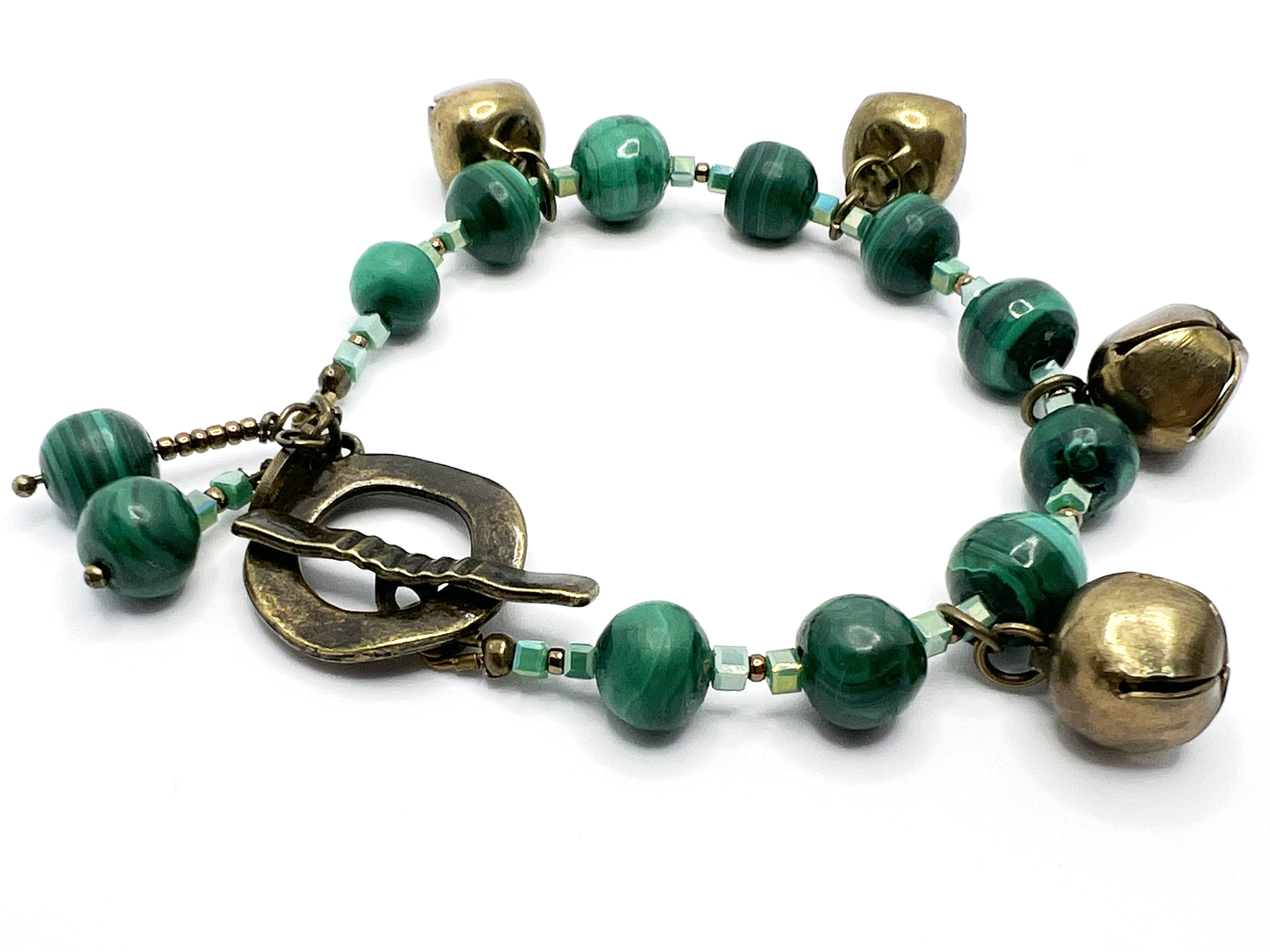 Bring festive charm to your holiday style with this beautifully handcrafted bracelet featuring vintage ceramic green beads ranging from 9–11mm, each showcasing unique tones and natural variations of green. Four 12mm bronze bells add a delightful jingle and a warm antique character.