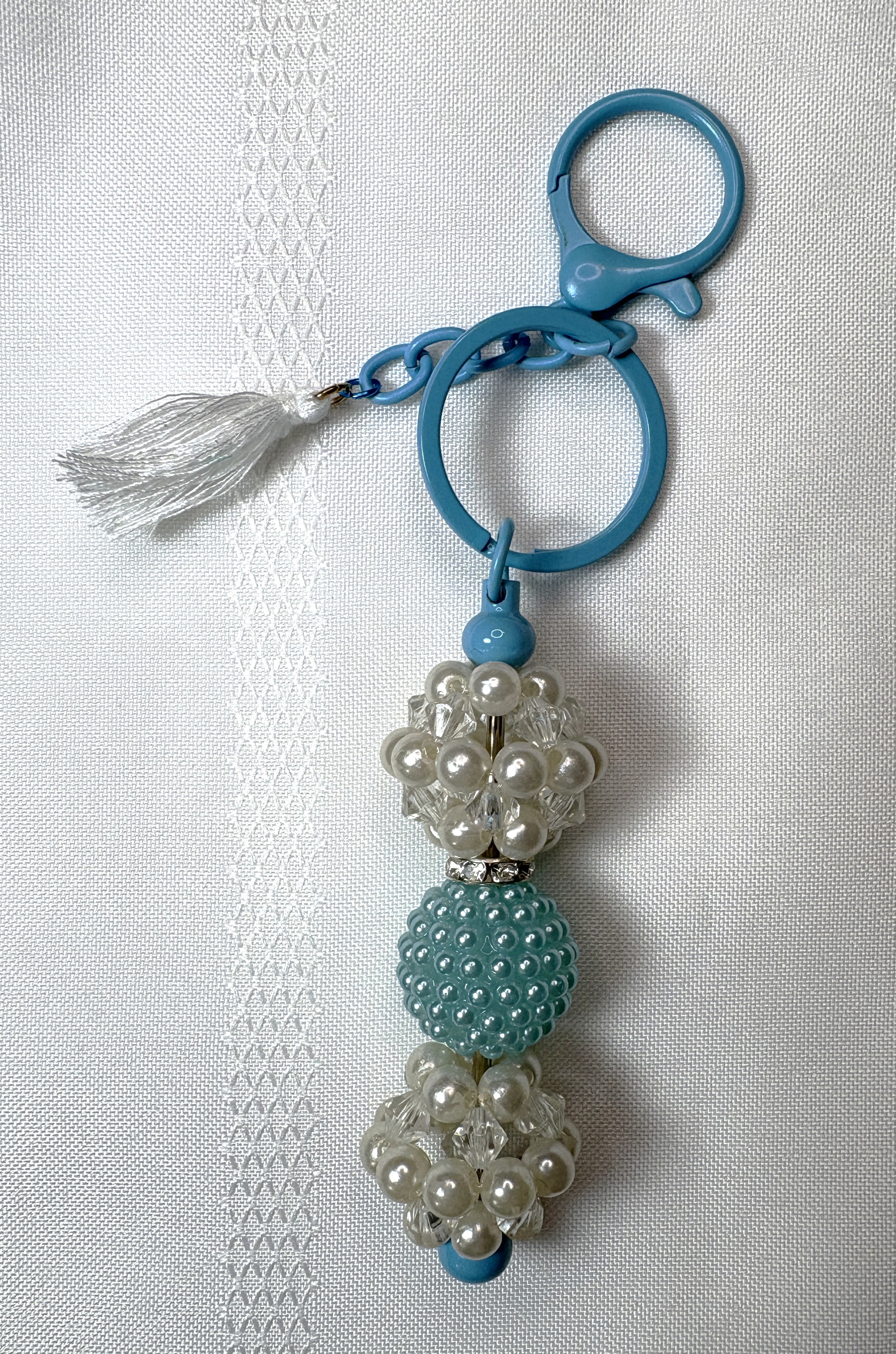 It's made with a blue keychain bar, 2 matching bubble style beads with acrylic round bead and a tassel