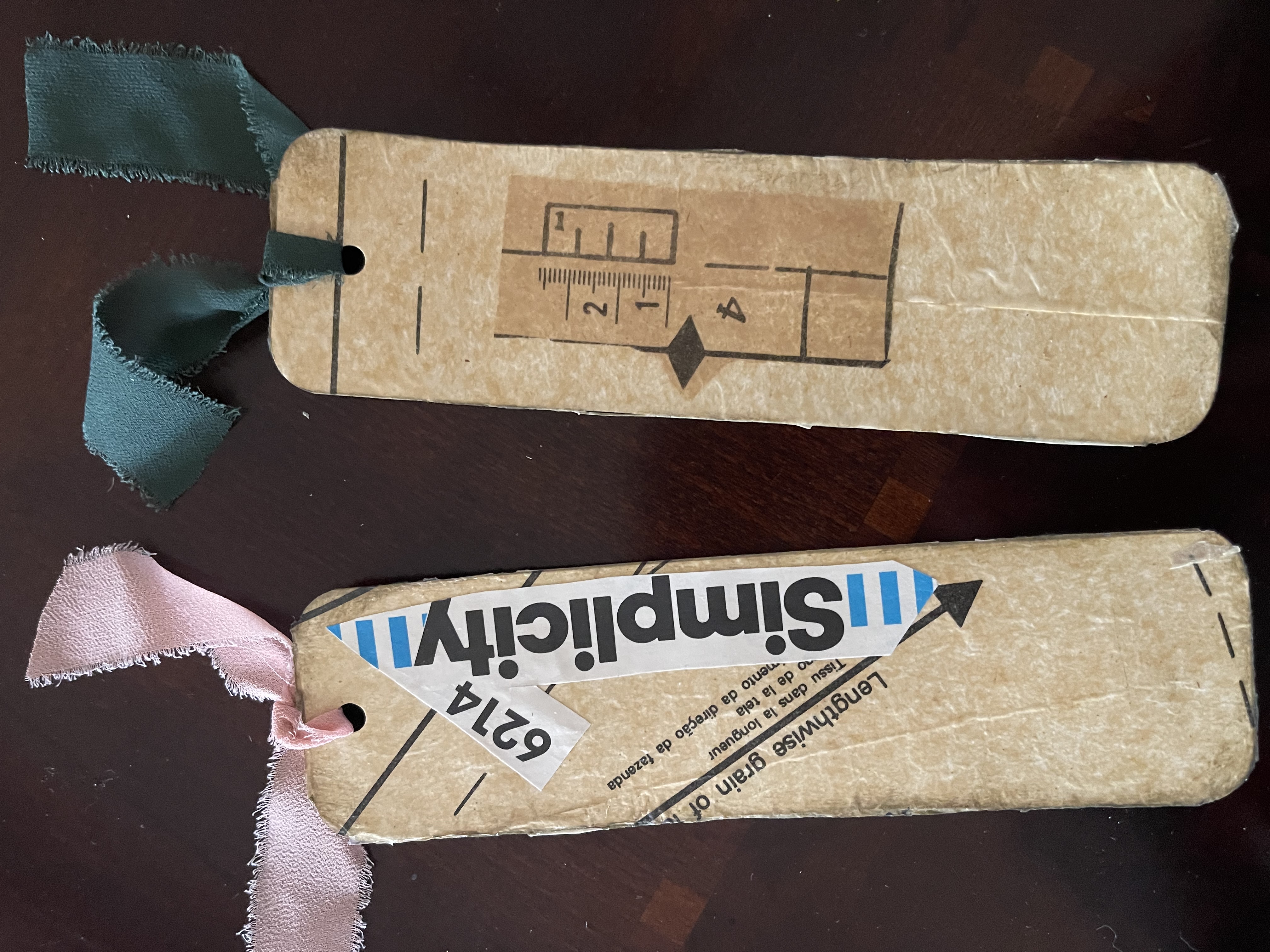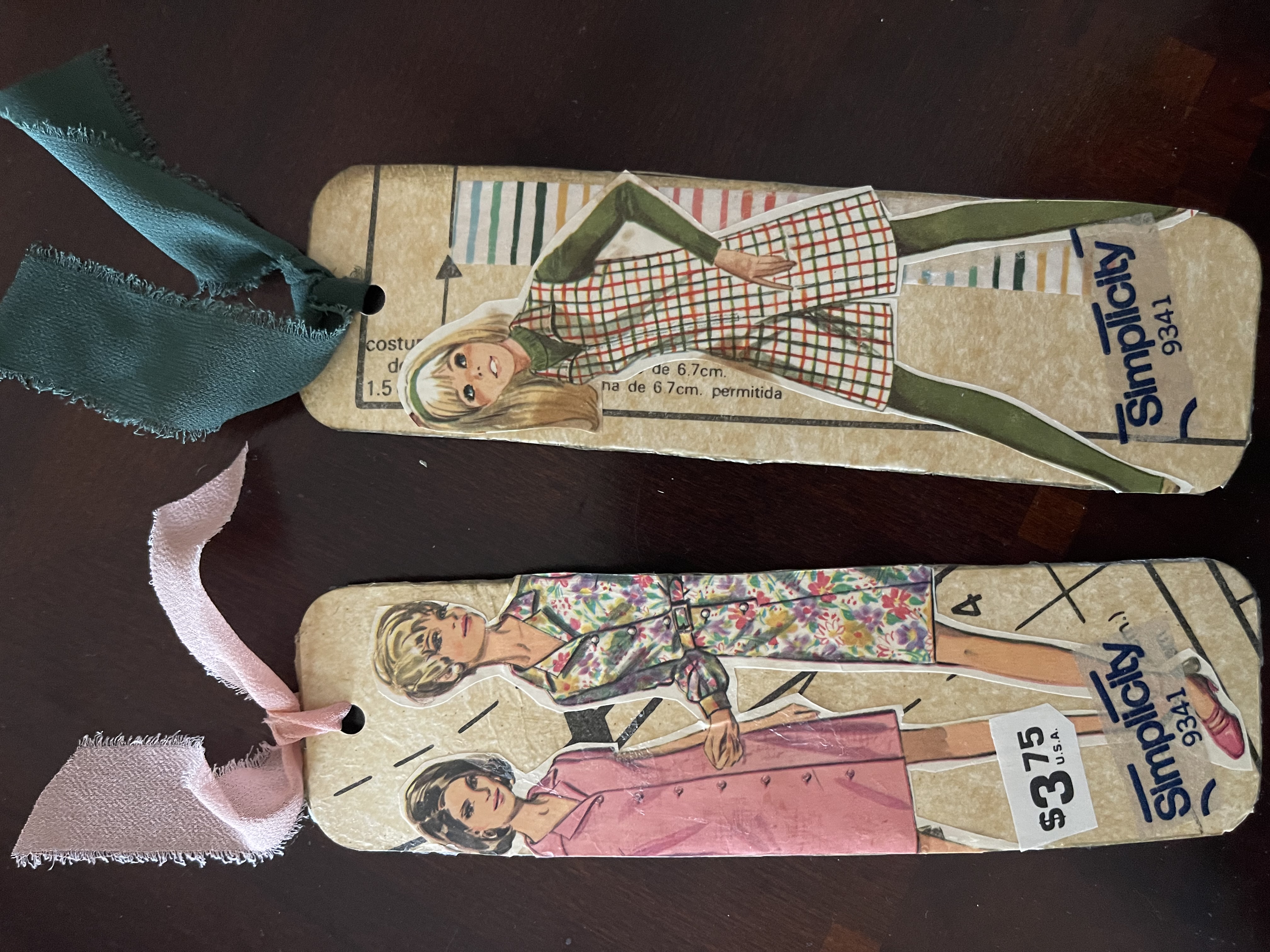This is a set of 2 bookmarks made from Vintage Sewing Patterns and adorned with a chiffon ribbon at the top.