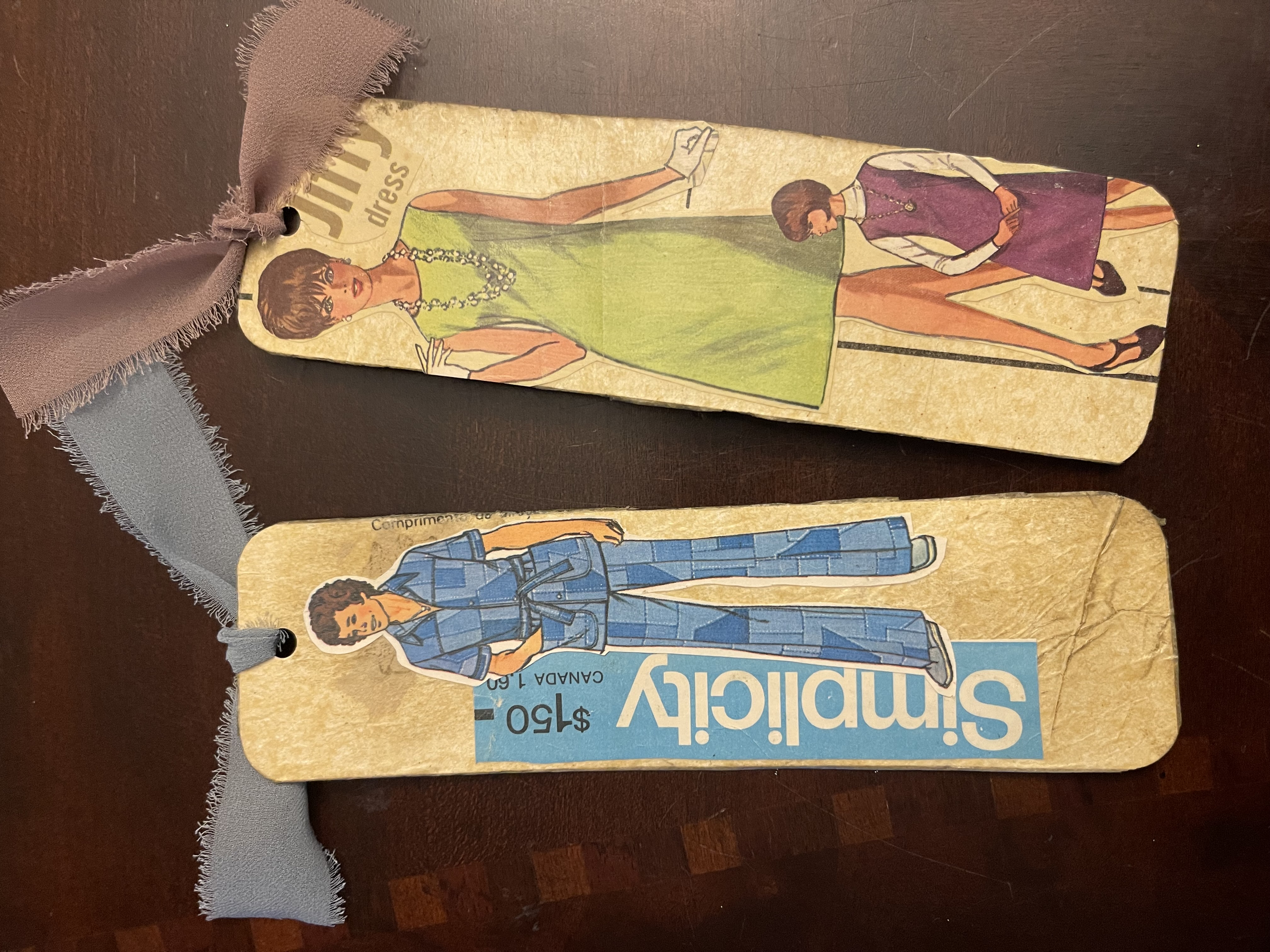 This is a set of 2 bookmarks made from Vintage Sewing Patterns and adorned with a chiffon ribbon at the top.