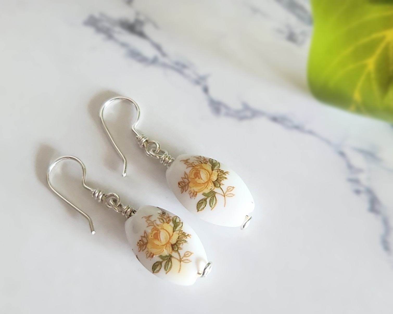 These earrings were made with 22 gauge Sterling Silver wires and vintage porcelain beads with a flower motif.