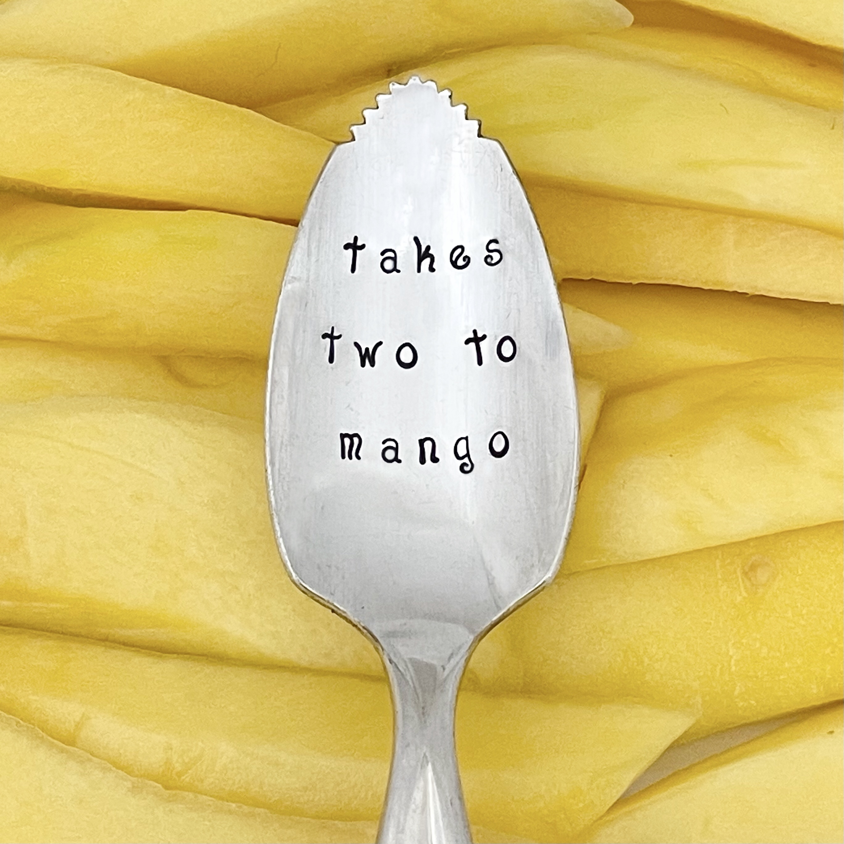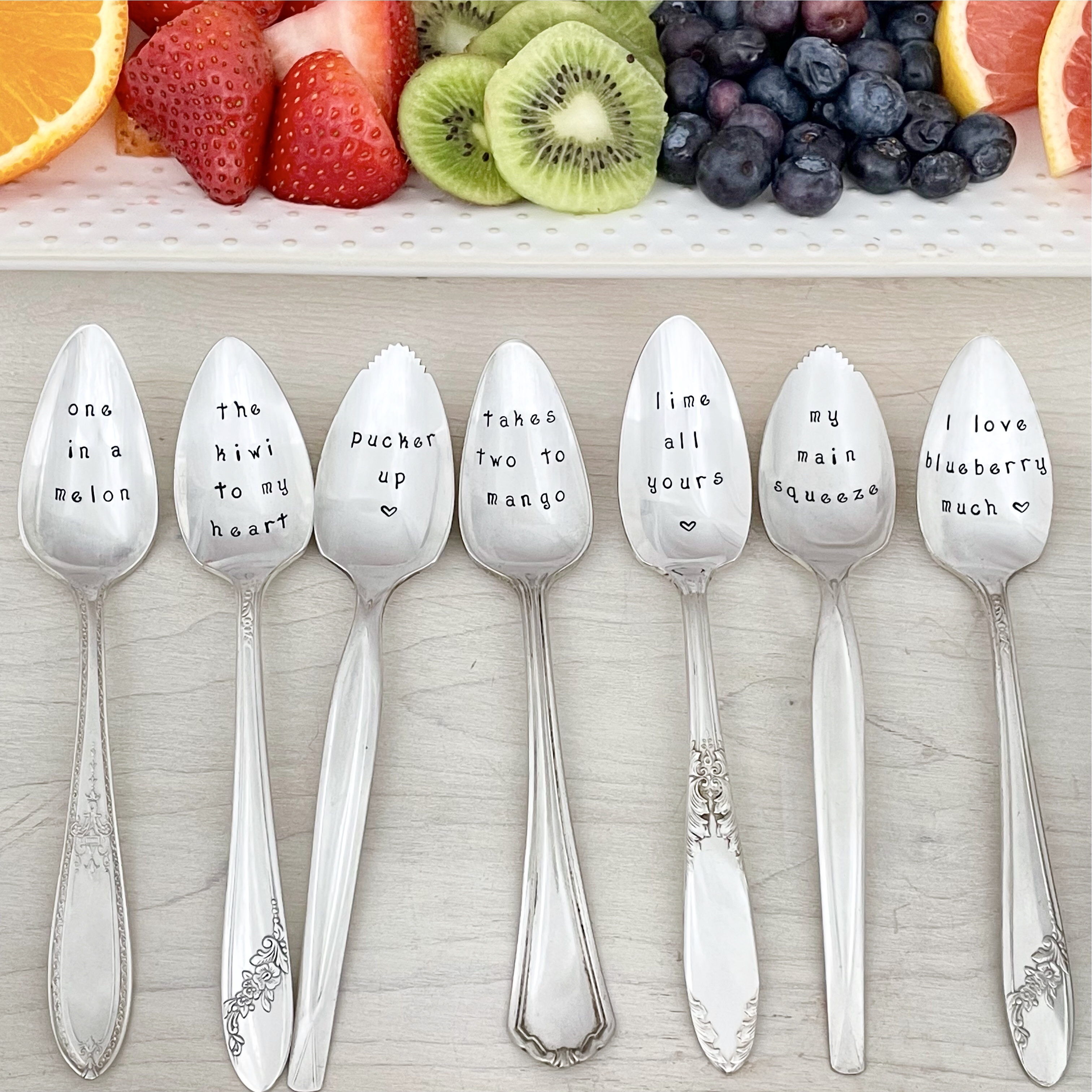 Vintage silverplate fruit spoons - hand stamped to bring a little smile to the table. Perfect for Sunday brunches, bridal luncheons, or a bit of fun in an ordinary Monday morning.
