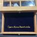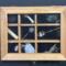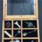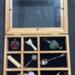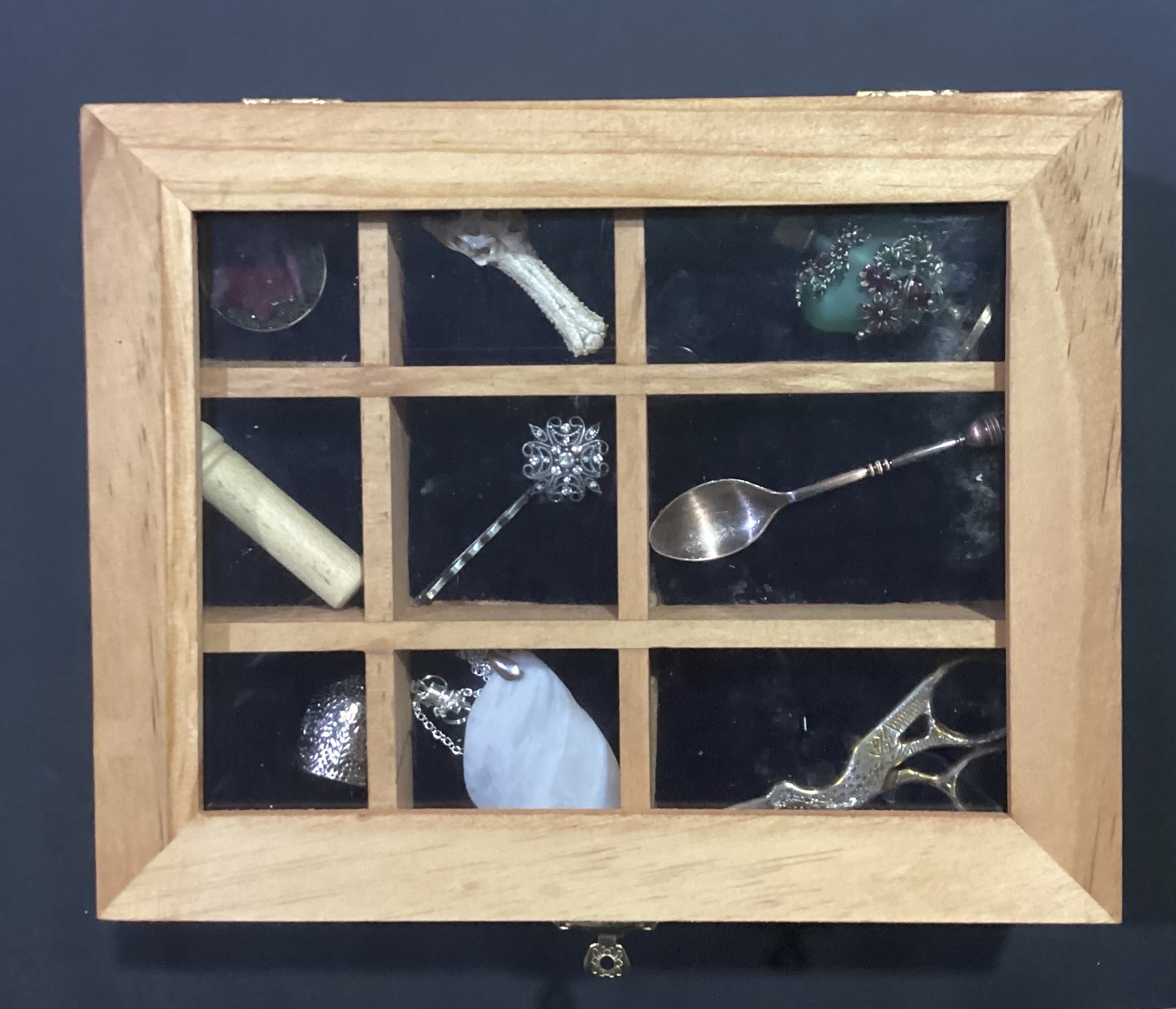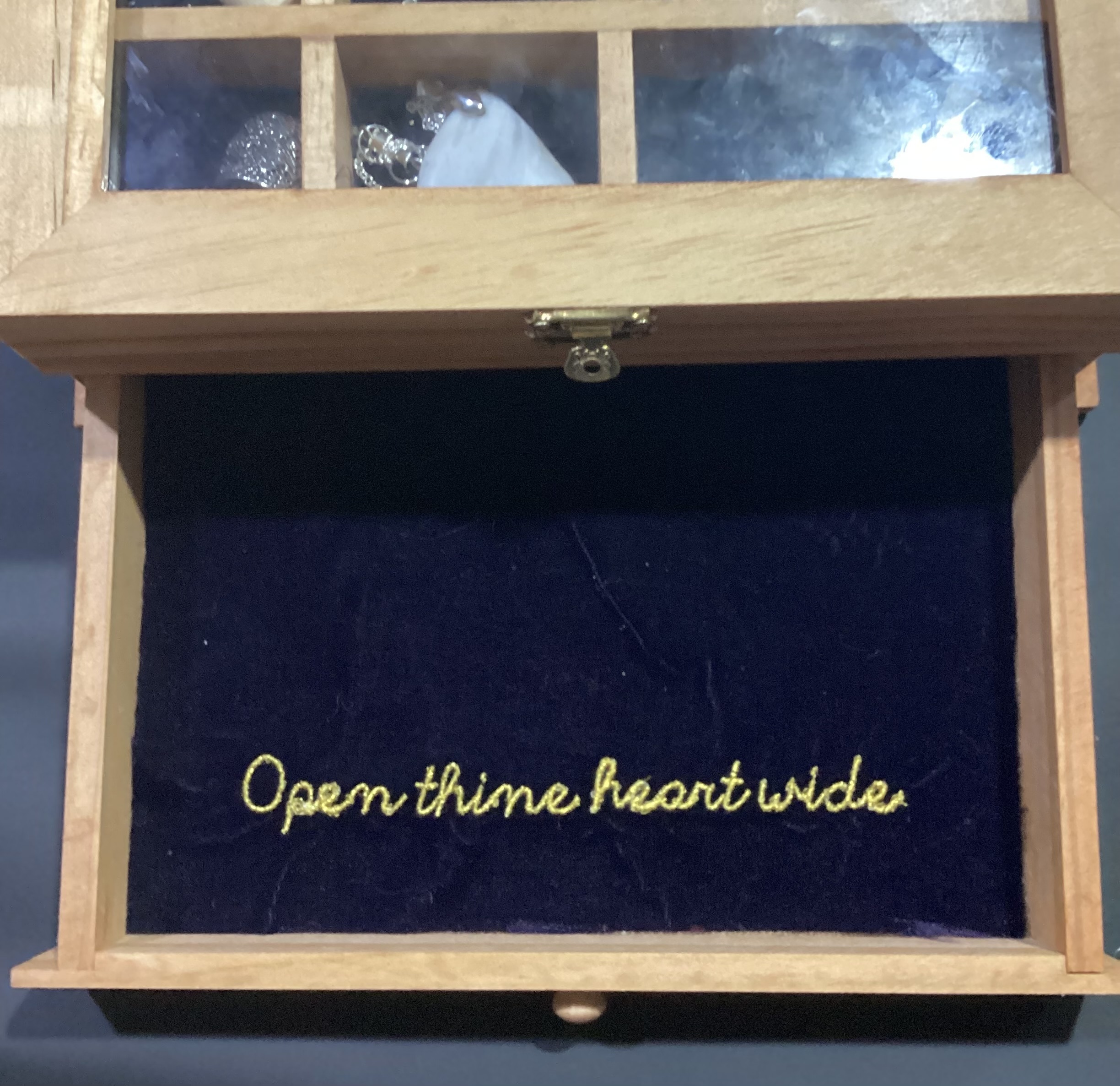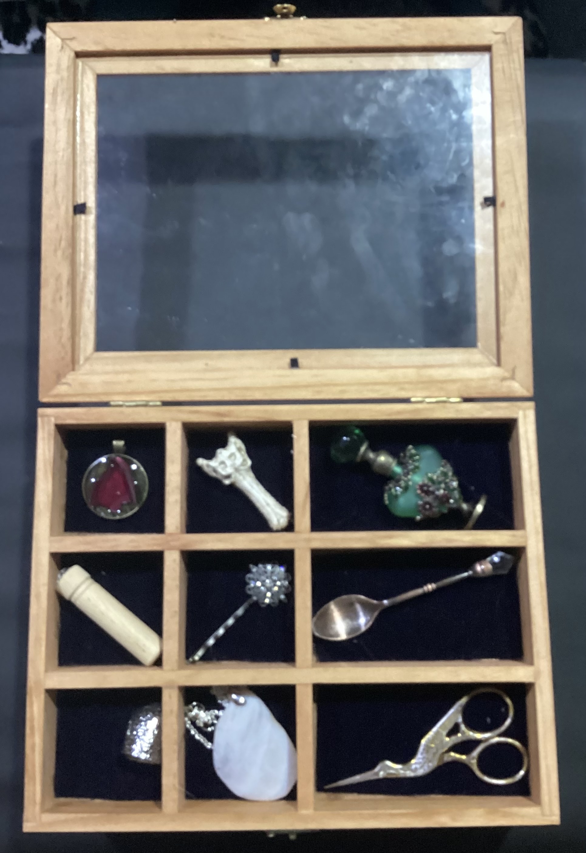 Light wood stained curiosity box with glass lid with a hinged lid and drawer. the drawer has the phrase “open thine heart wide“ embroidered with gold thread on dark purple velvet. inside the case are nine compartments. This one includes a resin dried rose petal brooch, one sculpted, miniature alligator skull. One decorative emerald perfume bottle, one simulated kaleidoscope a hairpin, a spoon a finger thimble, a polished stone necklace, and a distressed set of sewing scissors