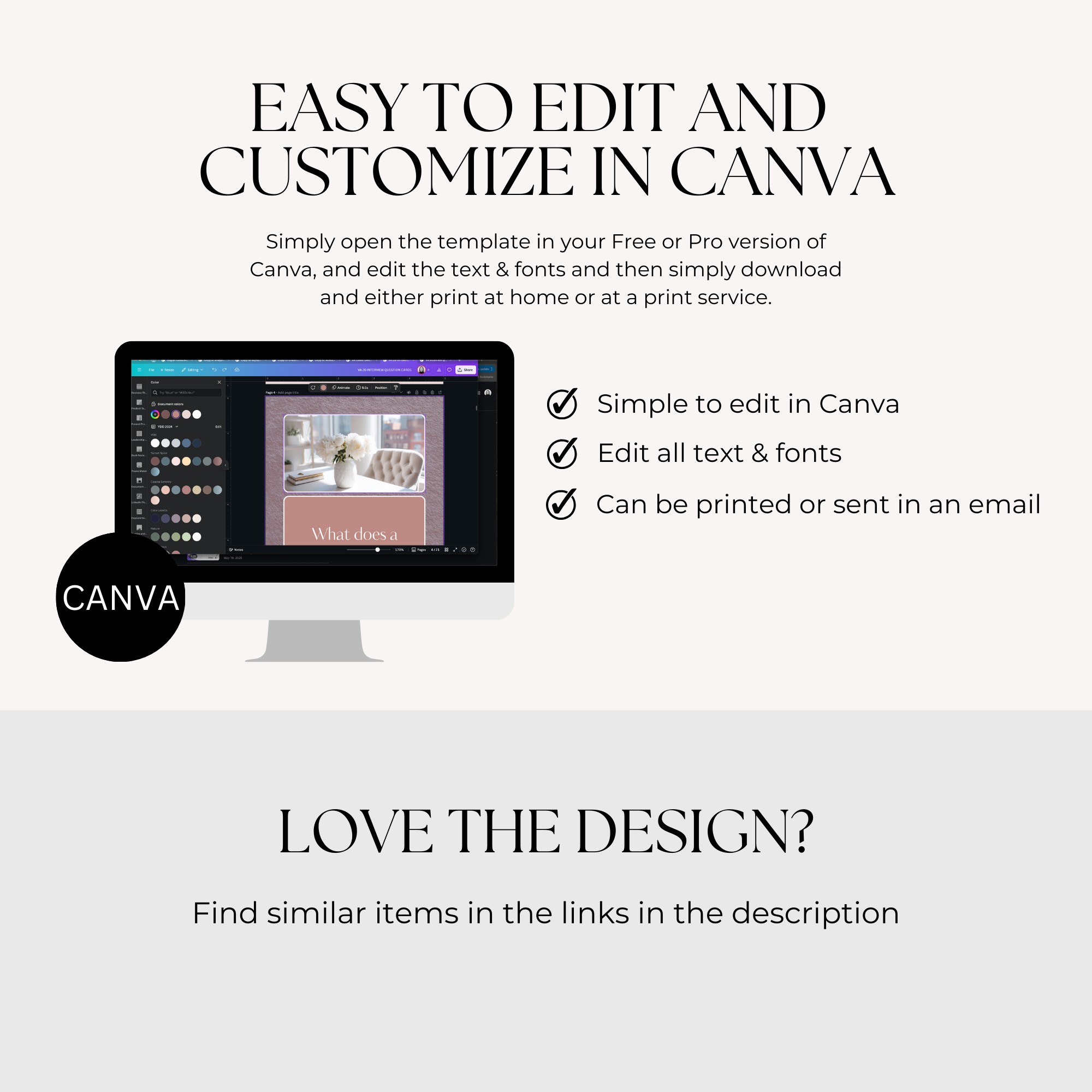 - Easy-to-use Canva template—customize colors, fonts, and wording