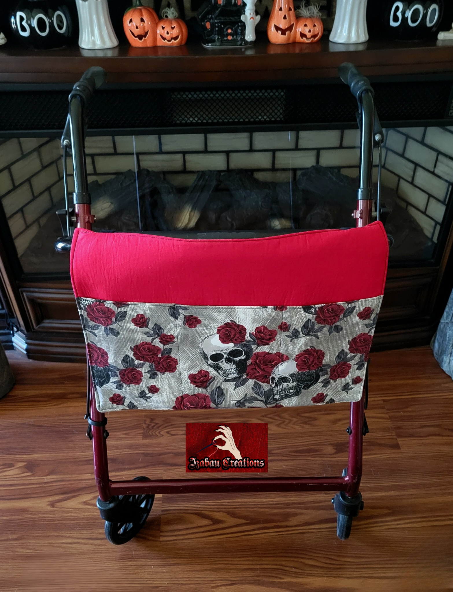 Perfect storage addition to your walker. Large three slip pockets with strong velcro loops to fit all sizes and styles of walkers. Spooky gothic skull and roses print.
