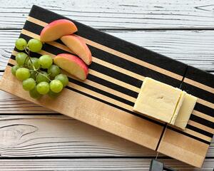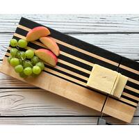 Introducing the perfect personal snack tray: our small charcuterie board! This stunning tray is crafted with a unique hombre pattern made from walnut and maple wood, giving it a fresh and stylish look. The tray measures 14x6x1" and comes complete with a built-in cheese slicer and four rubber nonslip feet. Not to mention it's completely handcrafted on our farm in central Kentucky, with lots of love and care! Have it PERSONALIZED to make extra special!!!