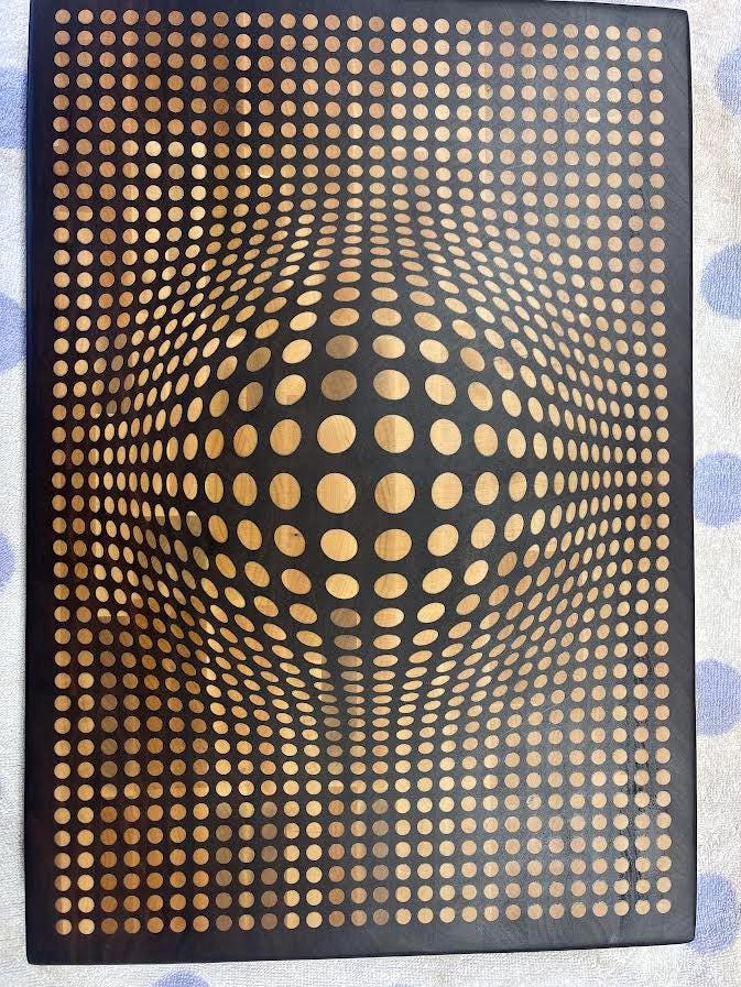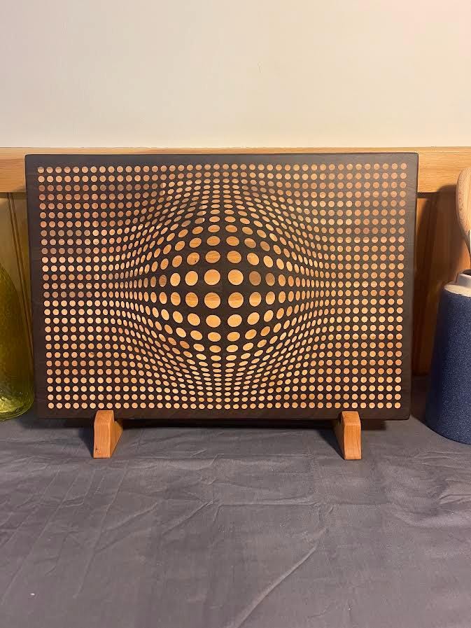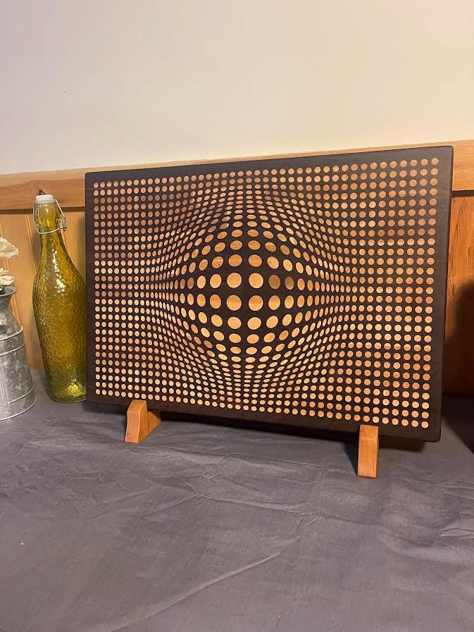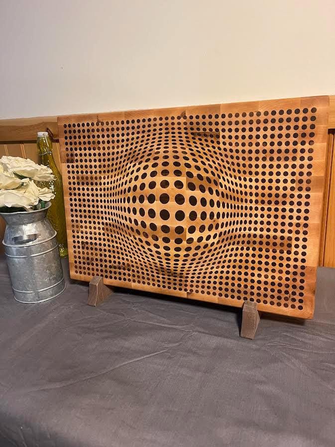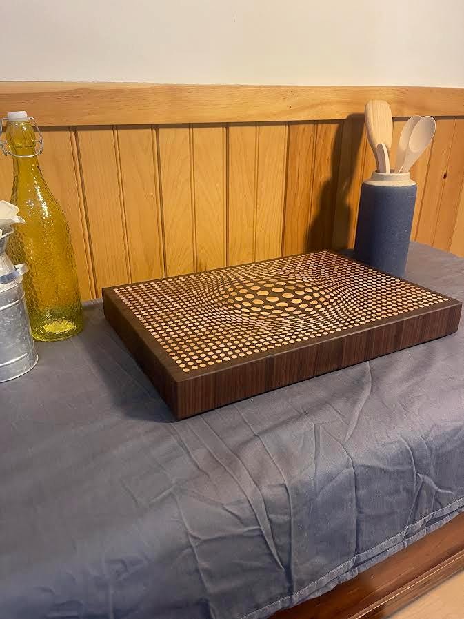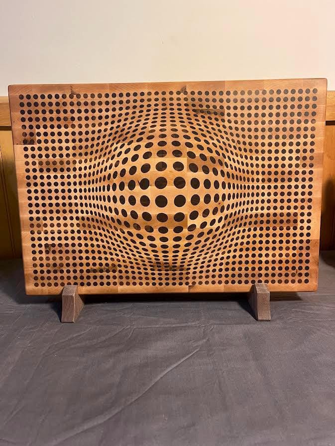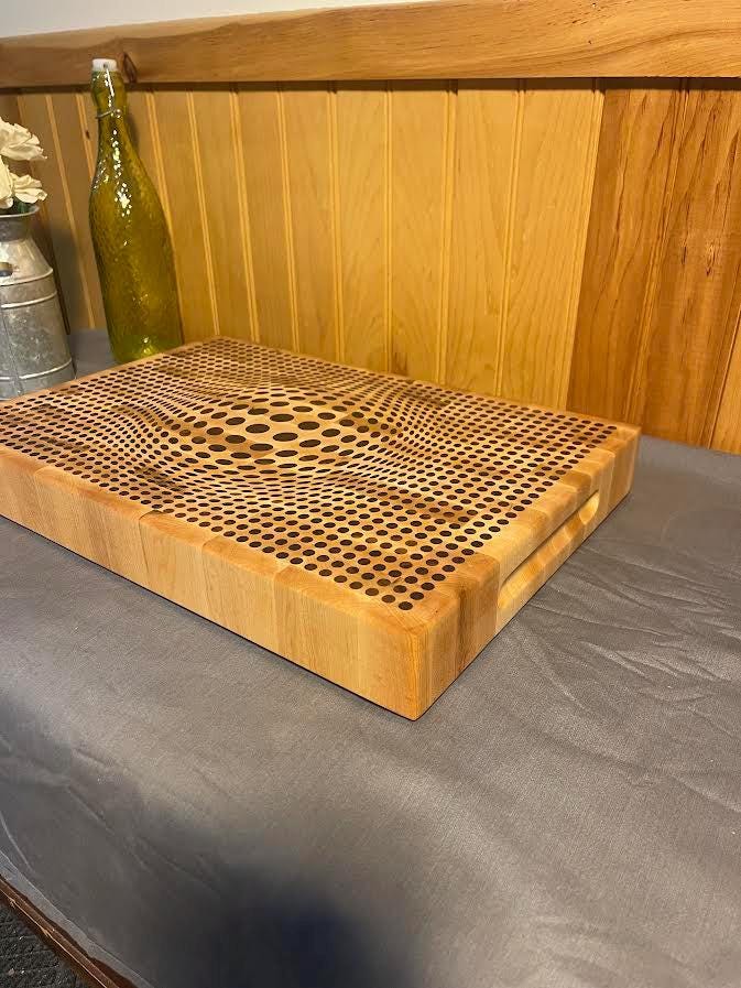 Walnut 3D Sphere cutting board with Maple inlay. Board is 18" Wide X 12.5" high X 2" thick and comes in either end grain Maple board with walnut inlay or walnut board with maple inlay. Each board comes with a walnut stand to insure proper storage when not in use. Each board is treated with cutting board oil and wax so its ready for use right out of the box. Board comes with rubber feet to limit movement while in use. Makes a beautiful addition to any kitchen and makes a great gift for any occasion!