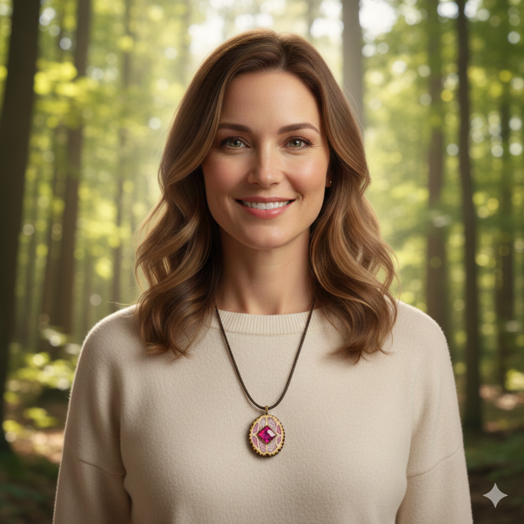 This striking handcrafted pendant features a vibrant fuchsia crushed glass centerpiece, set within a unique, walnut shell frame. The central resin piece is surrounded by a glittering, iridescent border of light Pink Cosmos dichroic flakes that catch the light beautifully. The same fuchsia crushed glass around the edge of the circular frame adds an elegant touch.